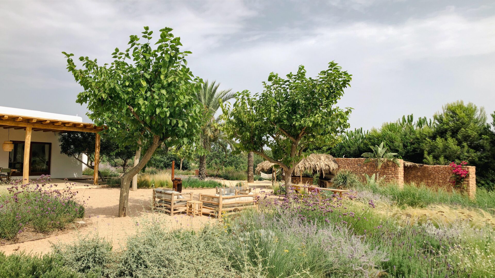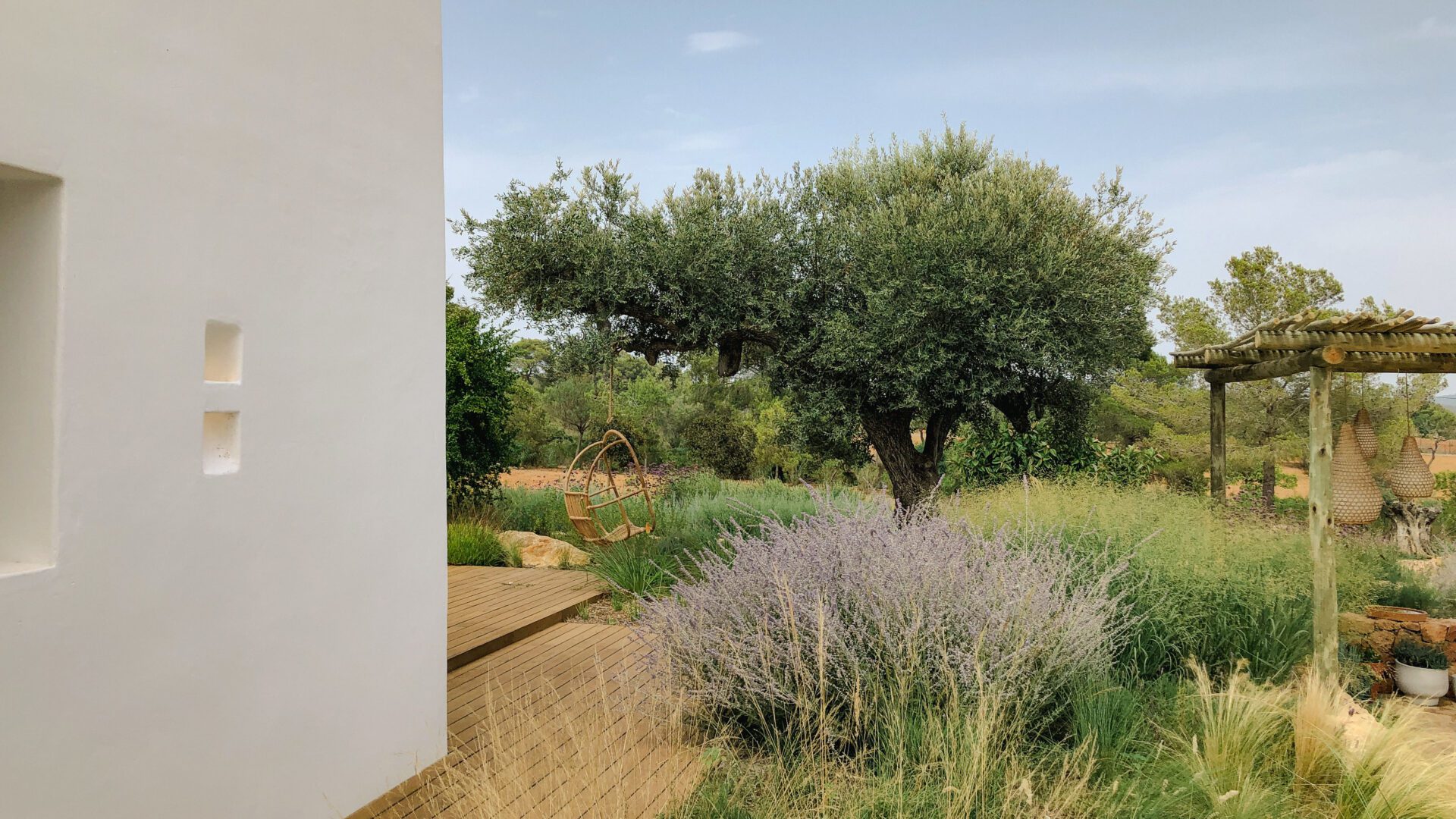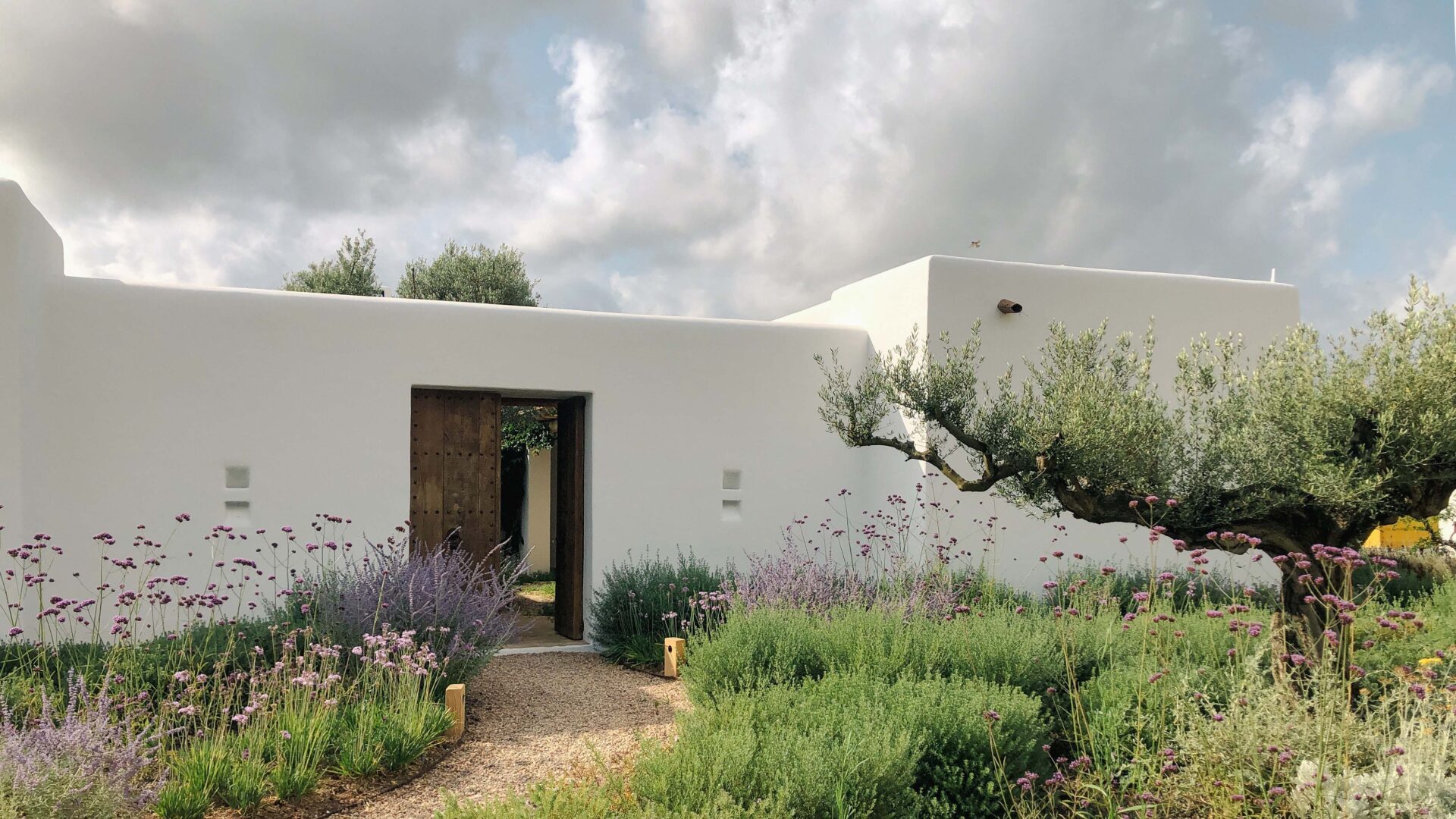 The garden, like the architecture of the house, draws inspiration from the traditional Ibicenco landscape, employing natural island materials and a Mediterranean plant palette—including olive, carob, and pomegranate trees. The structural foundation is formed by evergreen shrubs, while herbaceous plantings introduce changing colors and scents that evolve with the seasons.