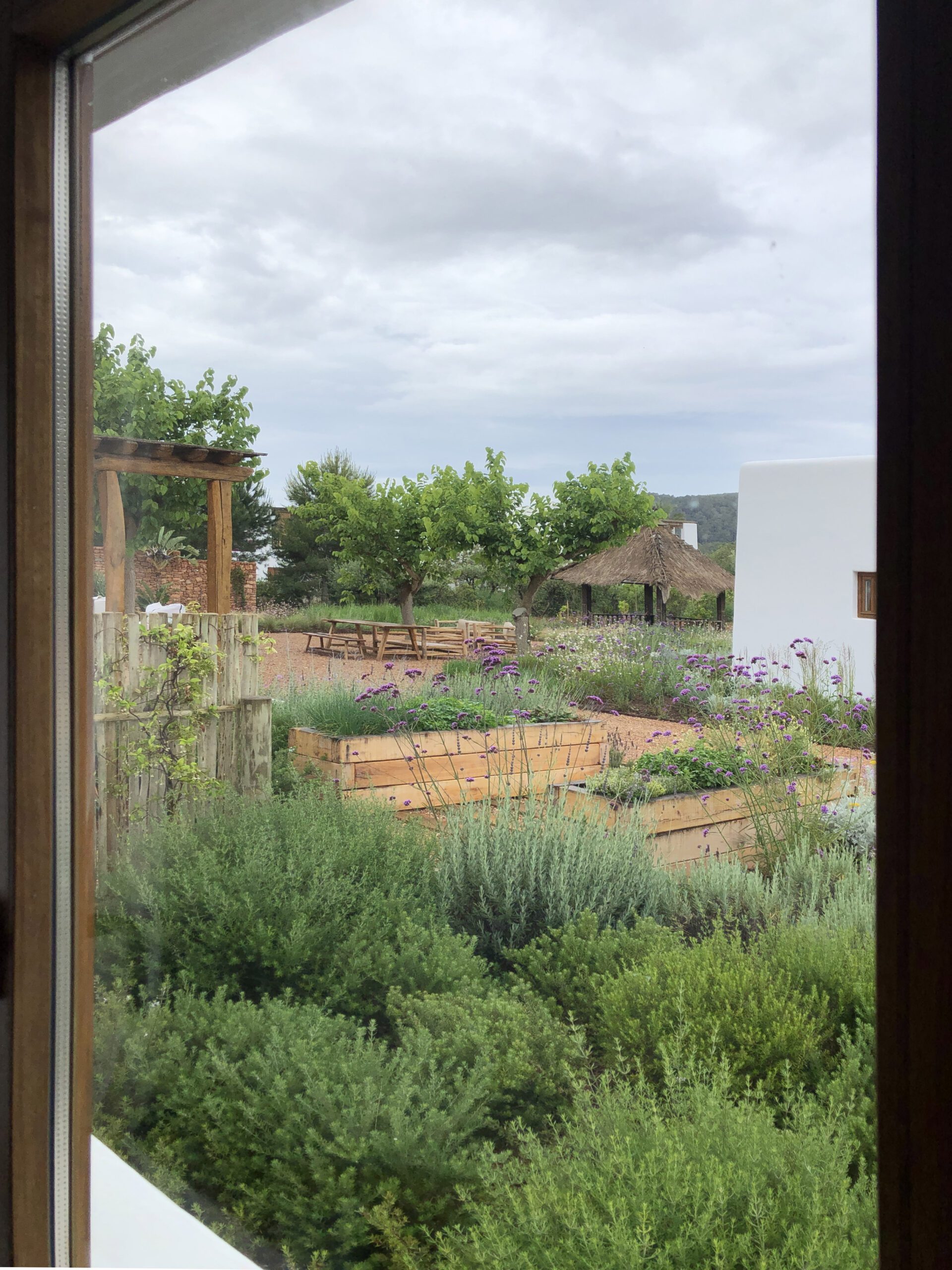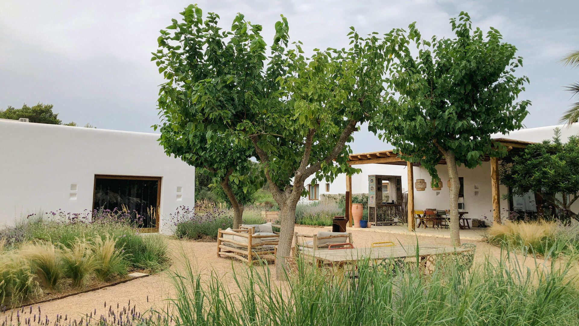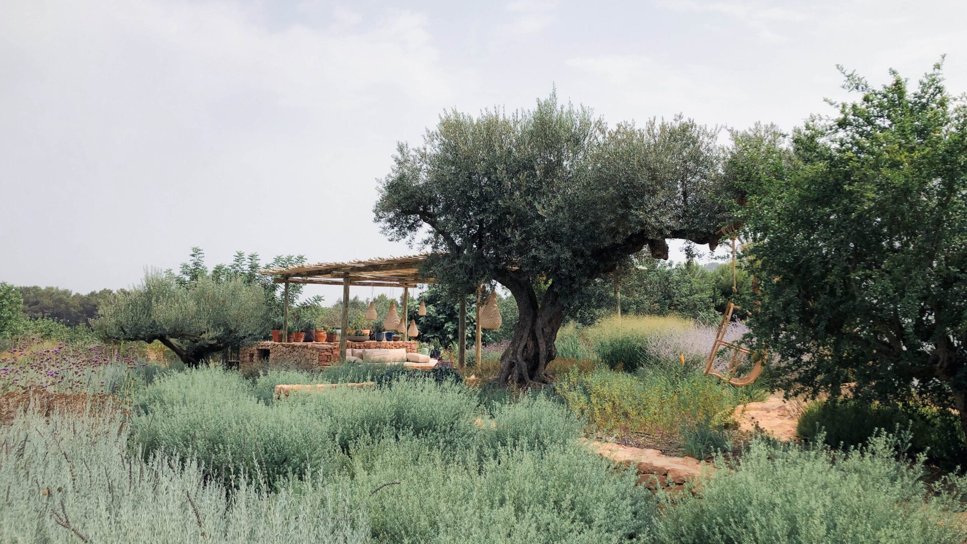 The garden, like the architecture of the house, draws inspiration from the traditional Ibicenco landscape, employing natural island materials and a Mediterranean plant palette—including olive, carob, and pomegranate trees. The structural foundation is formed by evergreen shrubs, while herbaceous plantings introduce changing colors and scents that evolve with the seasons.