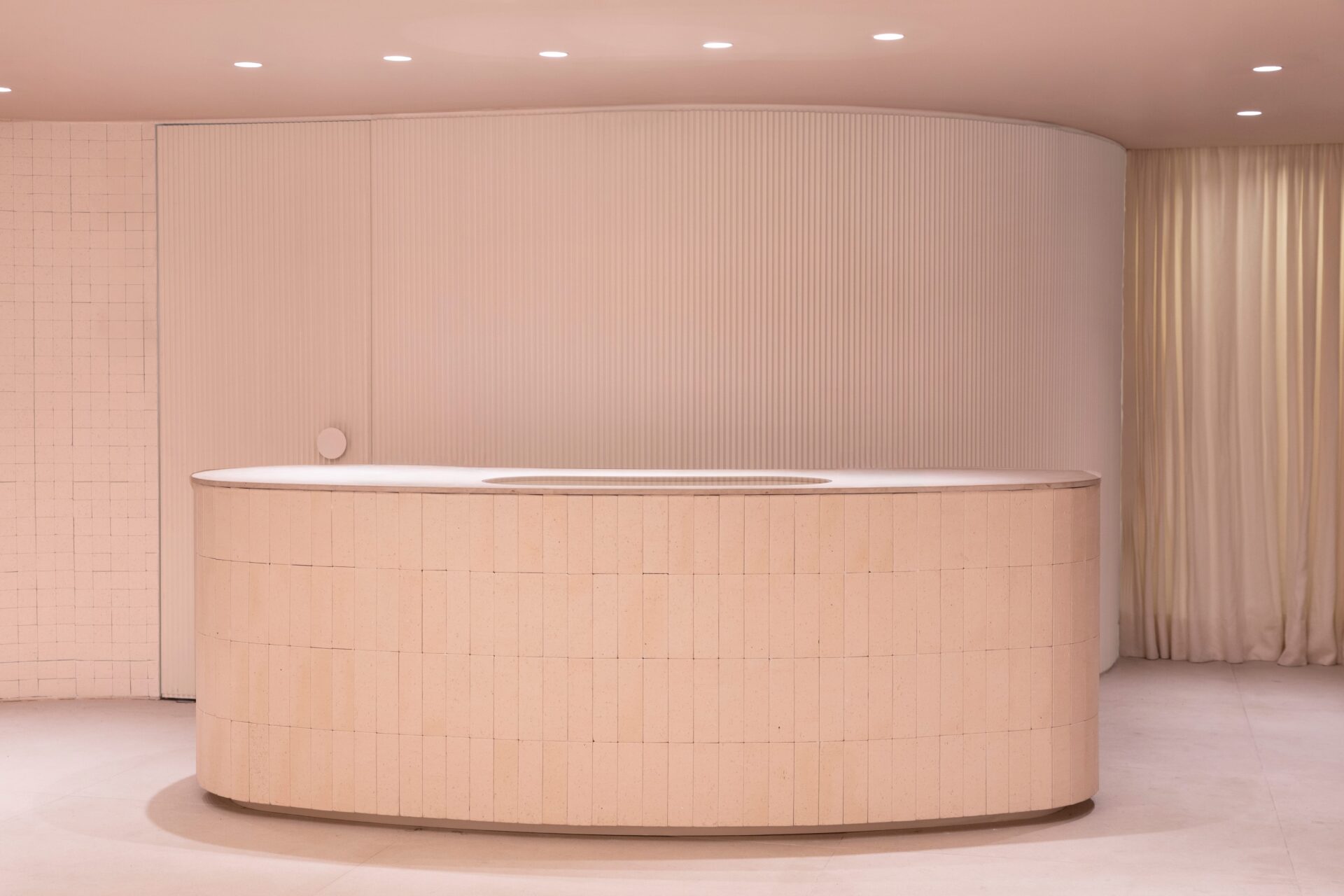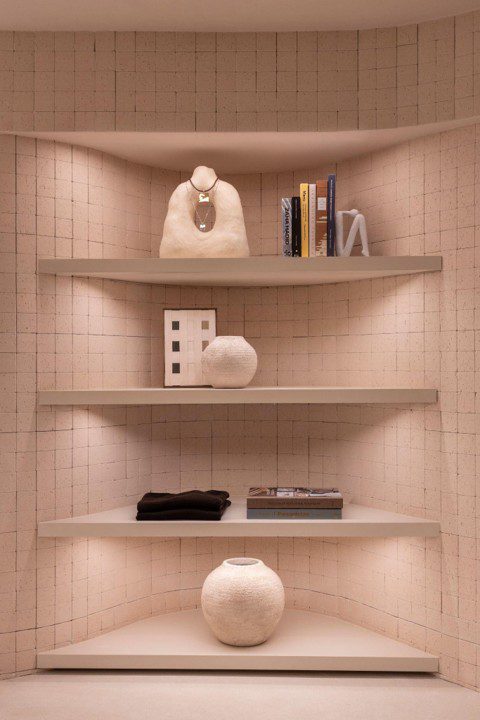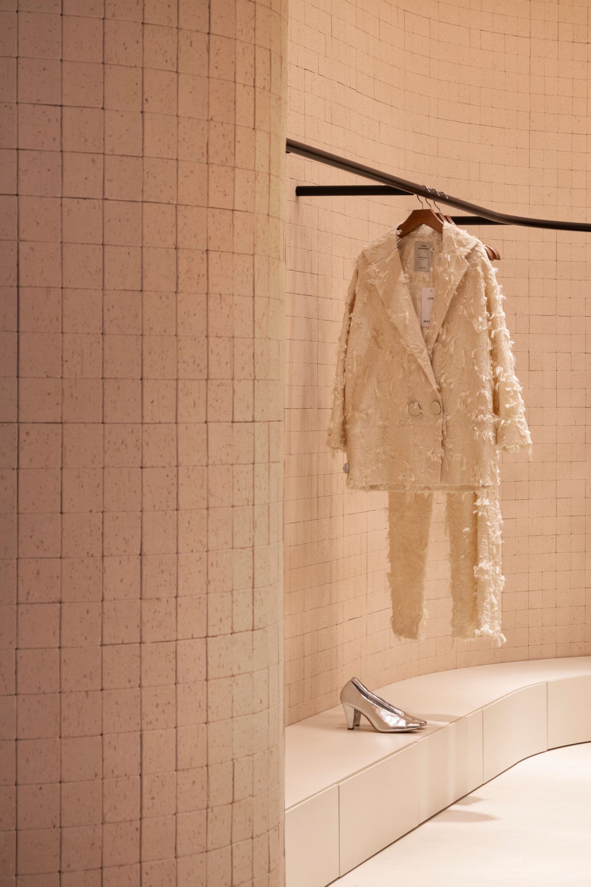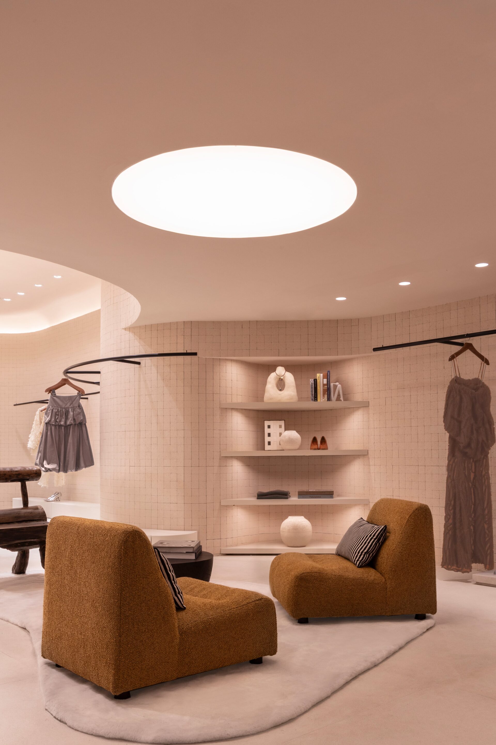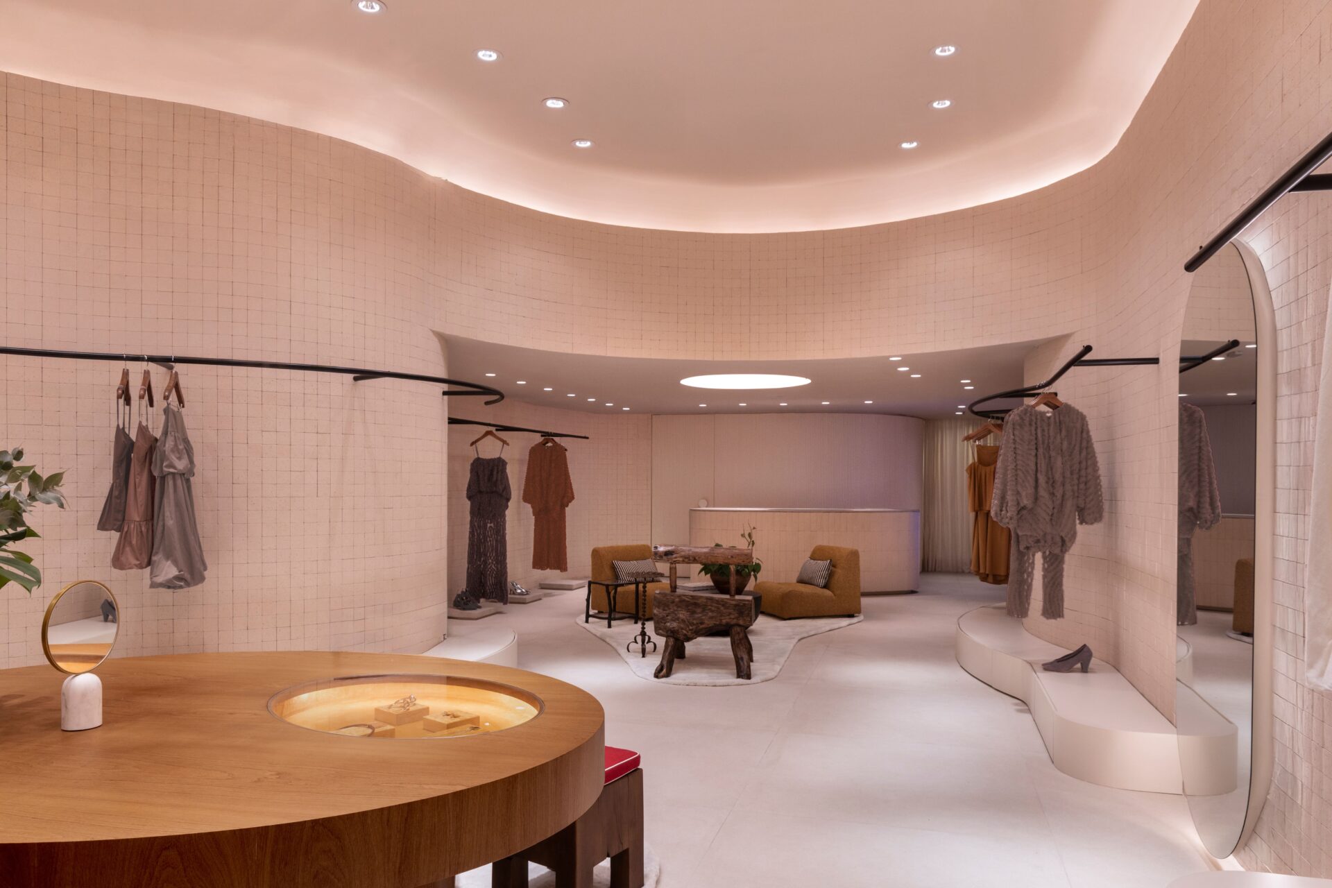 One of the most technically demanding aspects of the project was the execution of the curved walls. These continuous, sculptural surfaces required both 3D digital modelling and traditional handcraft. Advanced fabrication technologies such as CNC milling and laser cutting were used to achieve structural precision while maintaining the softness and fluidity of form. These curves extend into custom rugs and garment racks, reinforcing the sense of cohesion throughout the space.