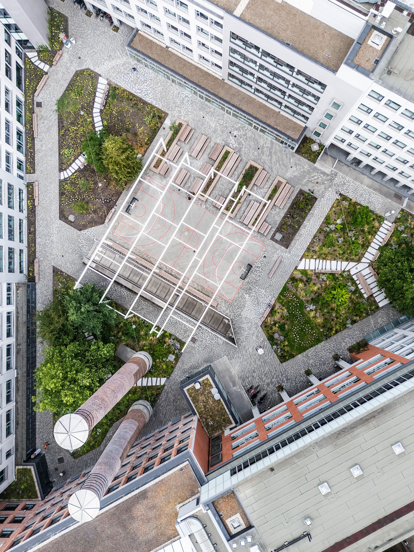 The existing basketball court and the soccer field will be merged into a fully-fledged multi-sports field and incorporated next to the entrance to the underground bicycle parking. This area, under the pergola, is also the paved event zone for the neighbourhood.