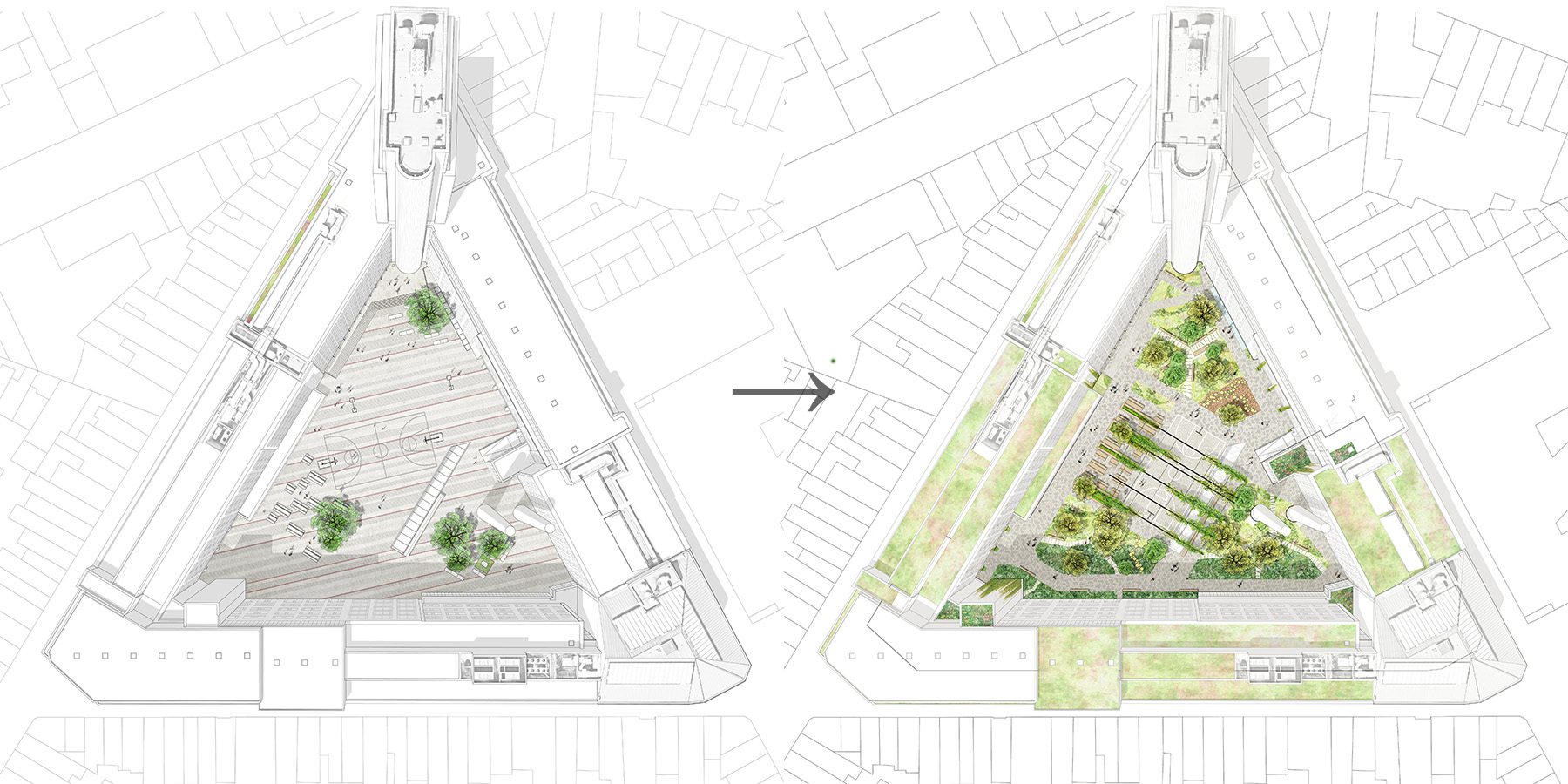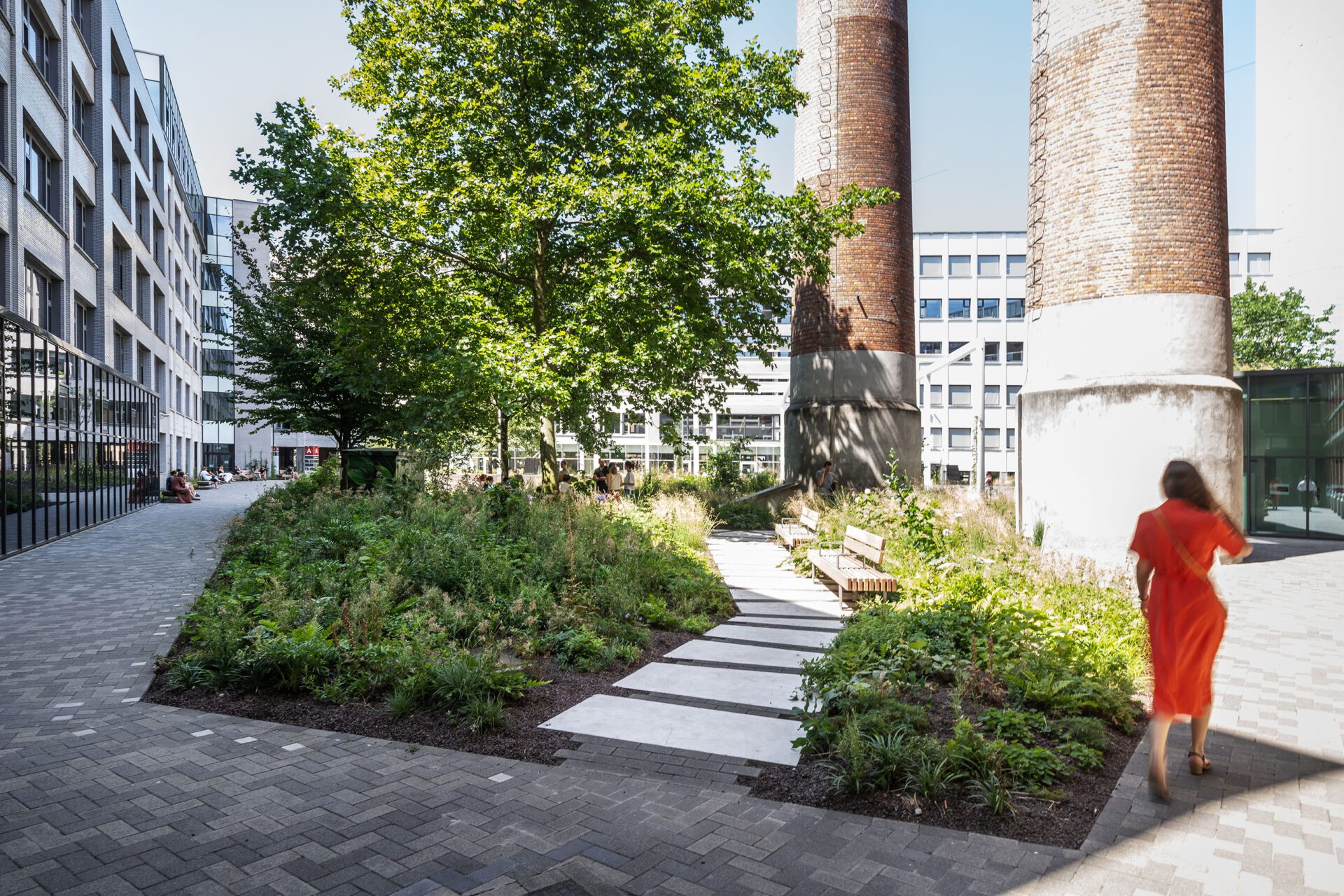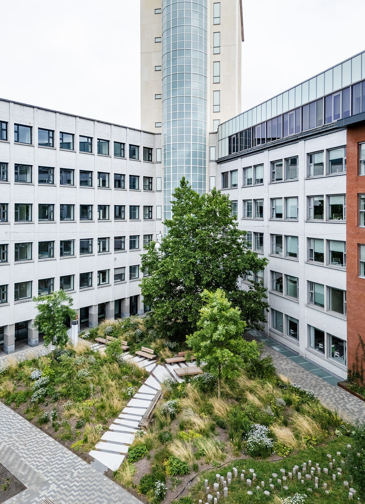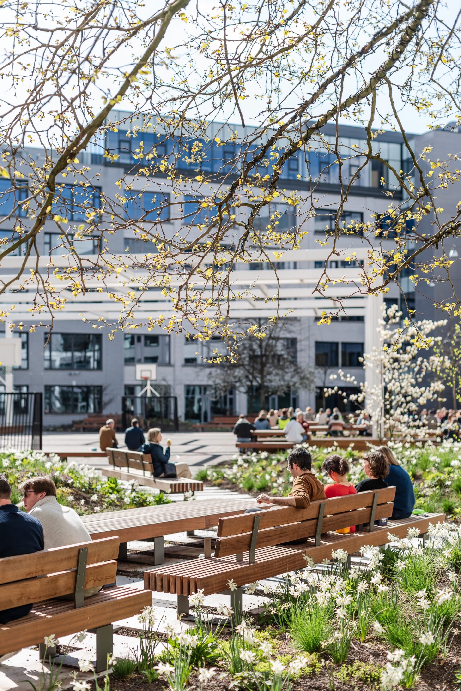 The design transformed the triangular central courtyard into a green urban oasis. As much as 31% of greenery is added and hard surface on the underground car park depaved. It created space for nature and biodiversity and increases the quality of life. In addition, new trees (7), shrubs (28), perennials (25.000), bulbous and tuber plants (80.000) and climbing plants (235) are added. A seven-meter-high pergola, overgrown with climbers, provides shade. Thanks to the tree slabs between the plants, you can experience the new nature in a playful way. Also, the tree trunk posts at different heights can be used for hopping, playing or sitting on.