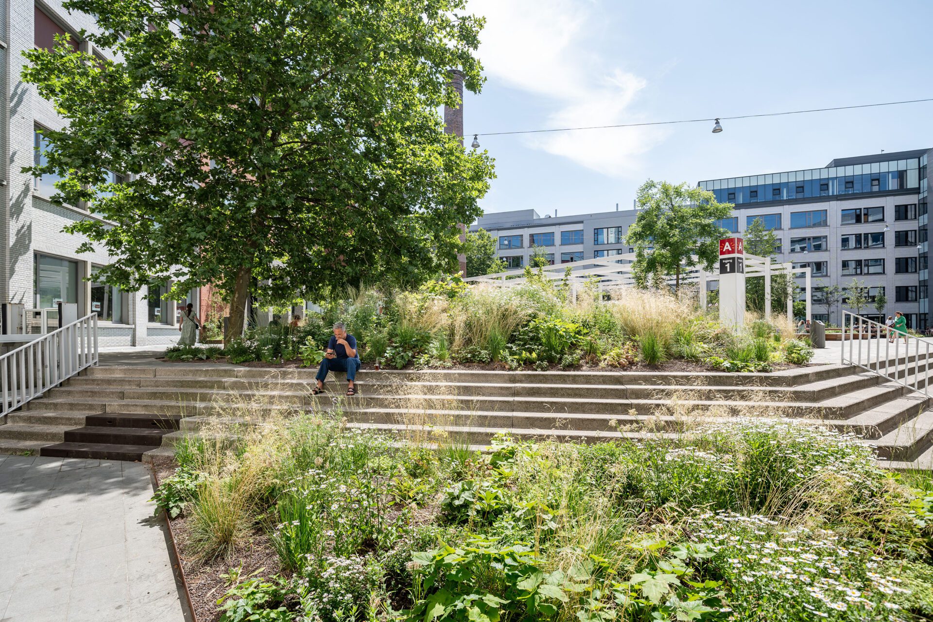 Also, the roofs of the buildings became greener. The highest roofs has 2,767 m² of green roof with low-maintenance succulents, drought-loving herbs and grasses. 141 m² of natural roof supports biodiversity with as many native plants as possible. These green roofs provide cooling during the summer months and help collect rainwater. From within the building, you overlook the natural roofs.