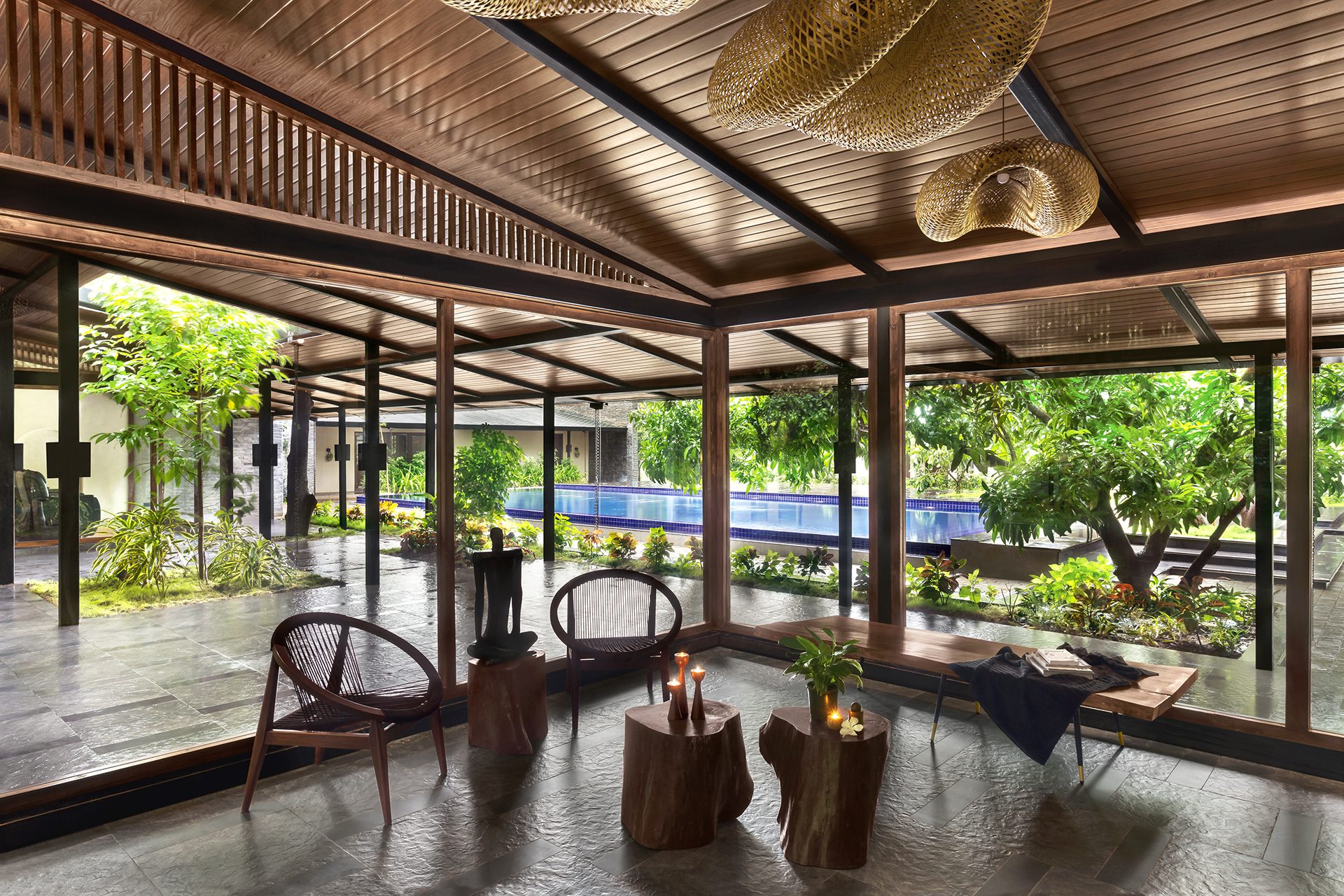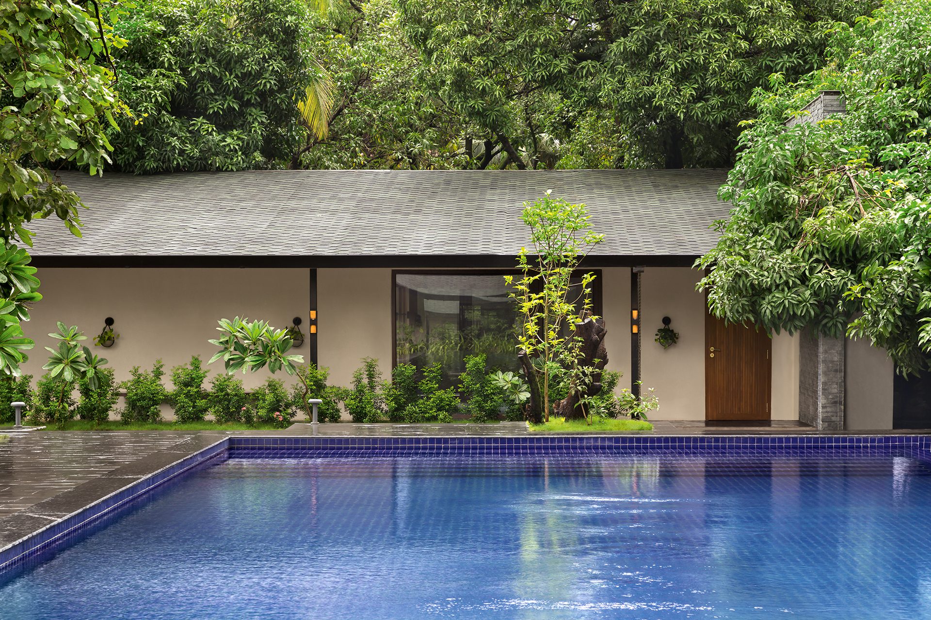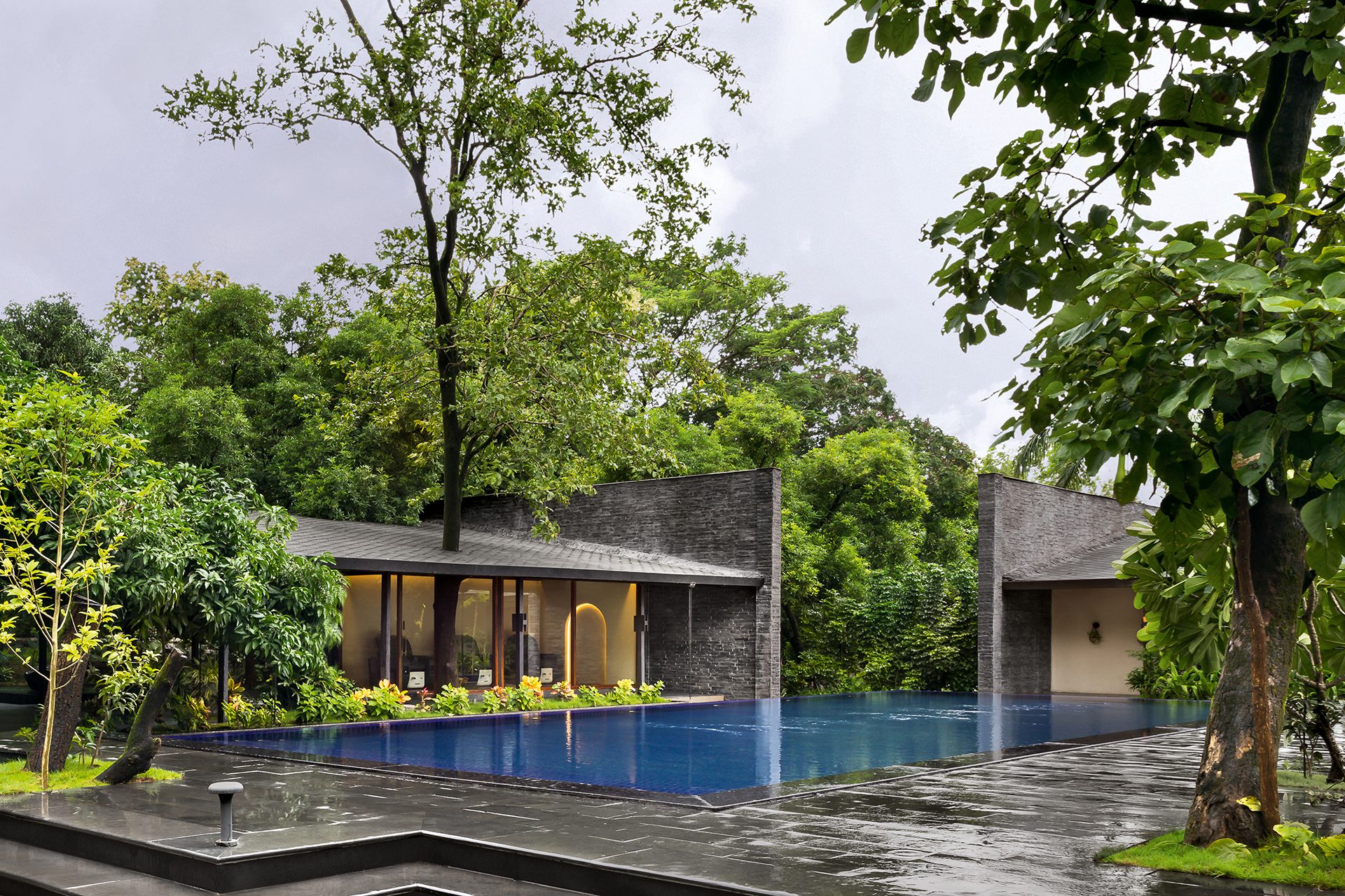 The two smaller wings on either side of the swimming pool house the men’s and women’s changing rooms with independent sauna and steam rooms attached. The other, parallel to the entrance wing, houses the single and couple spa treatment rooms. All these internal spaces accommodate smaller outdoor green courts and open-to-sky shower areas that supplement as independent meditative zones, continuing to blur the divide between the indoors and the outdoors - kindling further the man-nature relationship.