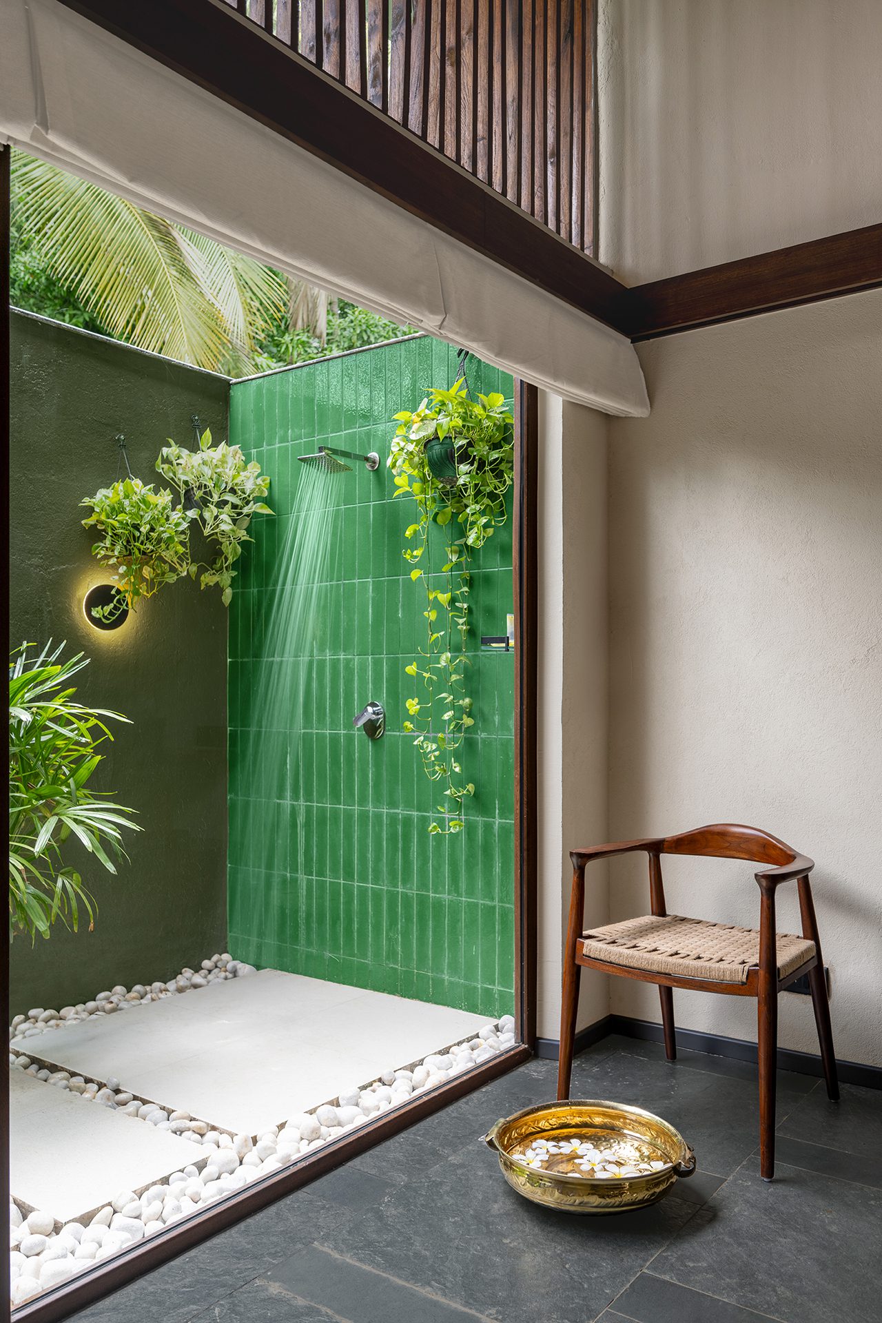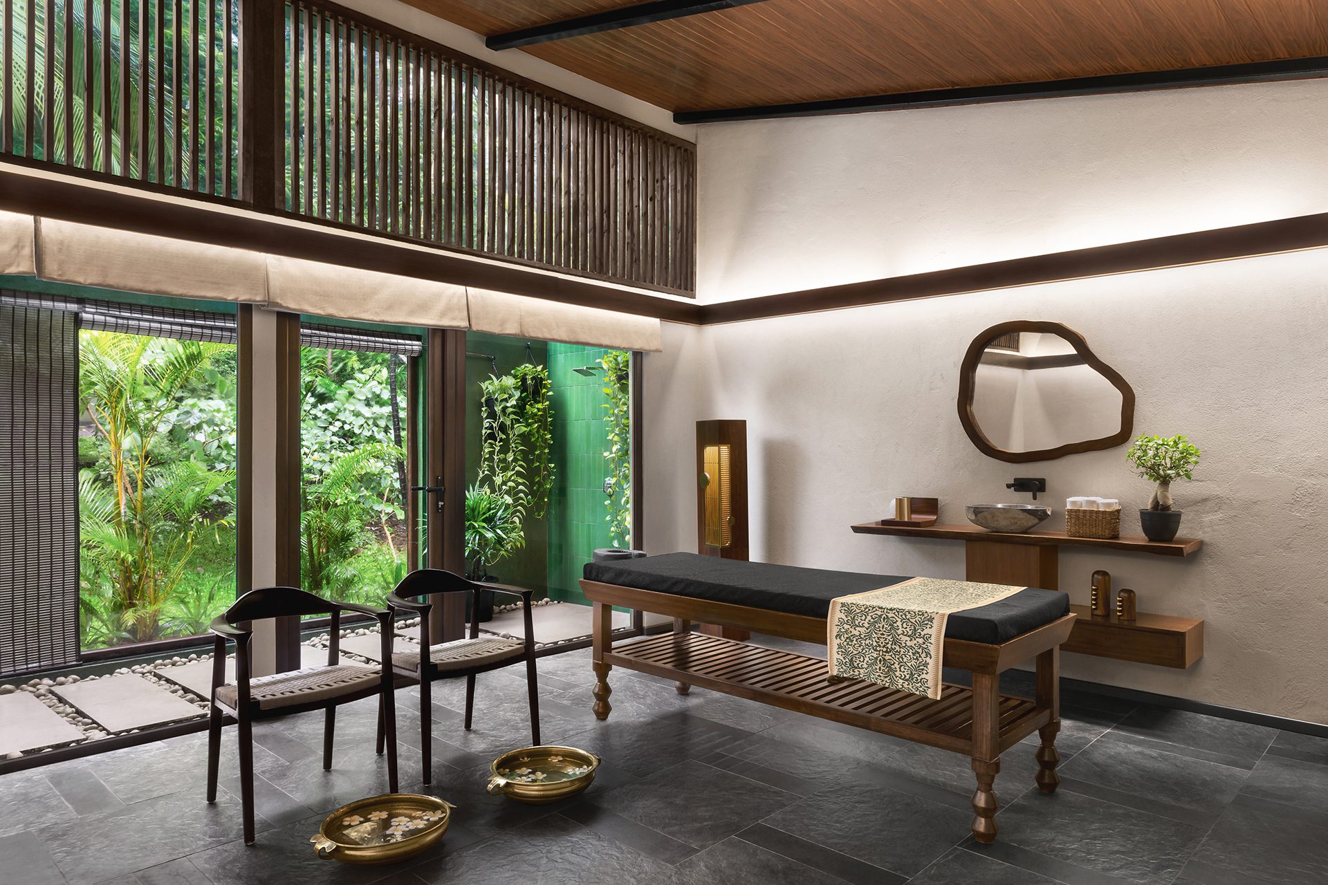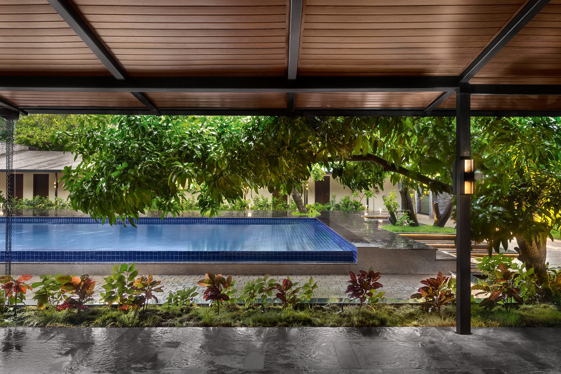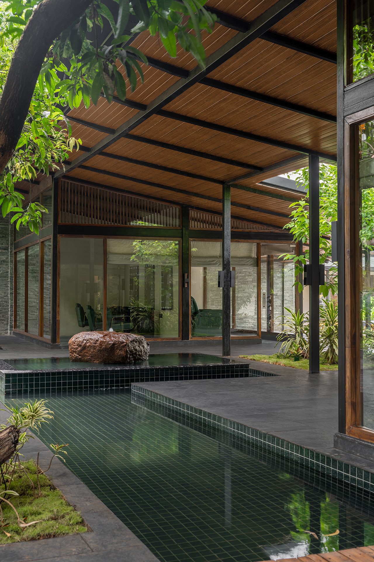 The two smaller wings on either side of the swimming pool house the men’s and women’s changing rooms with independent sauna and steam rooms attached. The other, parallel to the entrance wing, houses the single and couple spa treatment rooms. All these internal spaces accommodate smaller outdoor green courts and open-to-sky shower areas that supplement as independent meditative zones, continuing to blur the divide between the indoors and the outdoors - kindling further the man-nature relationship.