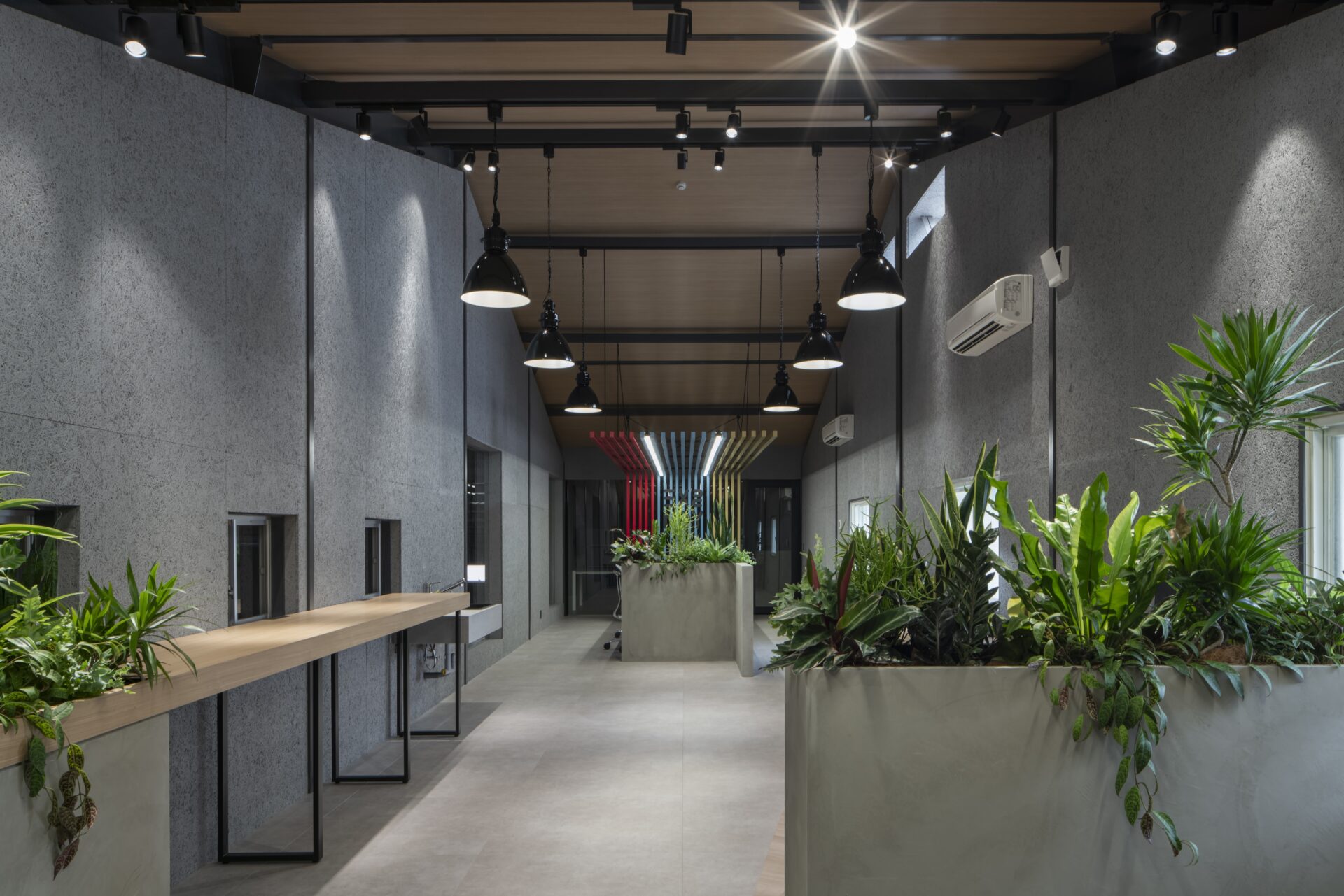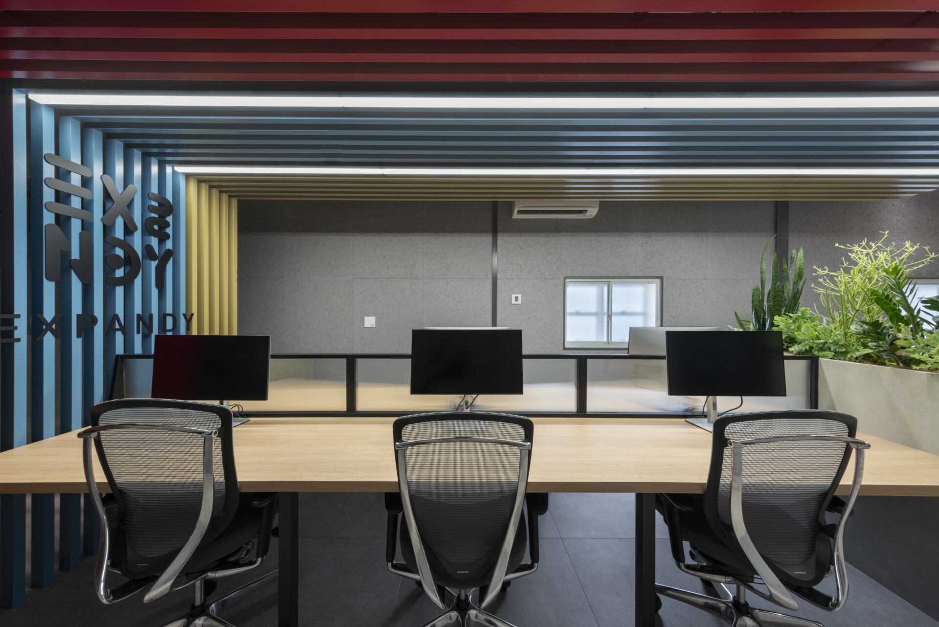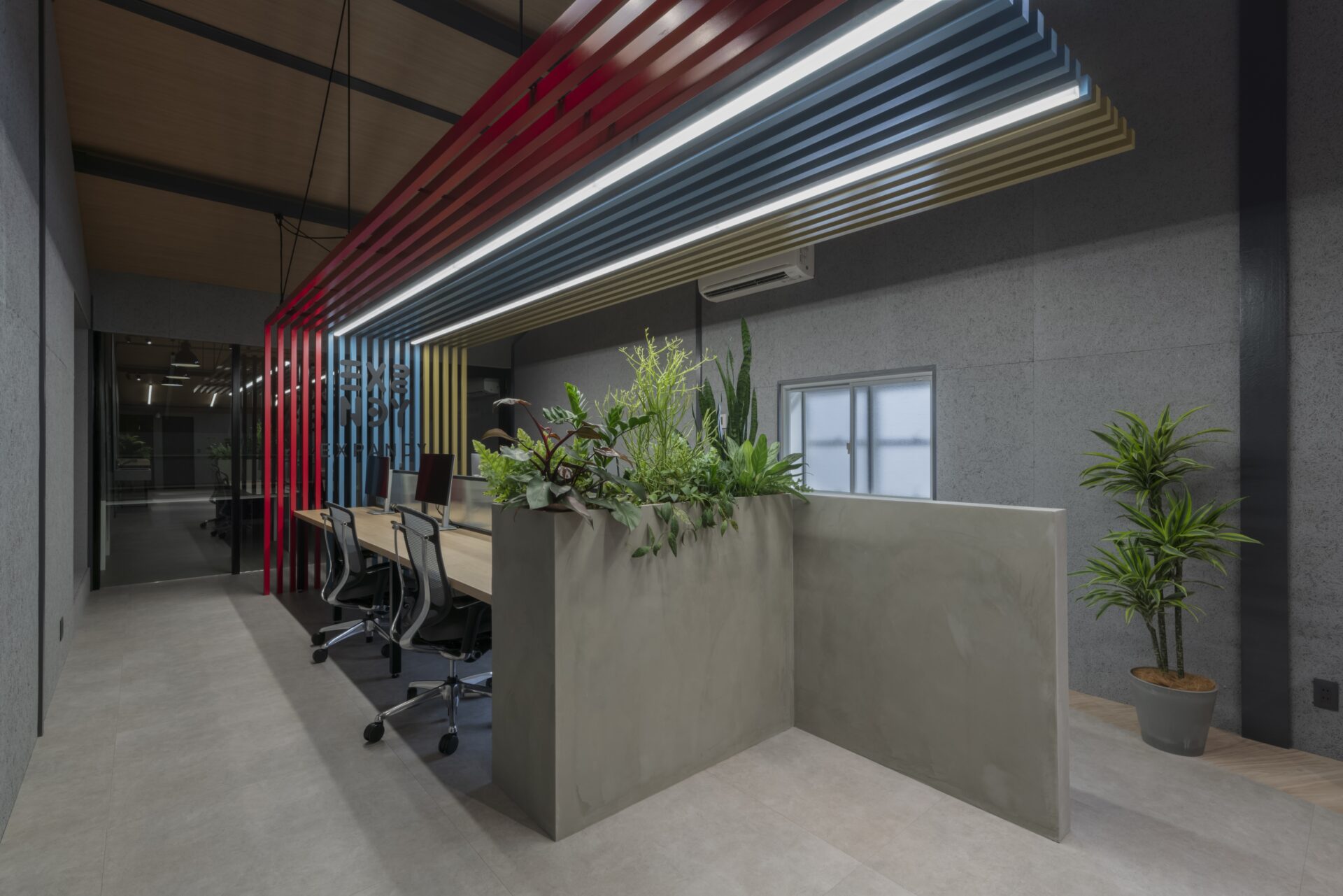 To reduce the overly inorganic feel, a louvered ceiling in the client's three corporate colors and colorful potted plants were placed to add color to the inorganic space, resulting in a design befitting an office space.
