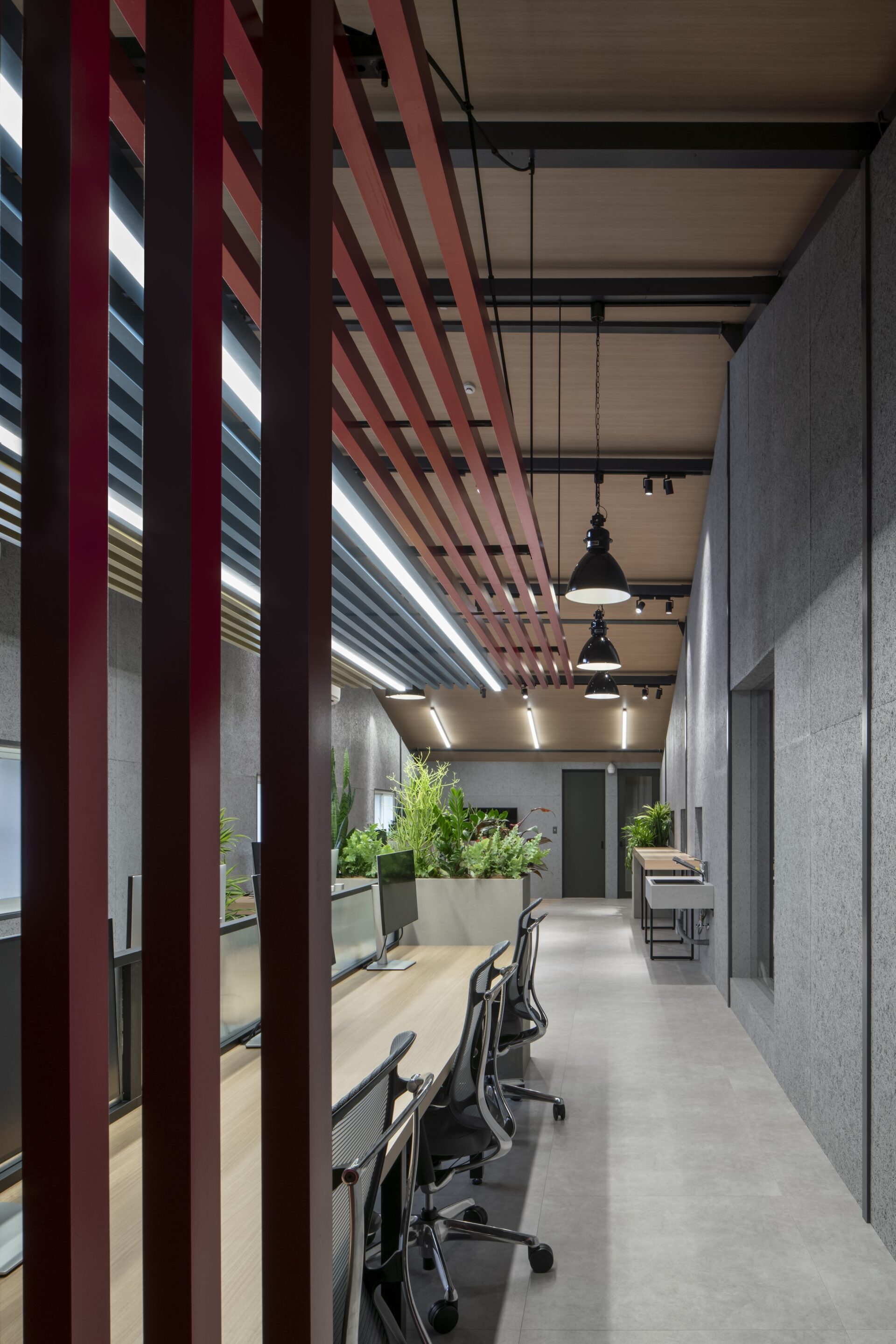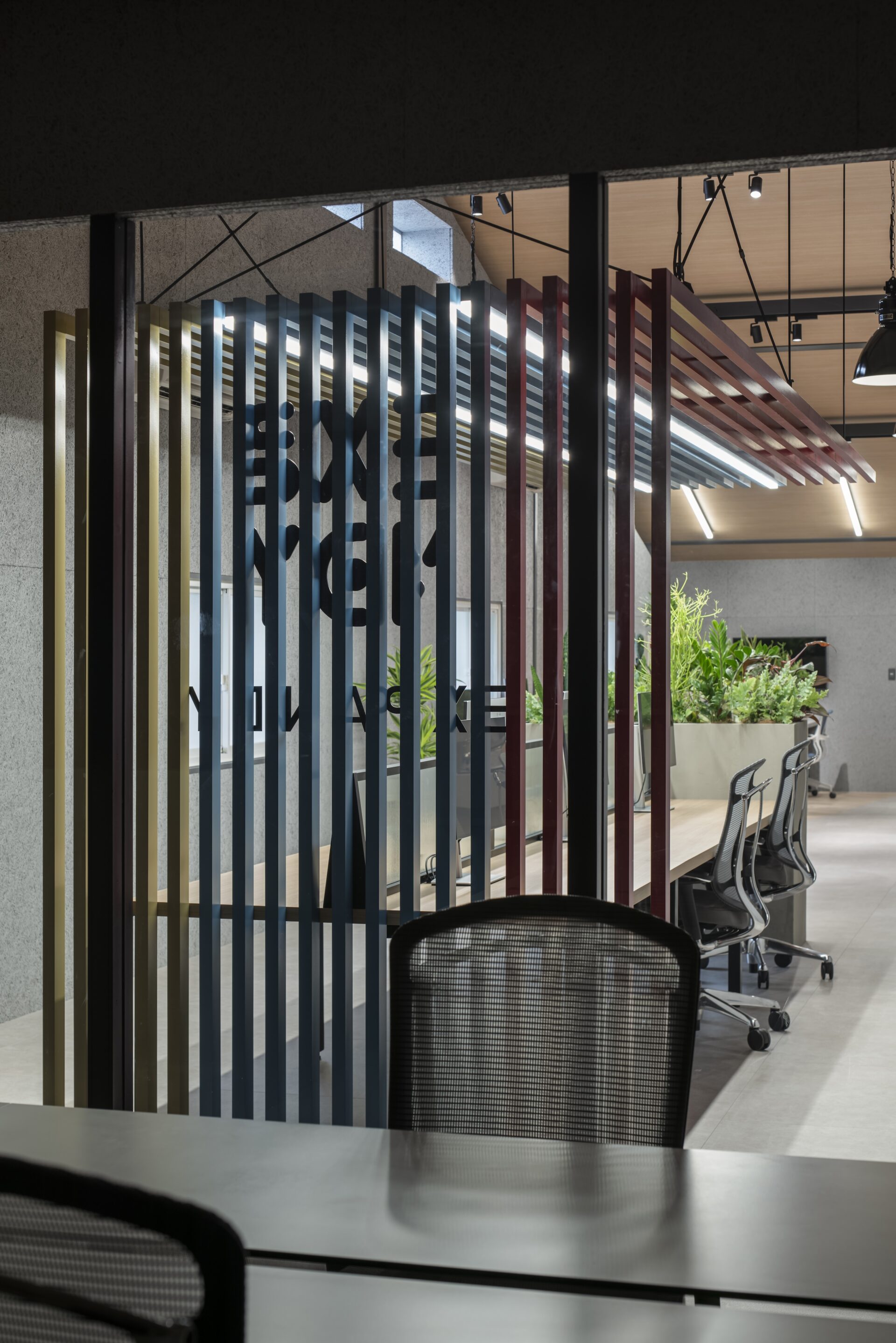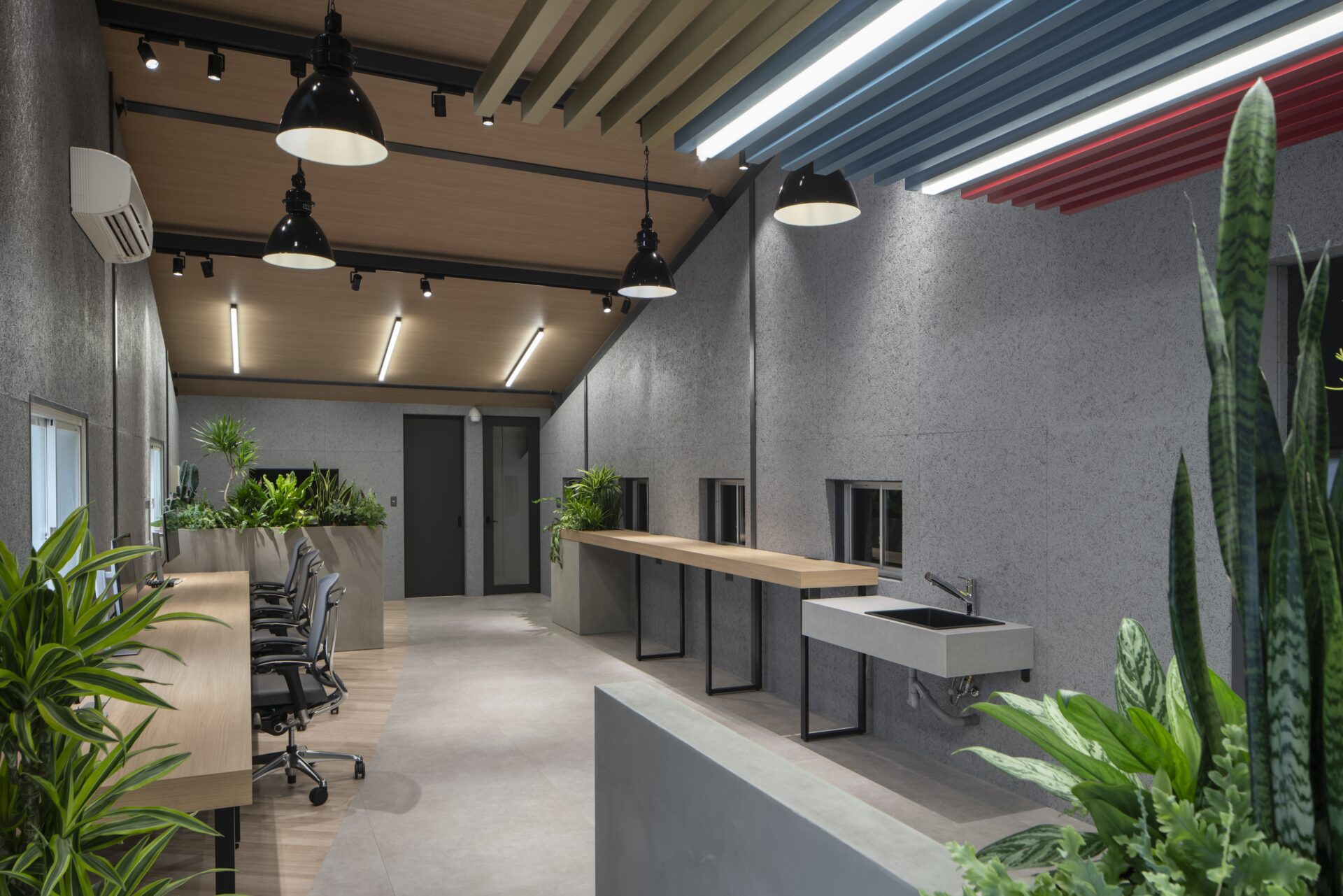 To reduce the overly inorganic feel, a louvered ceiling in the client's three corporate colors and colorful potted plants were placed to add color to the inorganic space, resulting in a design befitting an office space.