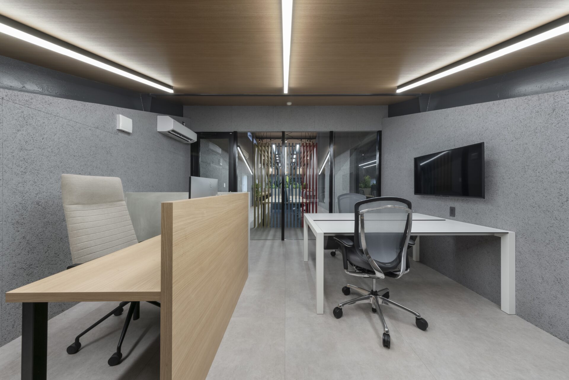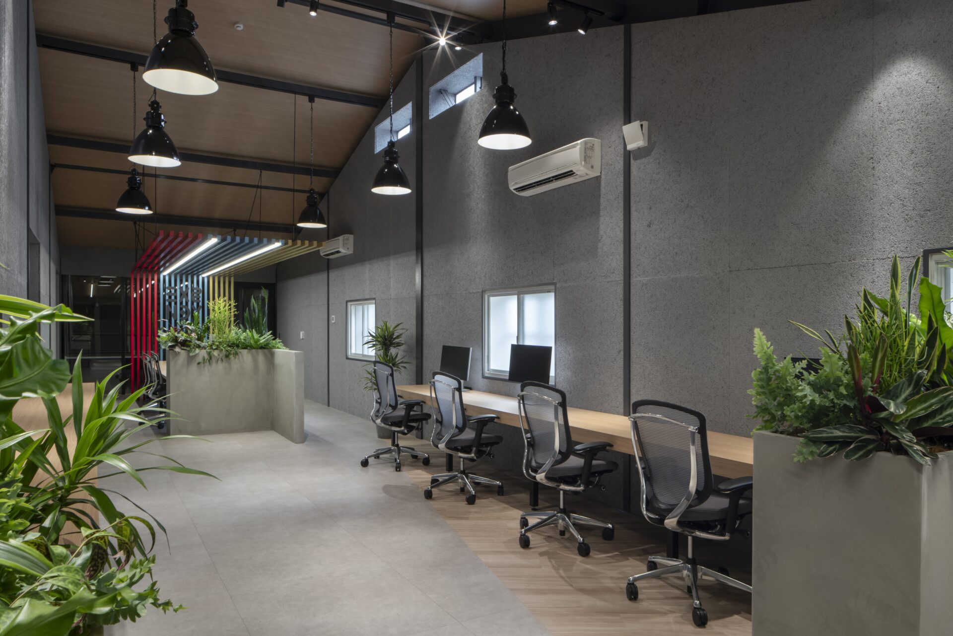 This office is for a company that exports Japanese products to countries around the world. It is located on the second floor of a vast logistics warehouse. The interior design theme is a rough, dynamic, and inorganic monotone space reminiscent of old warehouses in Europe and America. The Spanish owner and Japanese designer combined their respective sensibilities and finalized the design after numerous discussions.