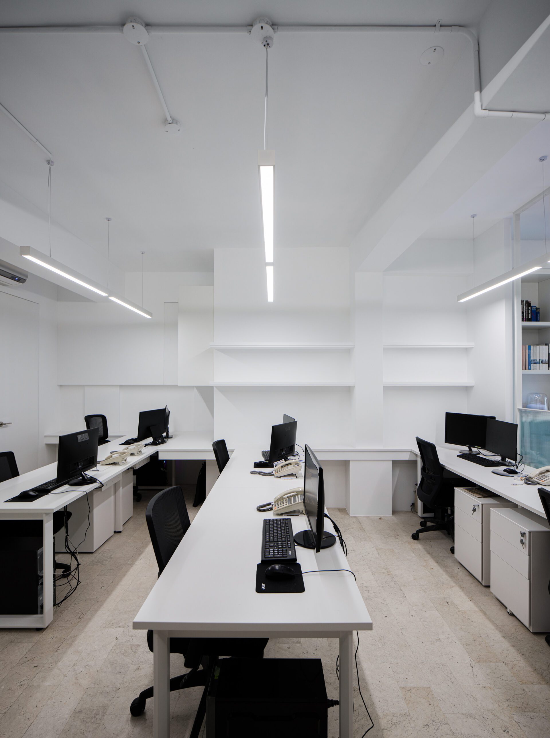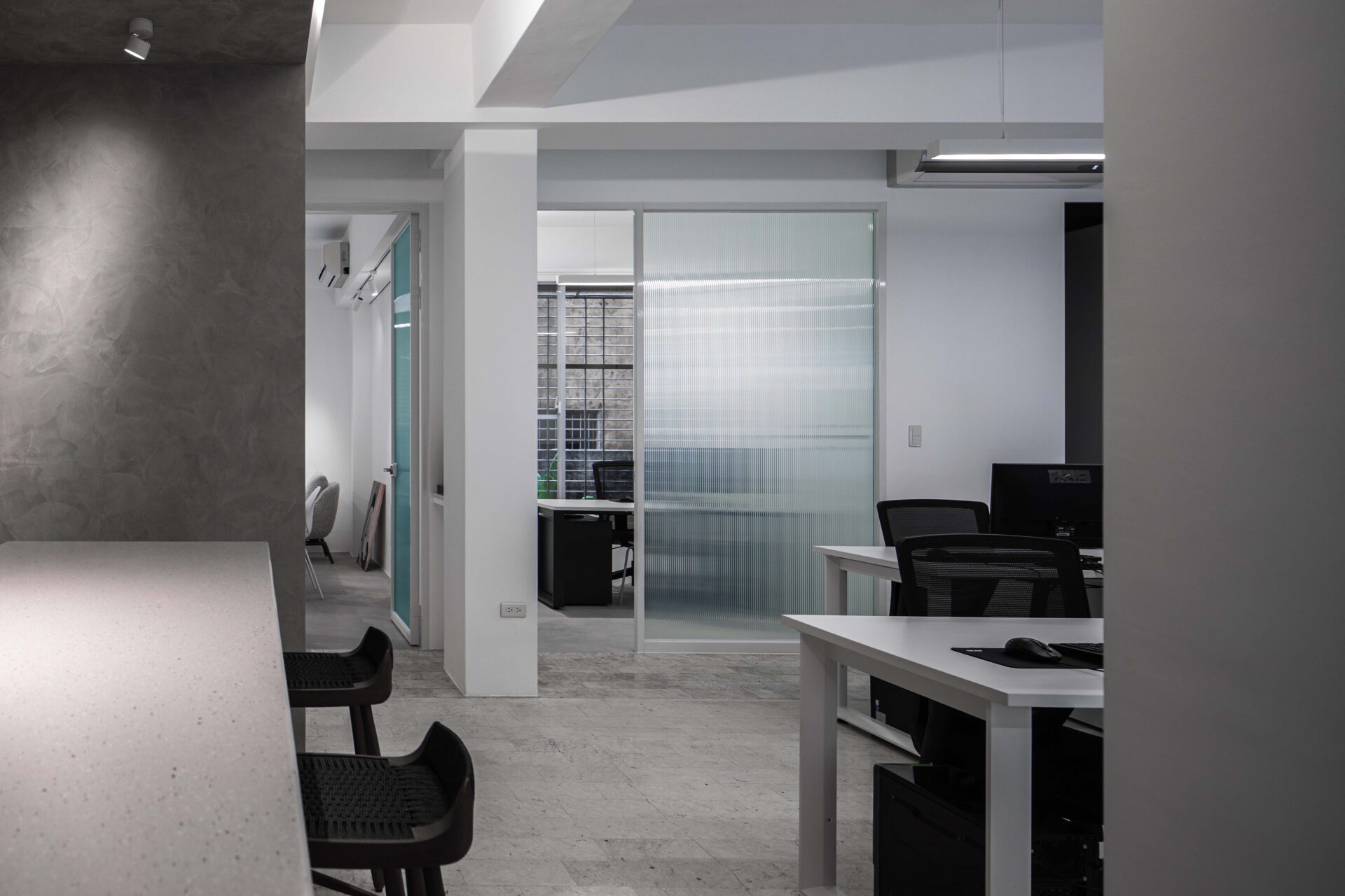 At the entrance, rippled glass within a metal framework separates the reception area from the working area, defining boundaries that extend and open up the space. The floors are the original beige marble framed with concrete to delineate spatial attributes.