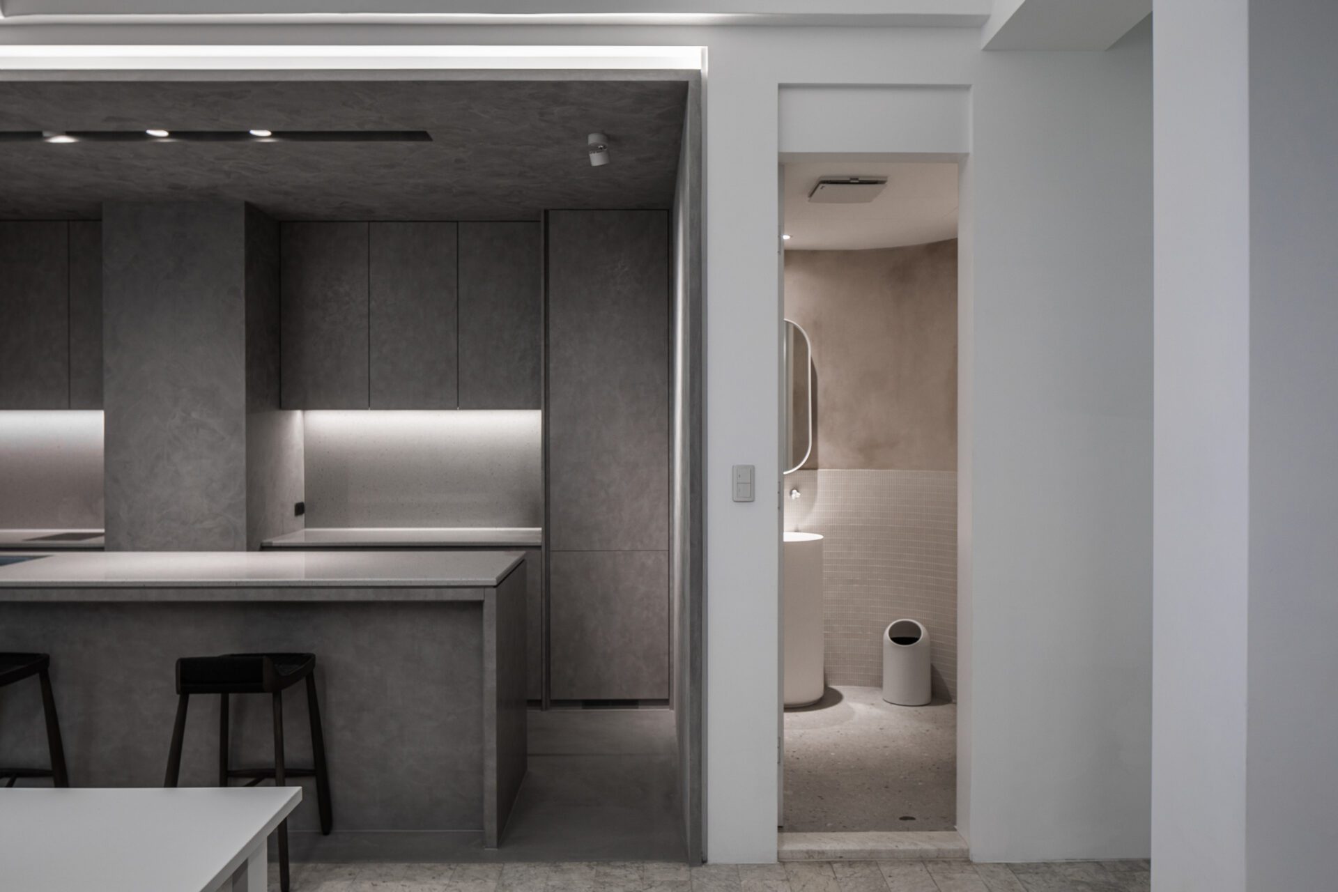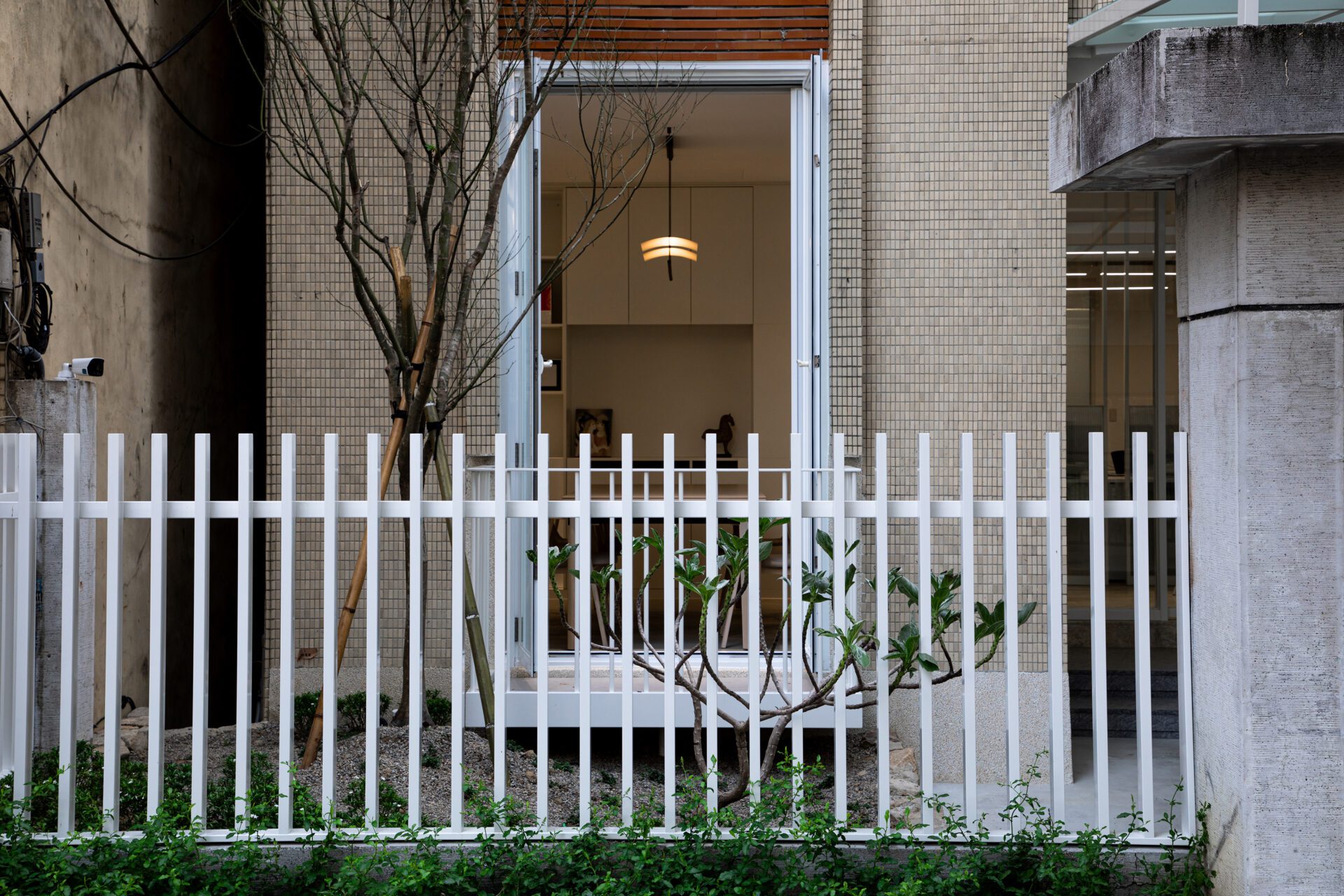 The interior is dominated by a white color scheme, complemented by gray paint and beige mosaic tiles and stone materials, giving the rooms a sense of harmony. Windowsills have been lowered to expand a view of the front and back gardens, bringing the outdoor plants closer to create a relaxing and stress-relieving office space.