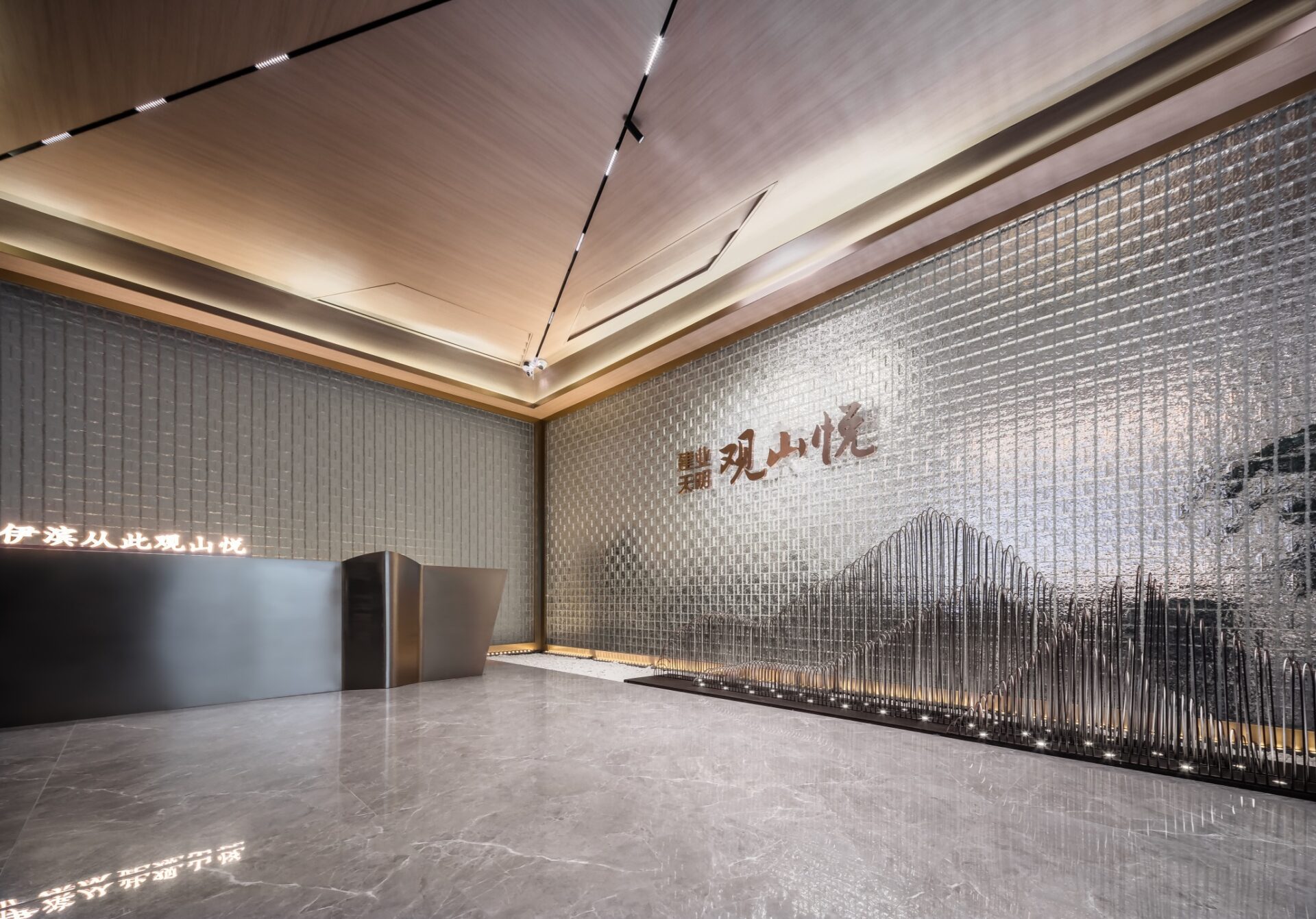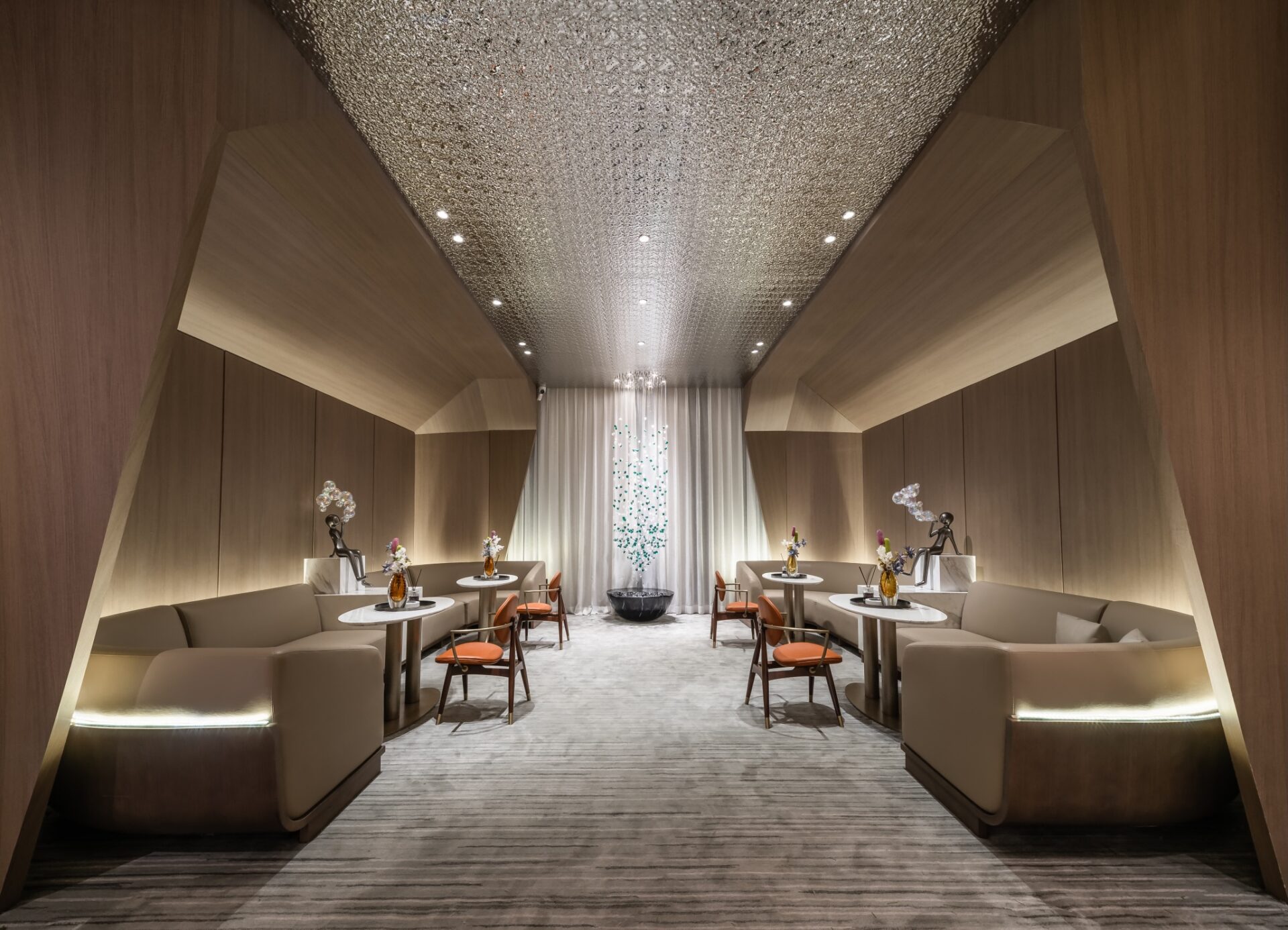 The reception area masterfully combines stone, wood, metal, and glass, creating a harmonious space that balances strength and softness while exuding refined elegance. The sand table area, characterized by soaring ceilings and multifaceted structures, evokes the magnificent grandeur of towering mountains. Meanwhile, the negotiation area, with its serene color palette and premium fabrics, offers a comfortable and tranquil environment for communication.