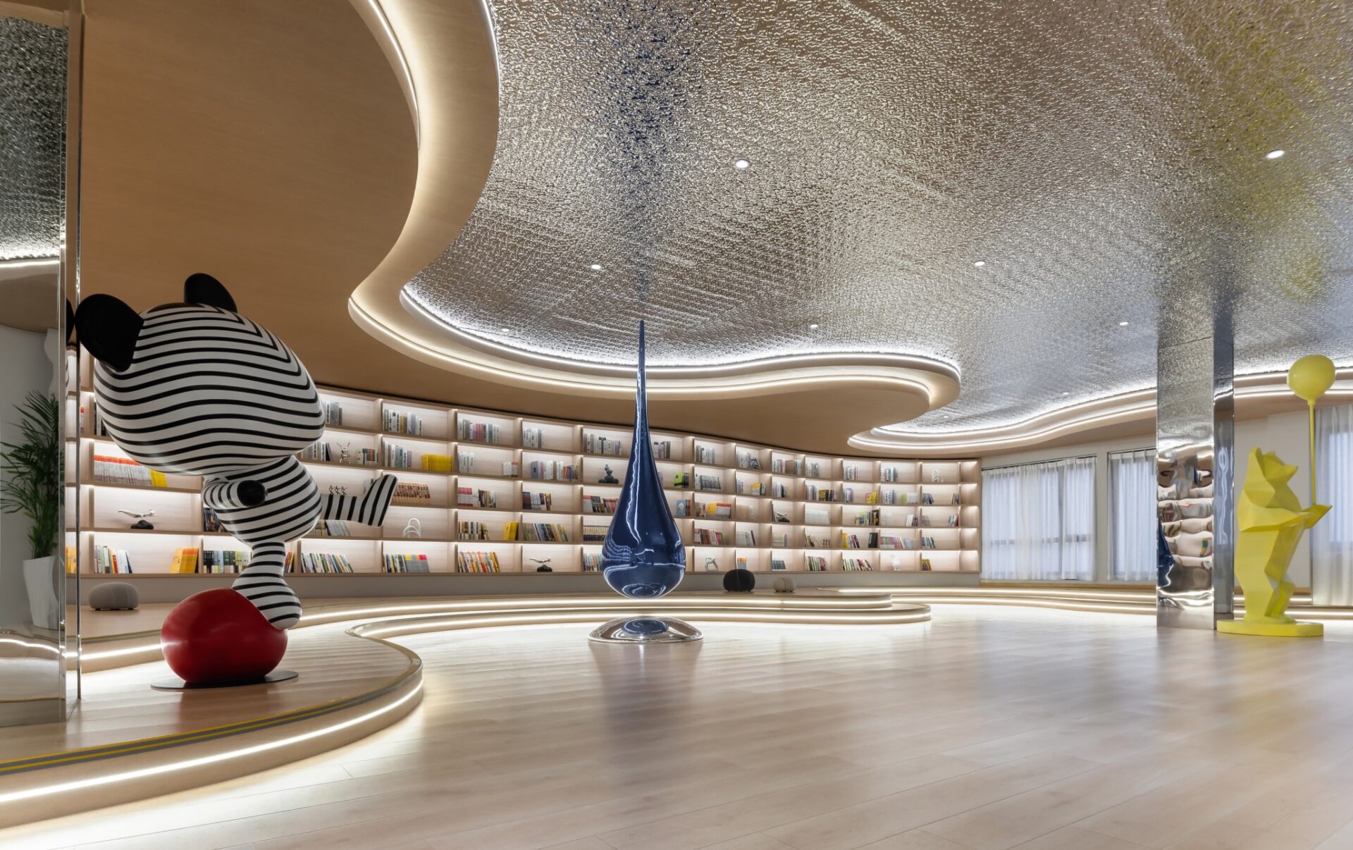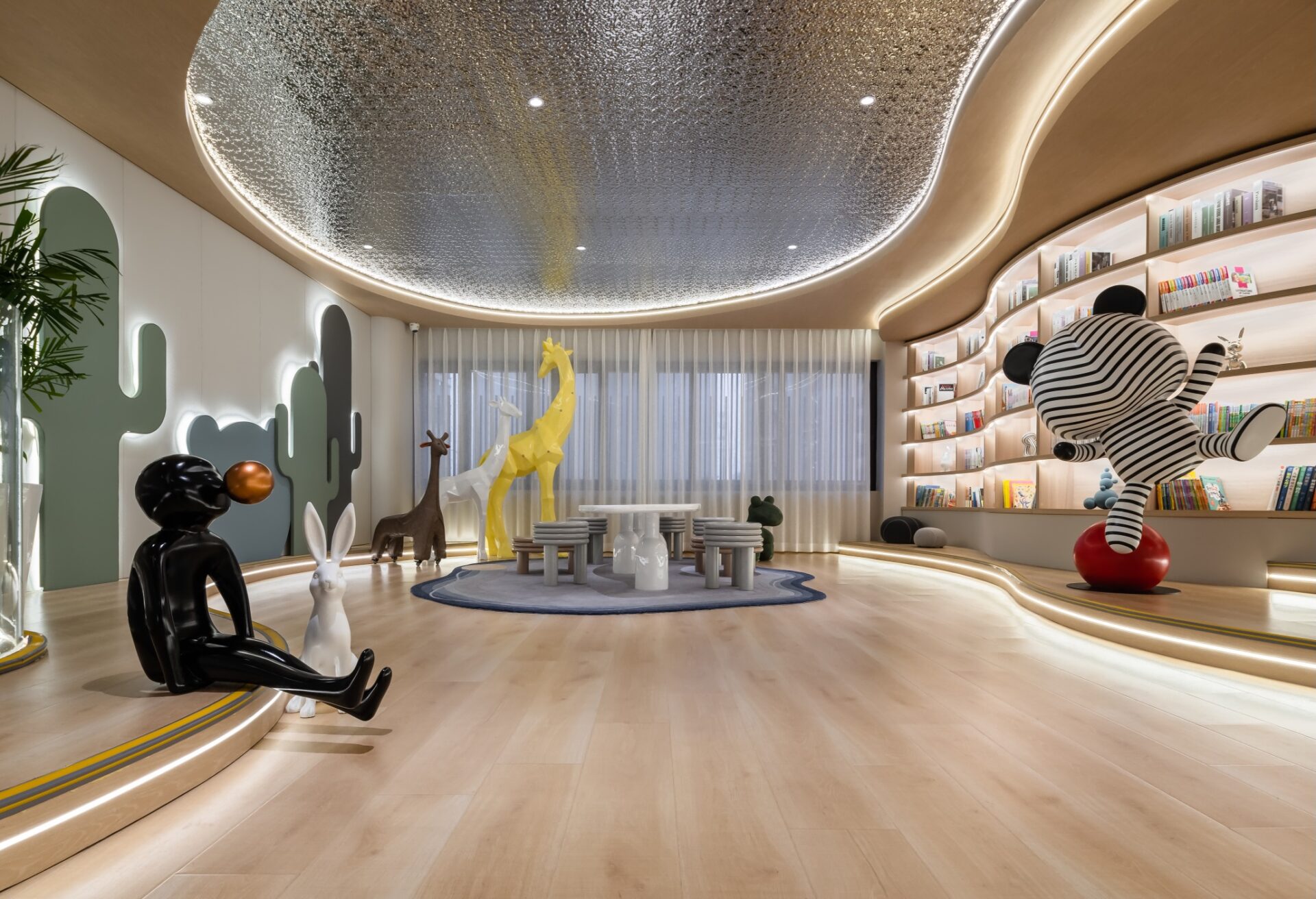 A meticulously designed "Lady's Flower Room" artfully integrates stone, metal, wicker, and fabric, complemented by an exquisite floral art wall. This thoughtful design crafts a warm and poetic living atmosphere. The stepped book lounge, dominated by natural wood tones, features expansive floor-to-ceiling windows that flood the space with abundant natural light, creating a bright and transparent reading sanctuary. Beyond its aesthetic appeal, the space serves as an engaging and secure interactive area for mothers and children, cultivating a sense of joy and safety among residents.