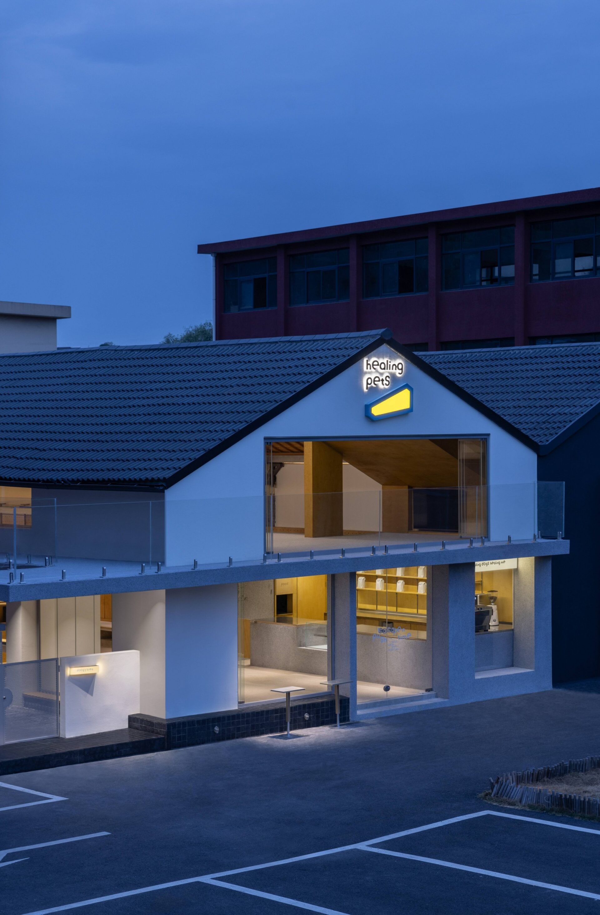 Rough washed stone is applied in the indoor bar, seats and the floor to create a natural sense of simplicity. The gravel-concrete floor and gray washed walls work in concert with each other for continuing to deepen the outdoor feelings of the space nature. The rough material can play the role of non-slip for pets, but also has the durability and stain resistance of outdoor natural materials. The entire space wall retail system and movable furniture system are constructed by using color-matching ocean panels to create a warm space atmosphere, which complements the original wooden roof. The clever selection of these materials and the natural weathering of the texture over time further enhance the architectural texture.