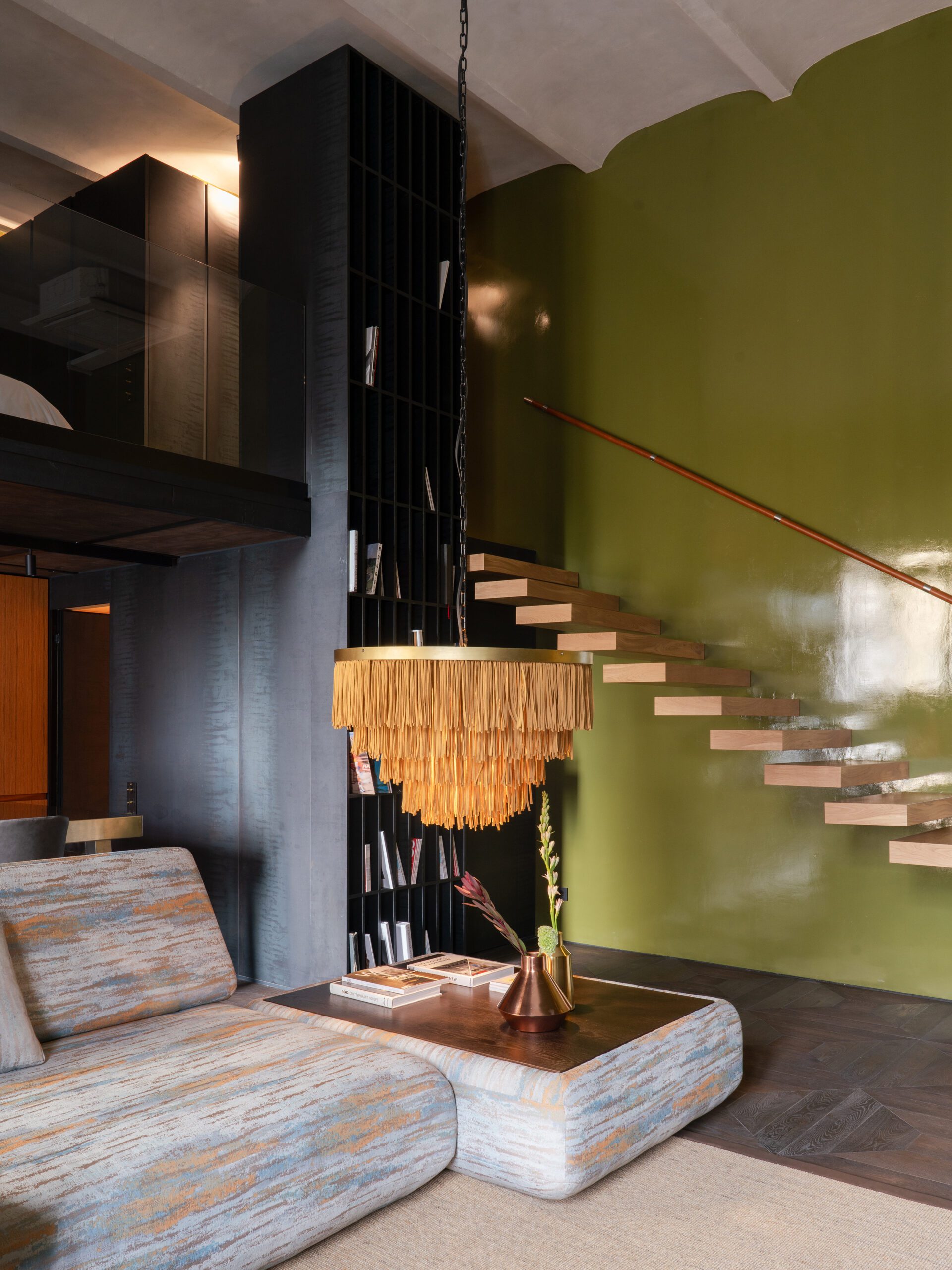 The residence’s color scheme envelops the space, while the sunny side balances it. Its design transforms functionality depending on the time of the day and demands: it helps to relax, but does not block working mood. Deep- green glossy walls, large living room, variety of textures and a library of collector’s editions contributes to a sense of peace and comfort.