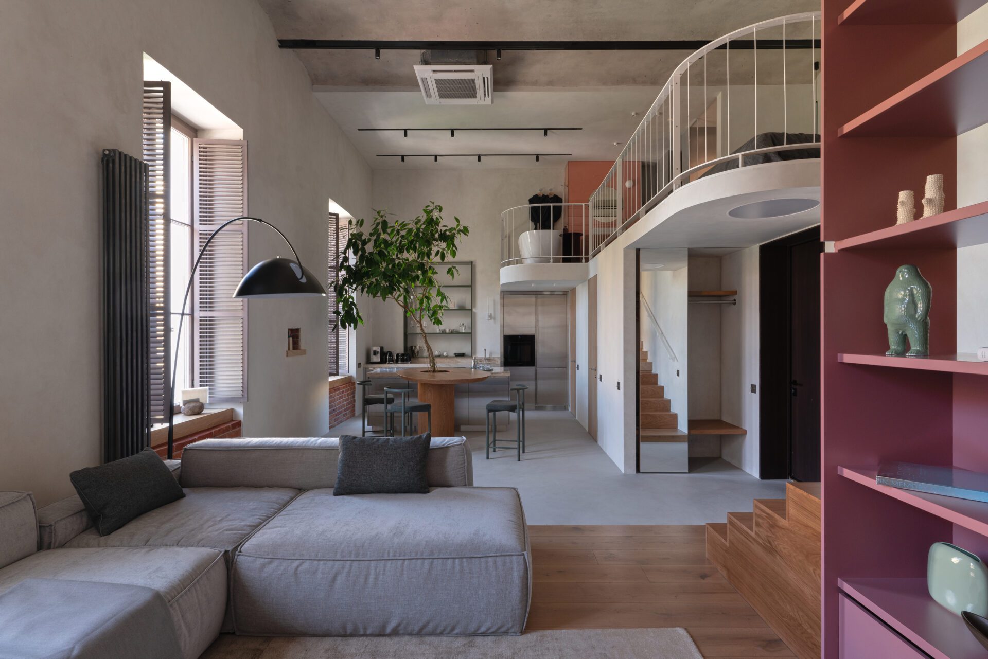 Dominant features of this residence are light, delicate colors and wood accents in the furniture, which sets the tone of a romantic escape from the hustle. LED ceiling lights in the center of the hall resemble flying objects, evoking futurism inspired by 1960s France. Round dining table, with a tree growing through its center, hints at a secret knightly order. The large kitchen countertop invites you to host dinner parties. Open-spaced bathroom on the second floor looks like a terrace, makes you wish time to stop and switch on your imagination.