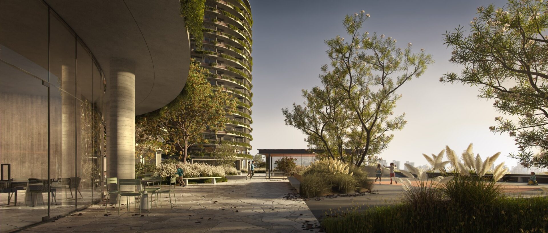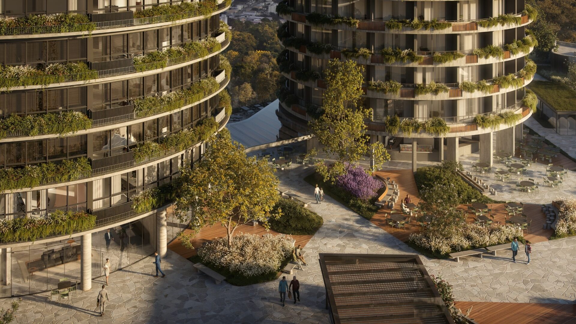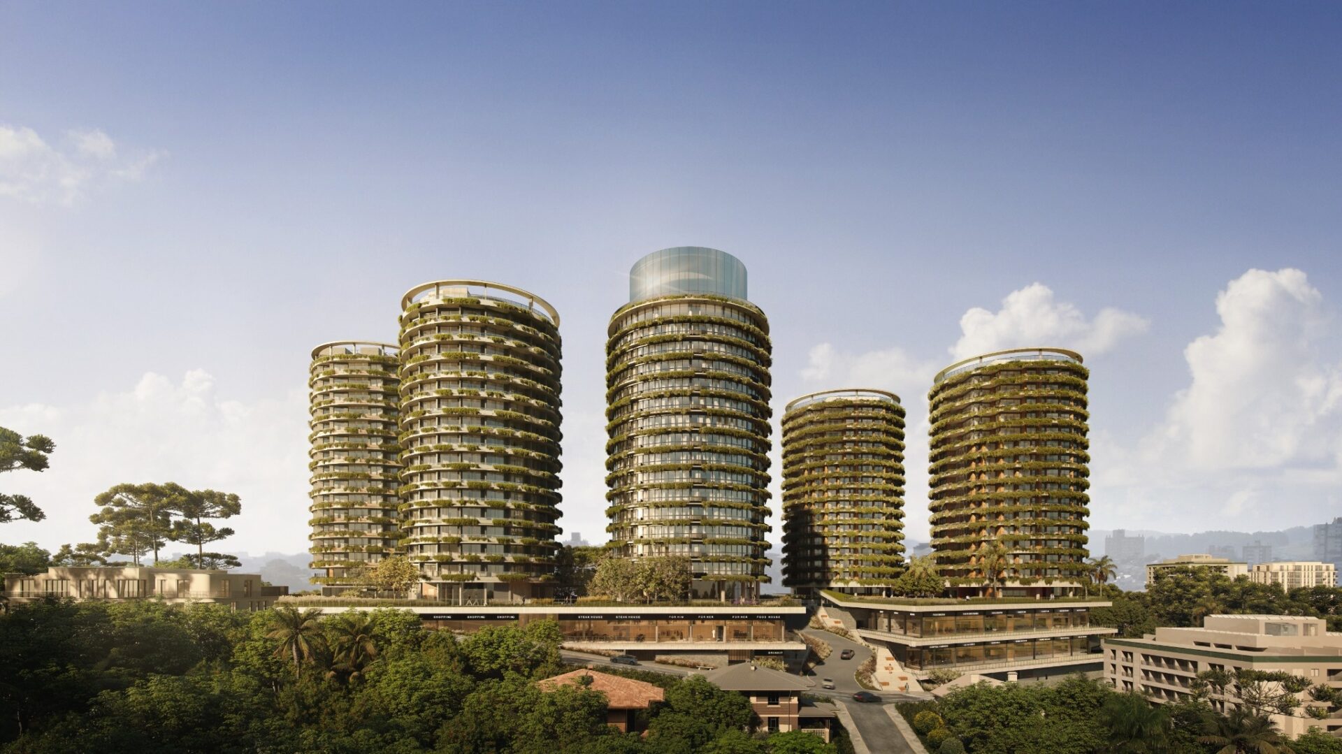 The program ensures urban vitality across all hours of the day: three residential towers with over 340 apartments, two additional towers with commercial and short-stay units, a 6,500 sqm open-air retail promenade at ground level, and a rooftop cultural hub combining a gallery, restaurant, and observatory. A native-species public park, a private garden with leisure spaces, and a parking structure with over 1,100 spaces complete the ensemble—designed to foster seamless coexistence between living, working, and leisure.