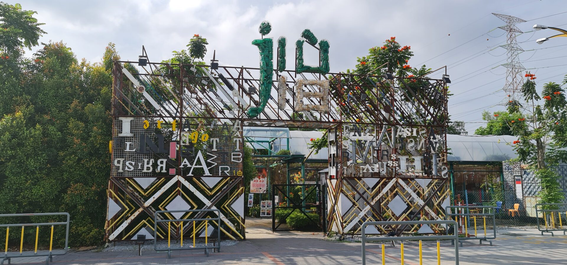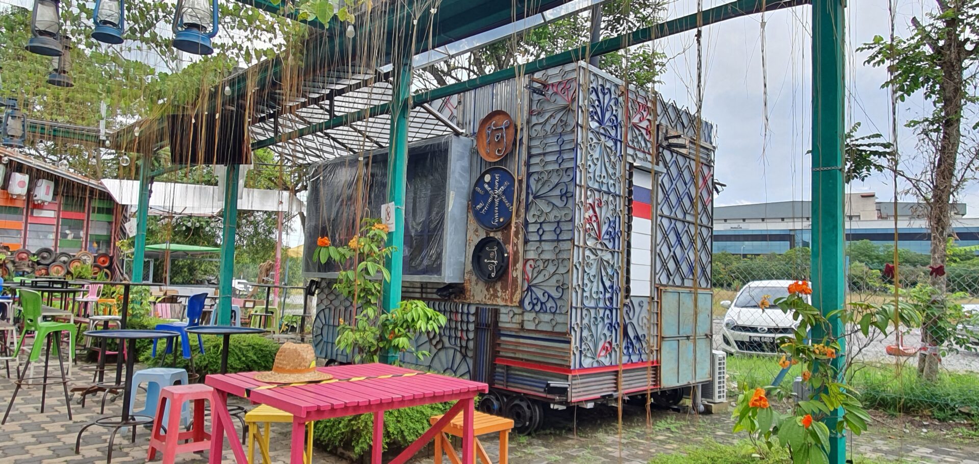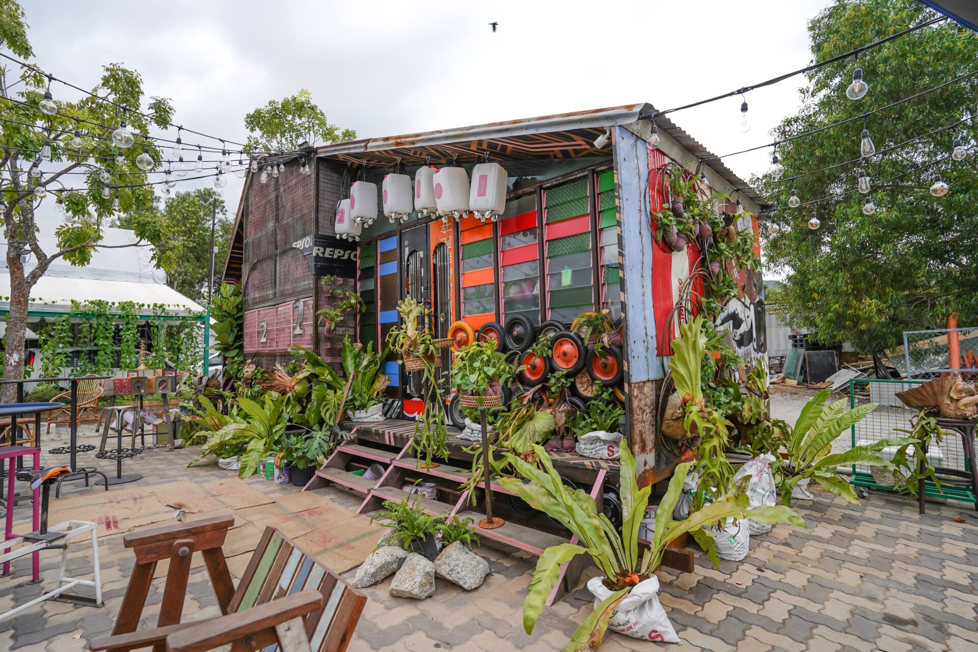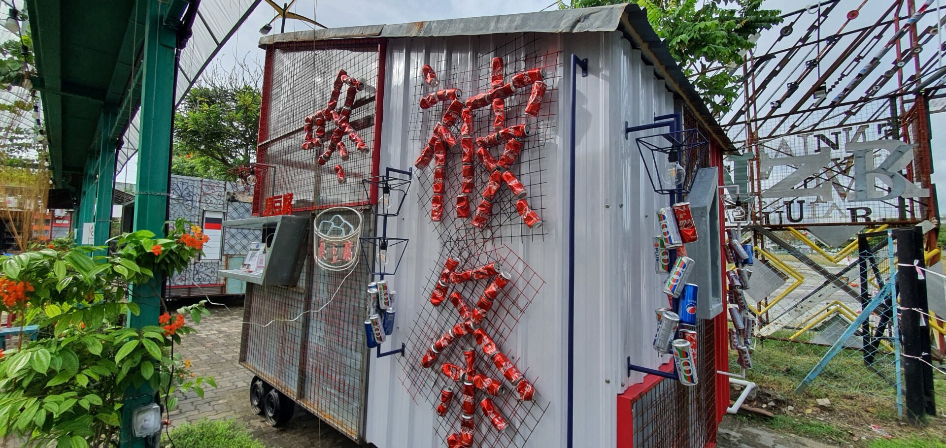 2 Botol: Built with oil drums and grating panels, accented with small discarded wheels. The roof is made of aged corrugated sheets, with ventilation provided by folding and “kampung glass” louver windows. Its door is made from an old signboard, and lighting features vintage Edison bulbs. The sign incorporates barrel parts and internal lighting, reinforcing its retro-industrial aesthetic.