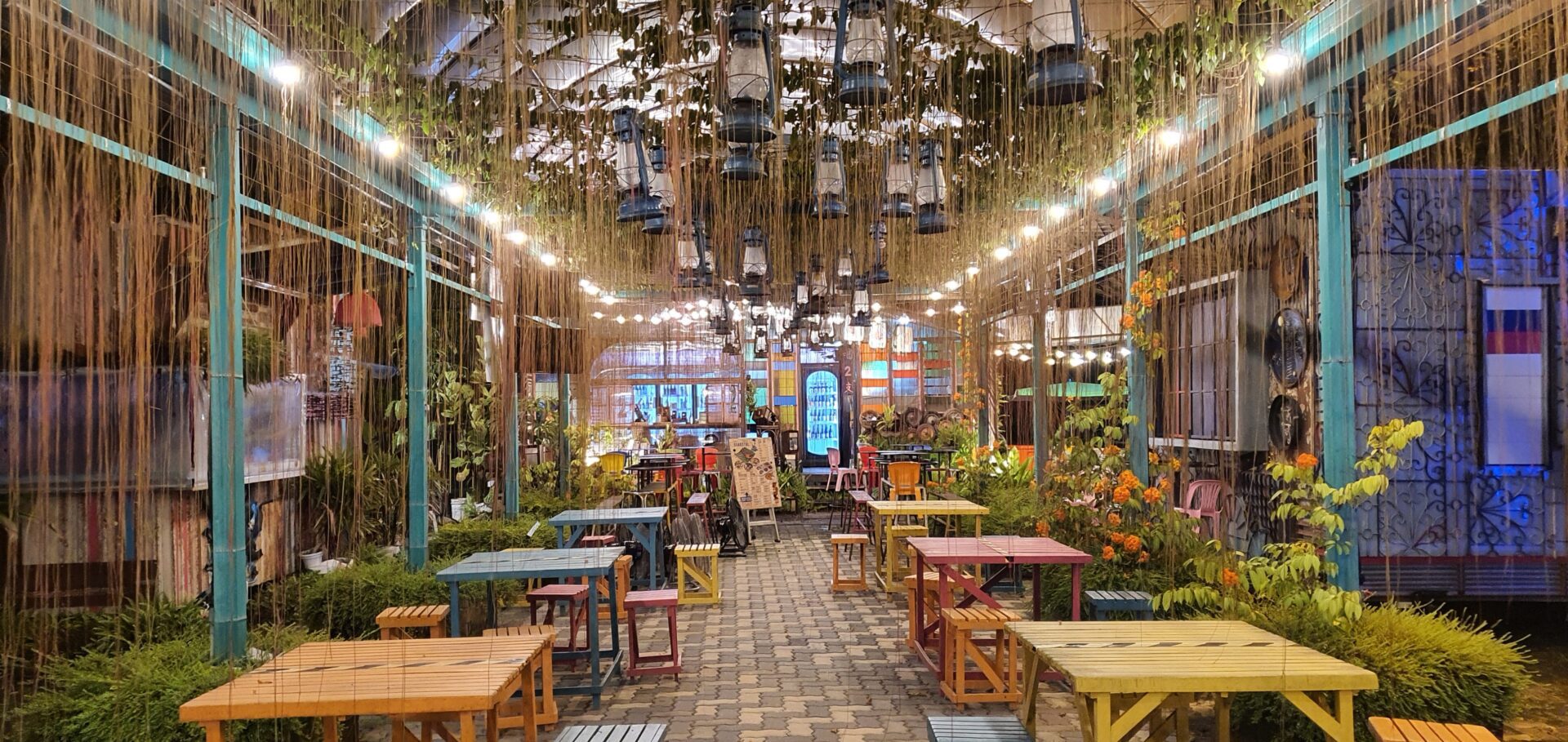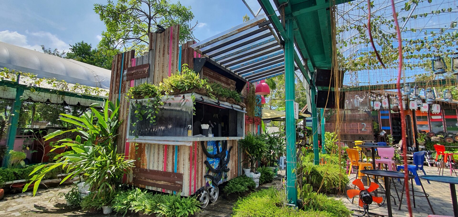The dining space includes four uniquely designed stalls and seating areas surrounded by greenery, improving air quality and enhancing the open-air atmosphere. Brightly colored tables and chairs made from recycled materials foster a cheerful and welcoming environment. Decorative elements such as reclaimed wood art, metal sculptures, and repurposed furniture add layers of visual and cultural depth, blending functionality with artistic expression.