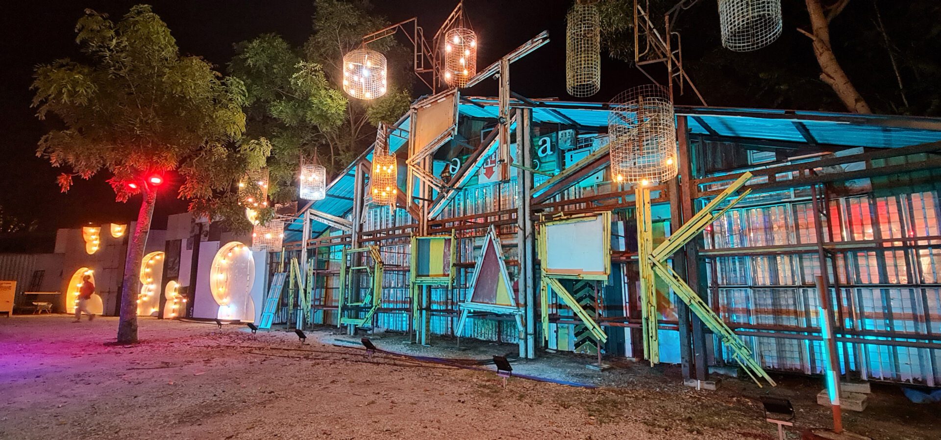 Facing a parking lot, the entrance was designed to overcome visual obstructions with a tall archway made from discarded scaffolding. It’s adorned with repurposed signage letters, scrap metal, and old machinery parts, offering a distinct industrial charm. The word “Jiu 旧” is creatively spelled using recycled plastic bottles, illuminated with smart color-changing LED lights, making it a vibrant landmark both day and night.