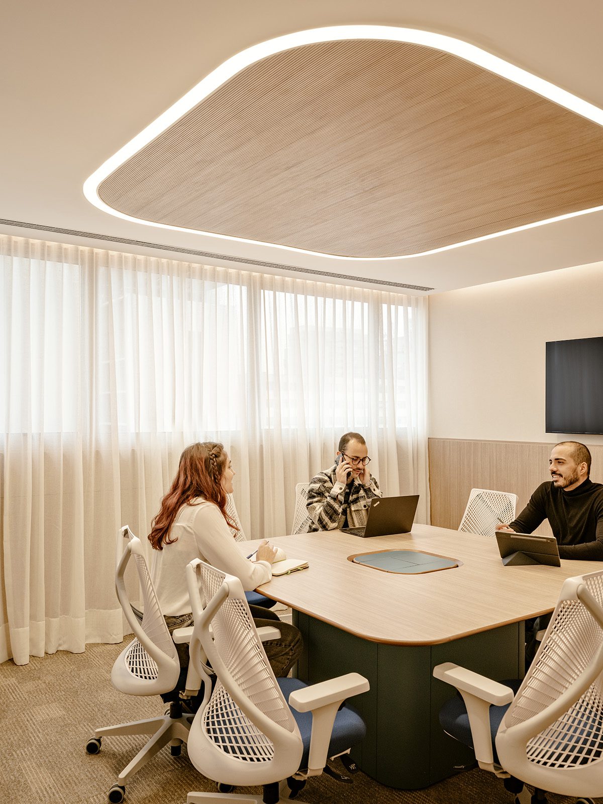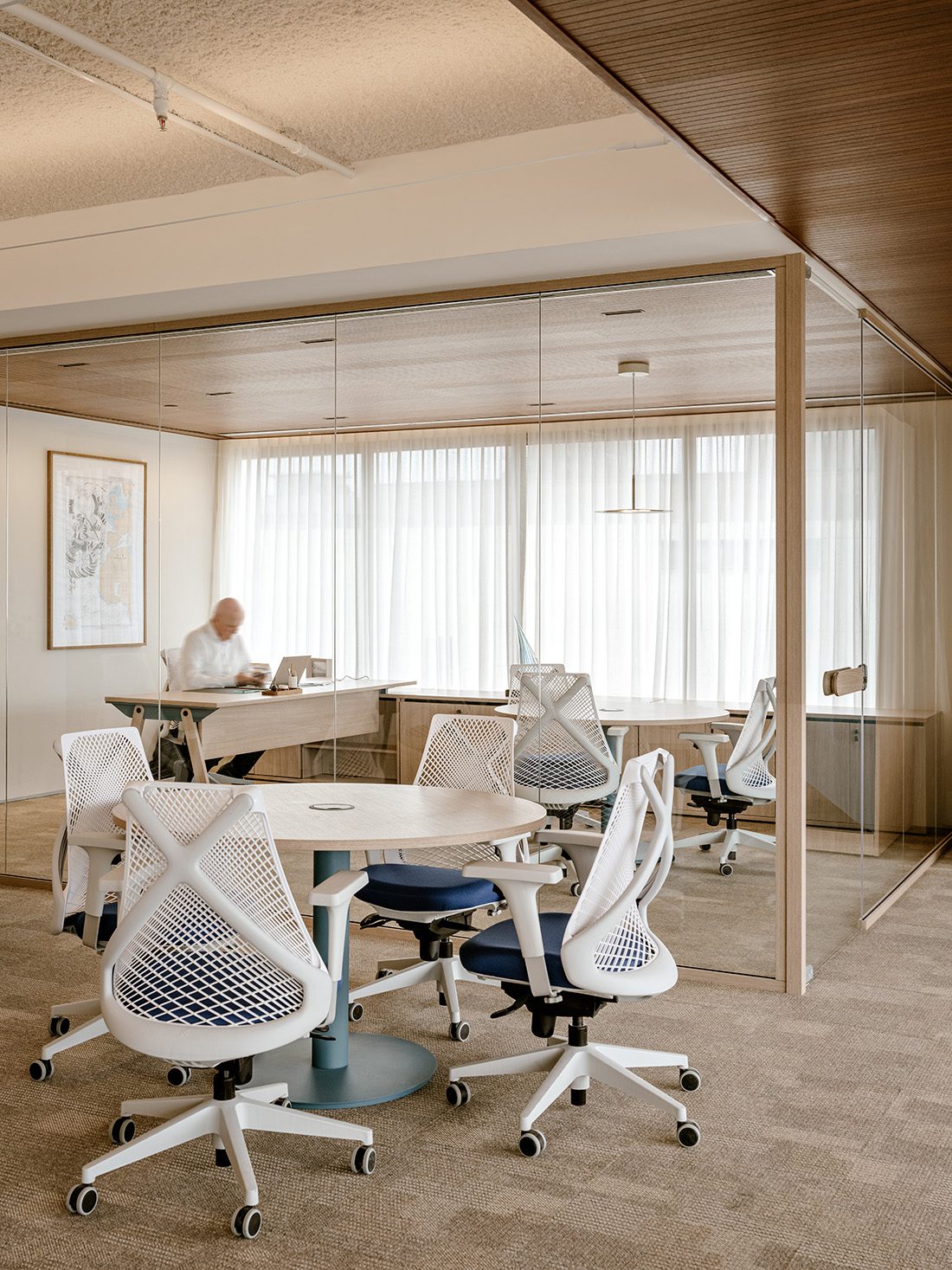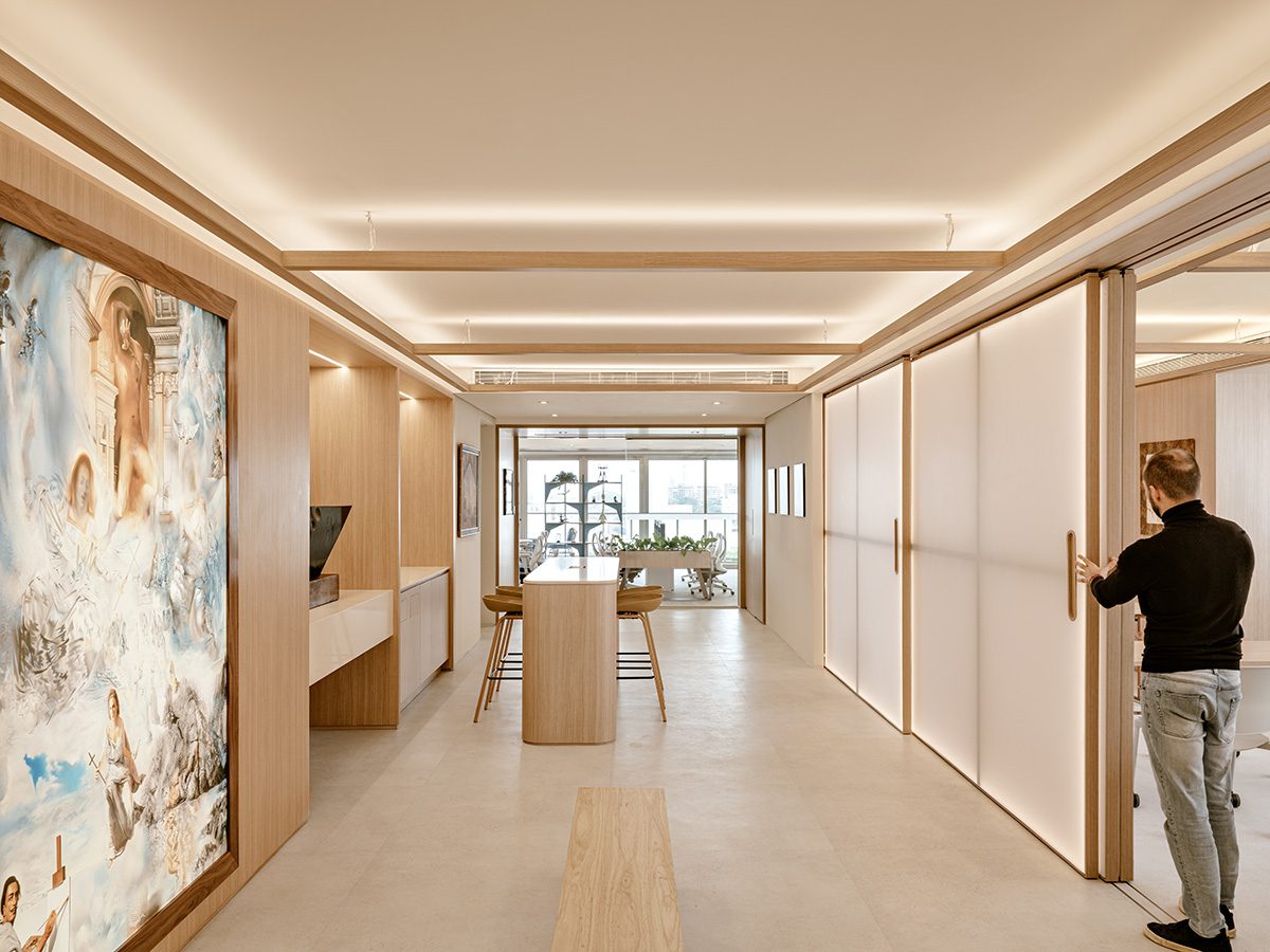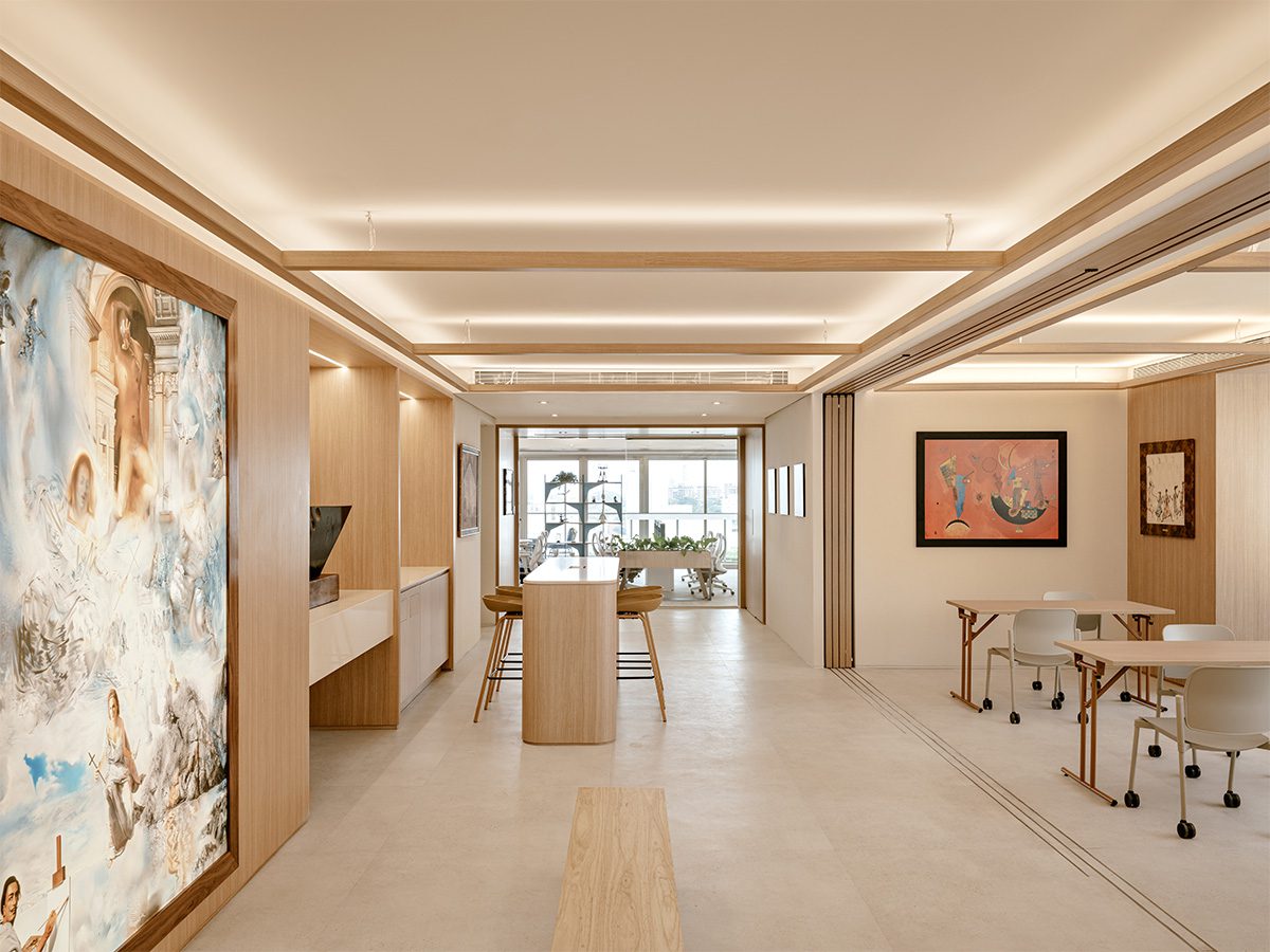 The materialization of this office in the form of an art gallery was possible thanks to the balance between technique and creativity. To maintain the functionality of such large spaces, the architecture and design team resorted to the innovative use of panels: “The sliding panels in the public area were very complex to execute, involving carpentry, metalwork, engineering, electrical and lighting work. Another major challenge was the execution of a large steel panel to attract the magnets of the paintings, so that the art exhibition could be easily transformed into different scenarios”, shares Carlos Andrigo, Senior Project Designer at Perkins&Will.