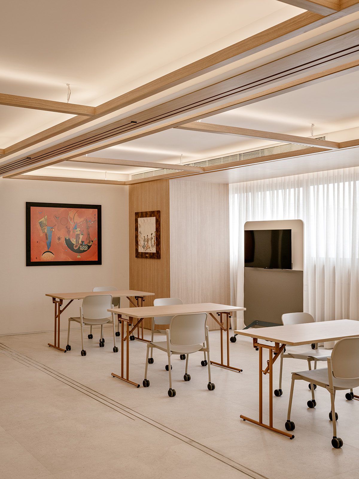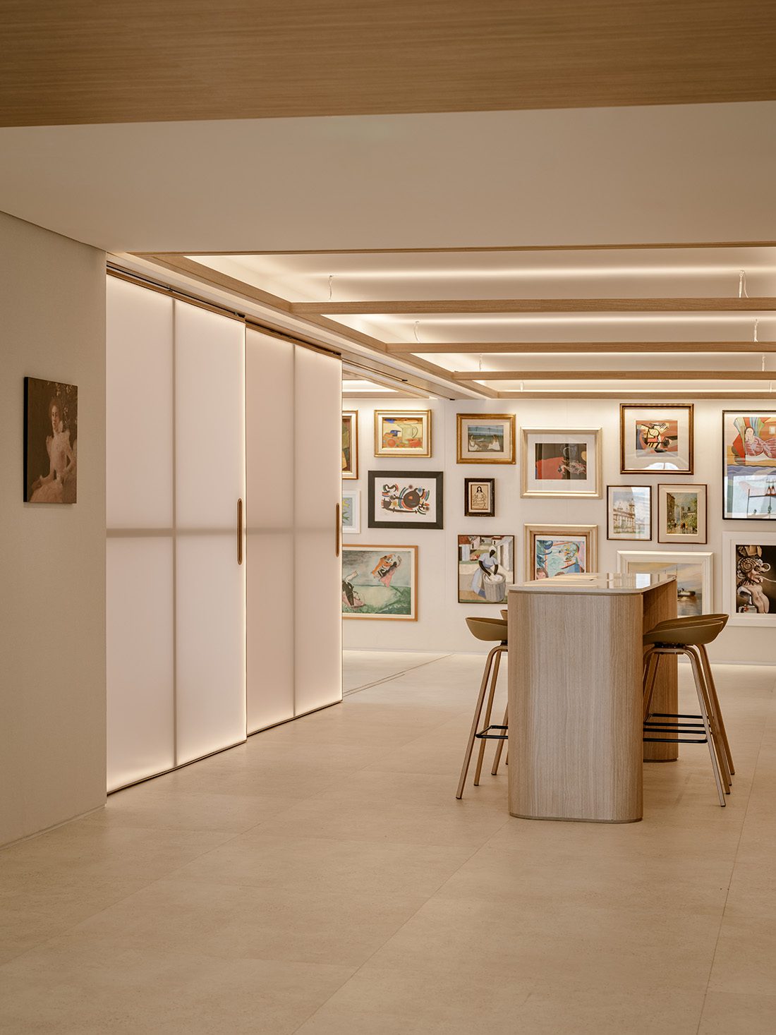 Amplitude, neutrality and lighting are the project’s highlights, as they elevate the works of art to the position of protagonists, in combination with the light tones’ palette, which lends sobriety to the environment. Wooden grids support the large light fixtures in the public area, which bathe the environment indirectly, completing the visual effects created by the lighting applied to the sliding panels in allusion to the sailboat that also inspired the project. “In the art panels and niches, we washed the wall with direct light to highlight the works. It is as if the pieces were transformed into light fixtures, reflecting their colours in the environment”, adds Carlos Andrigo.