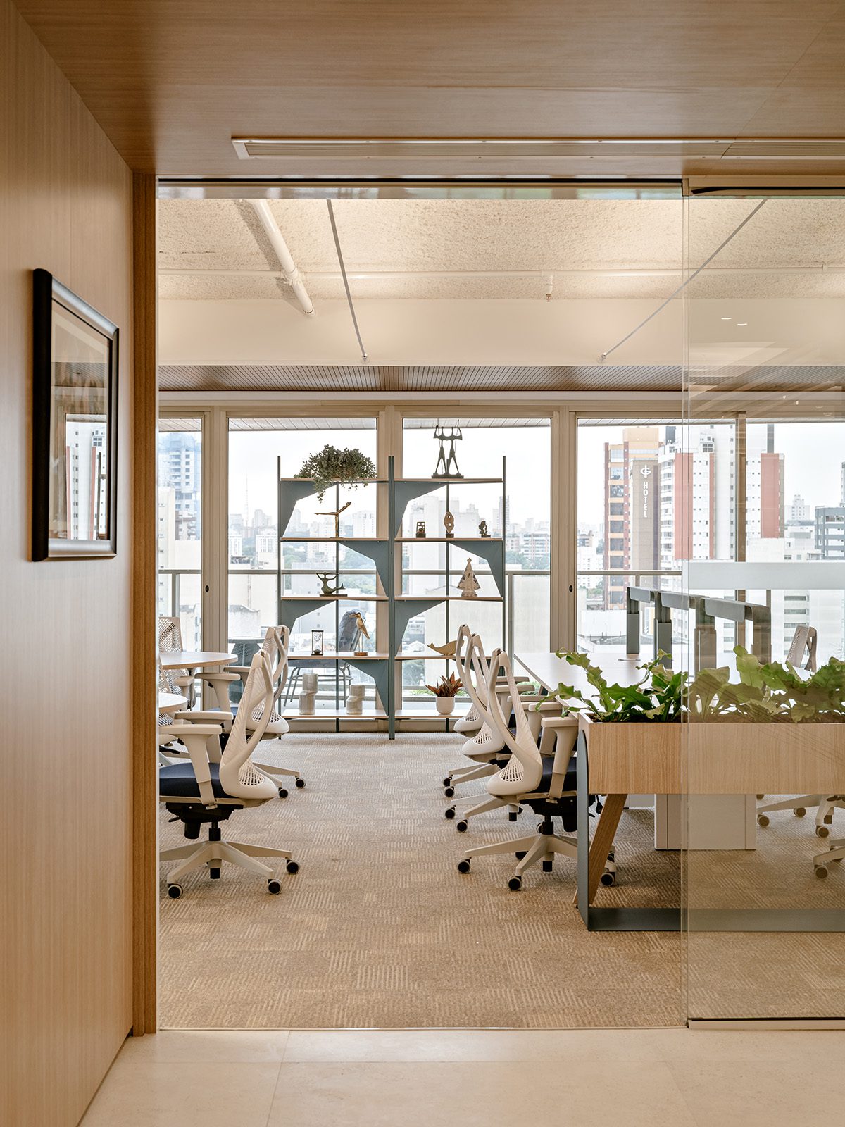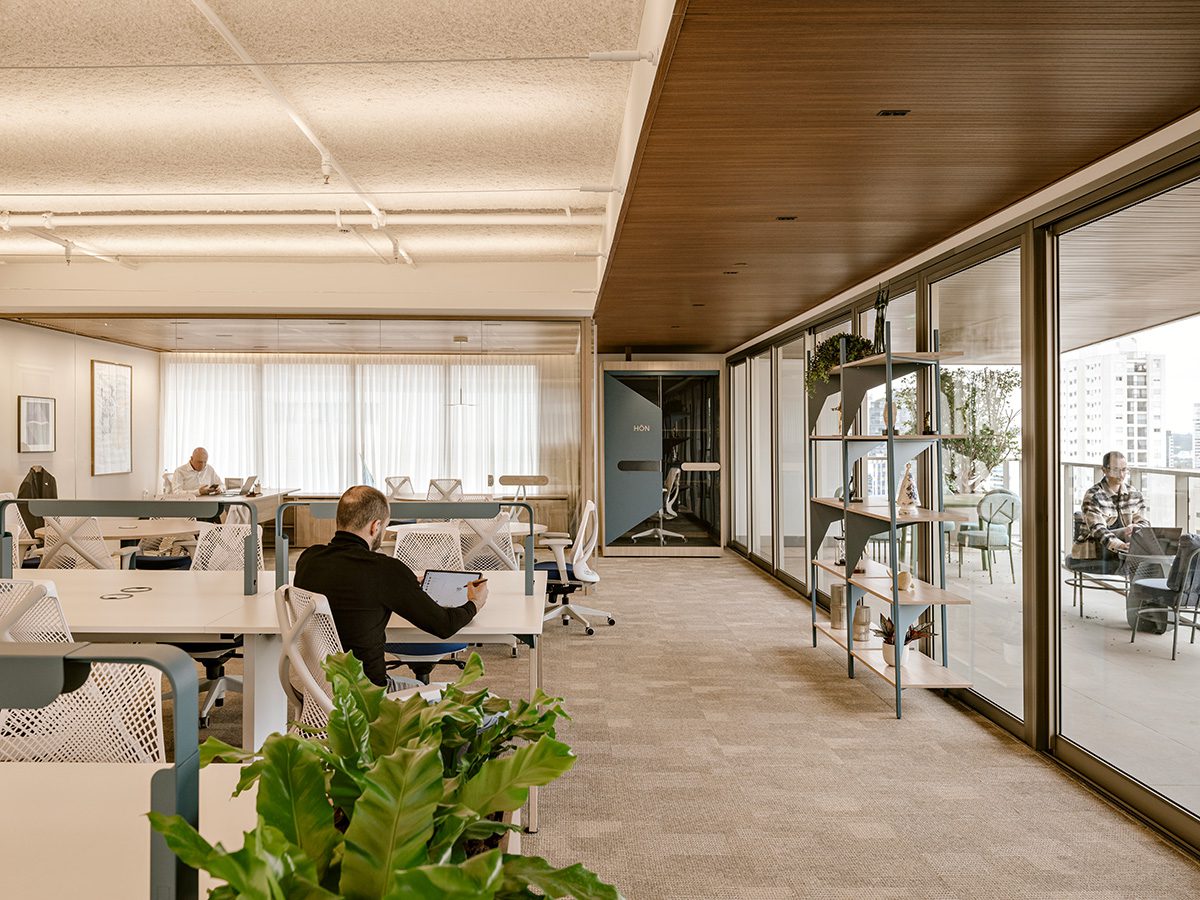 Taking advantage of the terraces, planters and large openings that are characteristic of the building, the Perkins&Will team intensified the connection between interior and exterior by applying coatings that already characterized the outdoors, such as the wooden lining of the terrace that invades the interiors. Oscar dos Santos Emboaba also inspired the production and selection of furniture: the geometric shapes of the façade echoes in the Virá Shelf and the HON Cabin - both developed by Hitchpen especially for this project; used, respectively, to display sculptures from the client's personal collection and to provide privacy for video conferences.