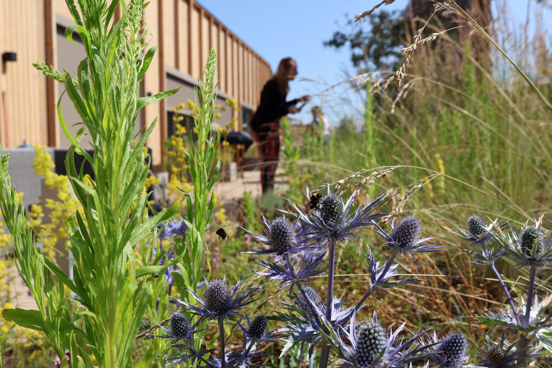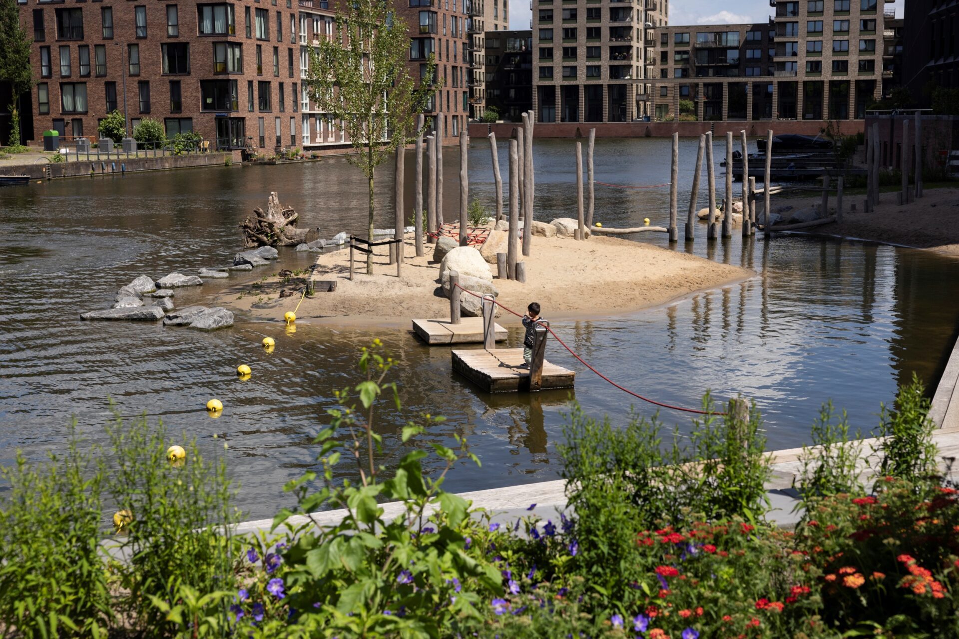The quay is transformed into a dynamic bank landscape, teeming with diverse vegetation along the border between land and water. Reed beds, interspersed with jetties along the building, gradually transition into grassy banks adorned with sandy beaches near the square, with an enchanting Island nestled within the canal. To traverse this natural wonderland, stepping stones and a towing ferry offer an adventurous route across the water. Wooden objects scattered throughout the greenery serve as inviting natural play elements, adding an extra layer of excitement and exploration.