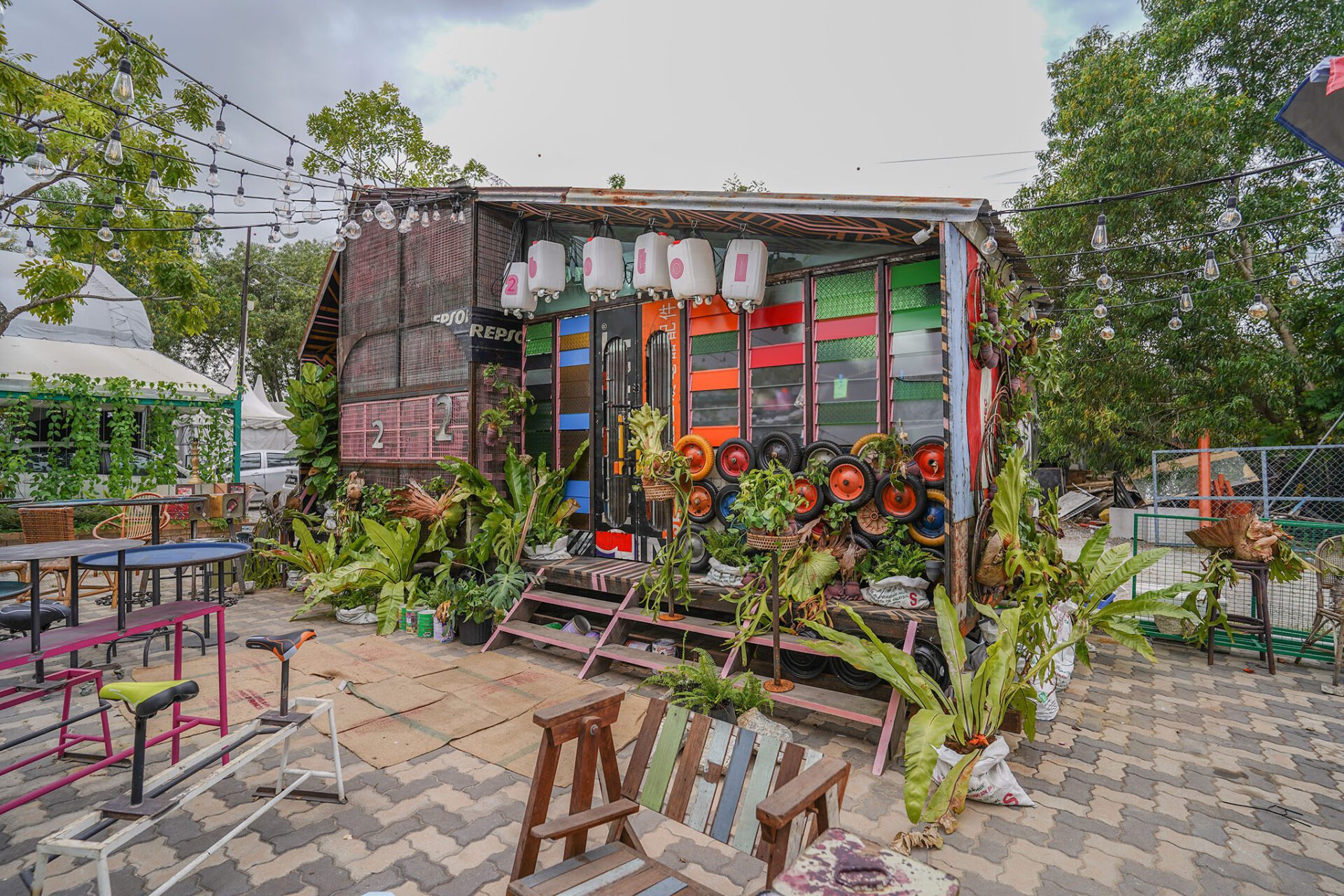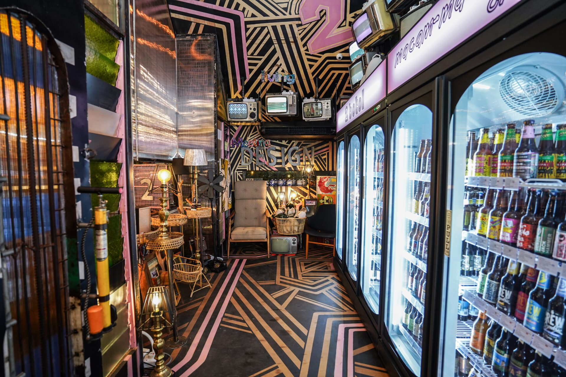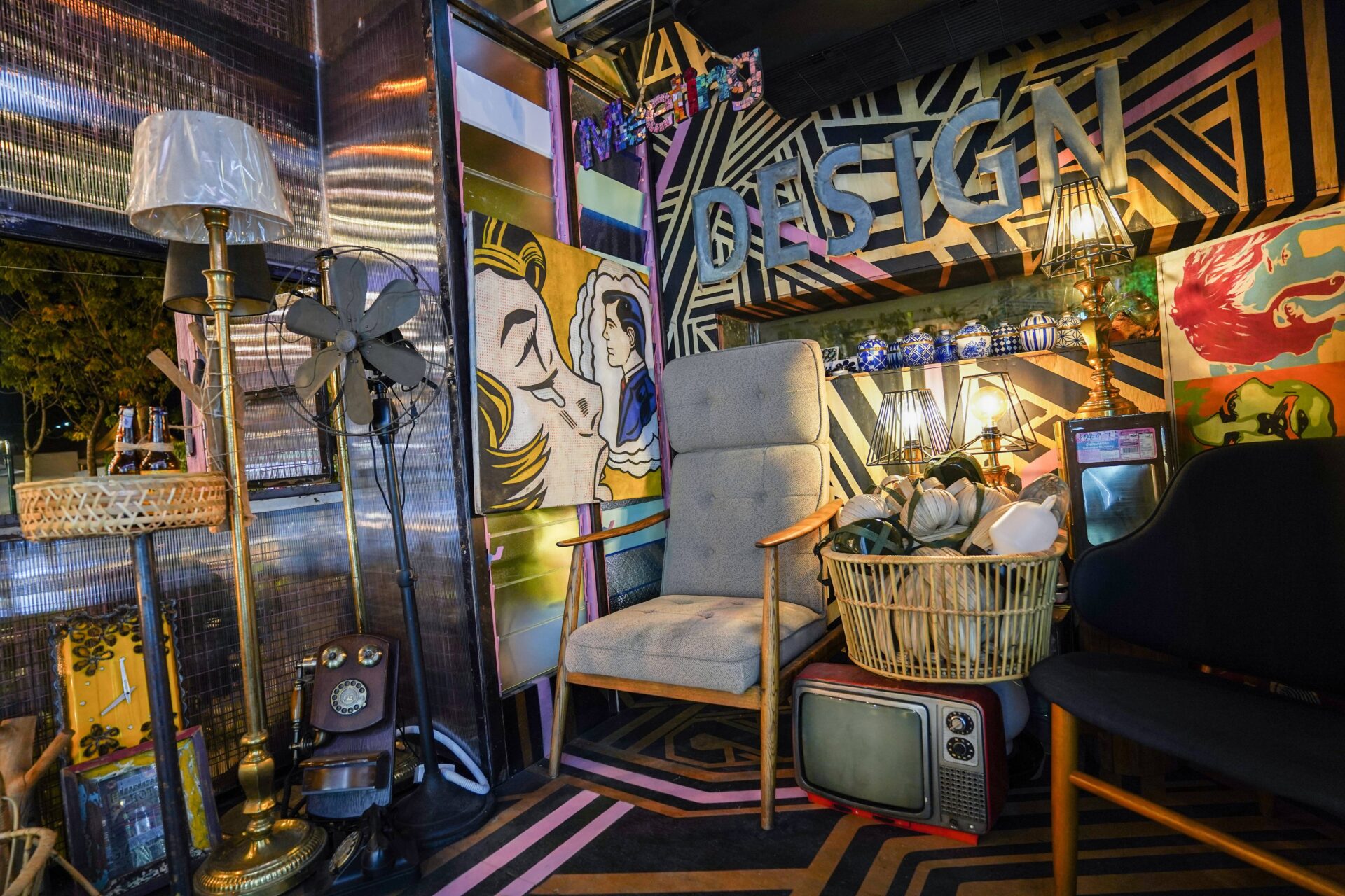 To soften the industrial tone of the exterior, lush green plants were placed outside to emphasize the importance of greenery. The rear wall features two beetles cut from reclaimed iron sheets, decorated with geometric patterns. Outdoor lighting uses vintage-style Edison bulbs to evoke nostalgia. Inside, the design is eclectic and layered, combining vintage black-and-white TVs, retro sofas, telephones, table lamps, and semi-abstract paintings. Everyday objects from different cultures are arranged densely yet thoughtfully, creating a sense of organized chaos. Geometric patterns run across ceilings, floors, walls, and cabinets, resulting in a visually stimulating atmosphere within the limited space.