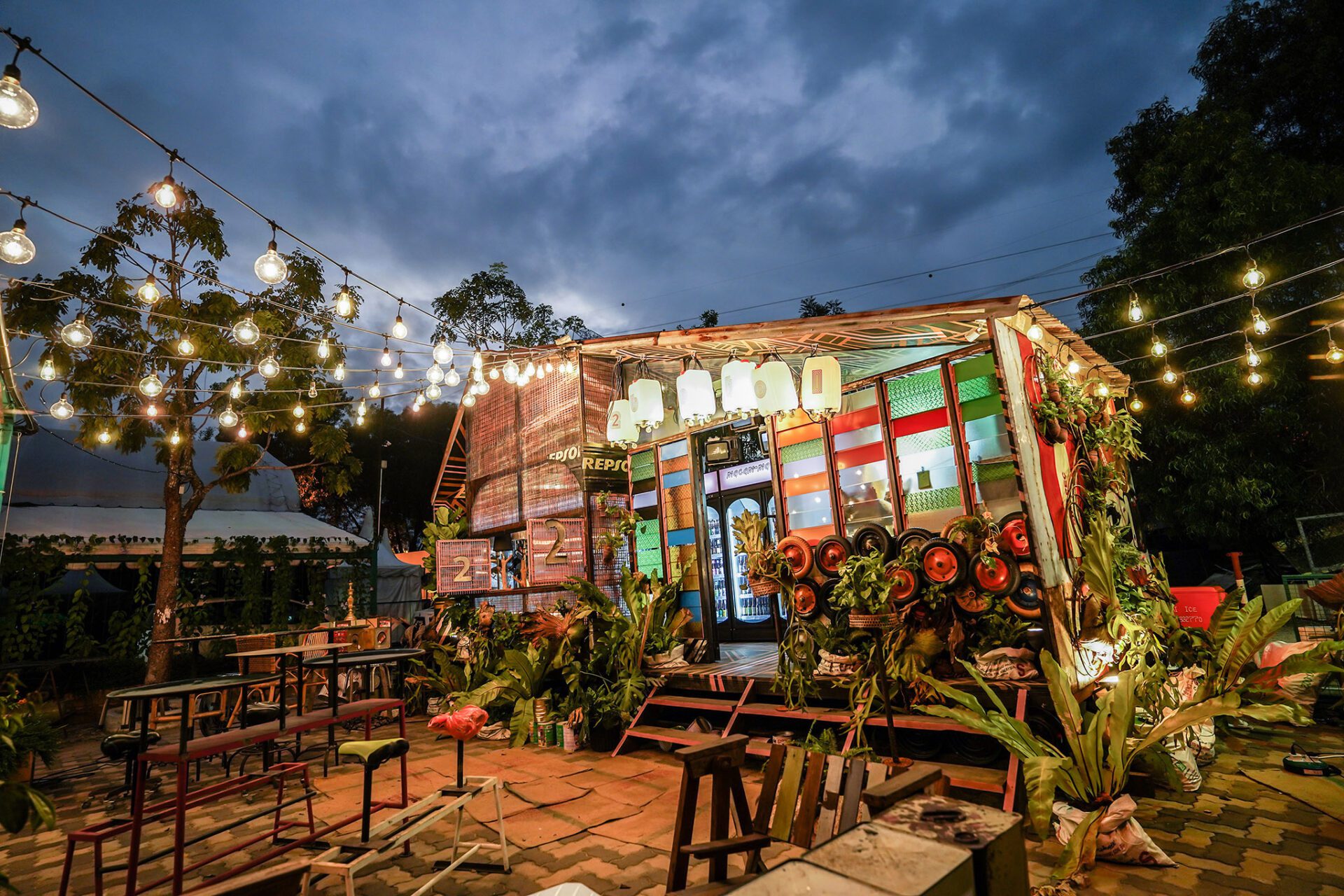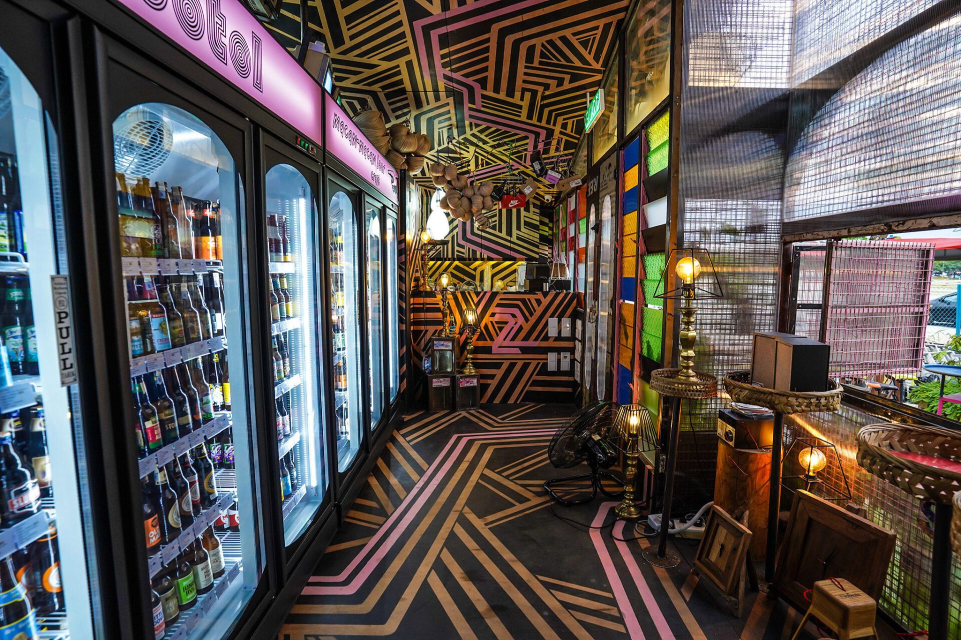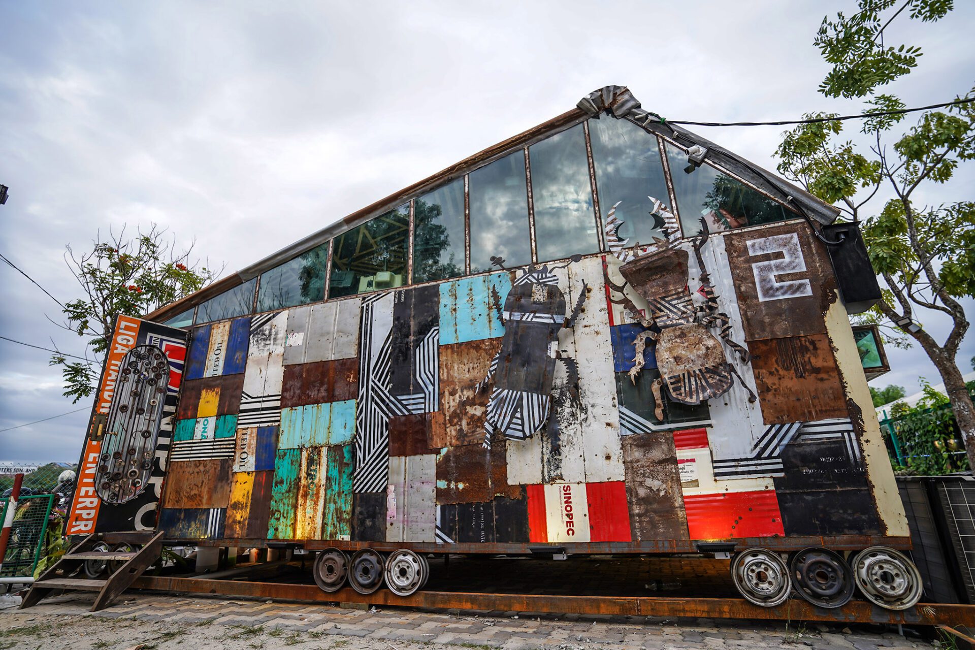 To soften the industrial tone of the exterior, lush green plants were placed outside to emphasize the importance of greenery. The rear wall features two beetles cut from reclaimed iron sheets, decorated with geometric patterns. Outdoor lighting uses vintage-style Edison bulbs to evoke nostalgia. Inside, the design is eclectic and layered, combining vintage black-and-white TVs, retro sofas, telephones, table lamps, and semi-abstract paintings. Everyday objects from different cultures are arranged densely yet thoughtfully, creating a sense of organized chaos. Geometric patterns run across ceilings, floors, walls, and cabinets, resulting in a visually stimulating atmosphere within the limited space.