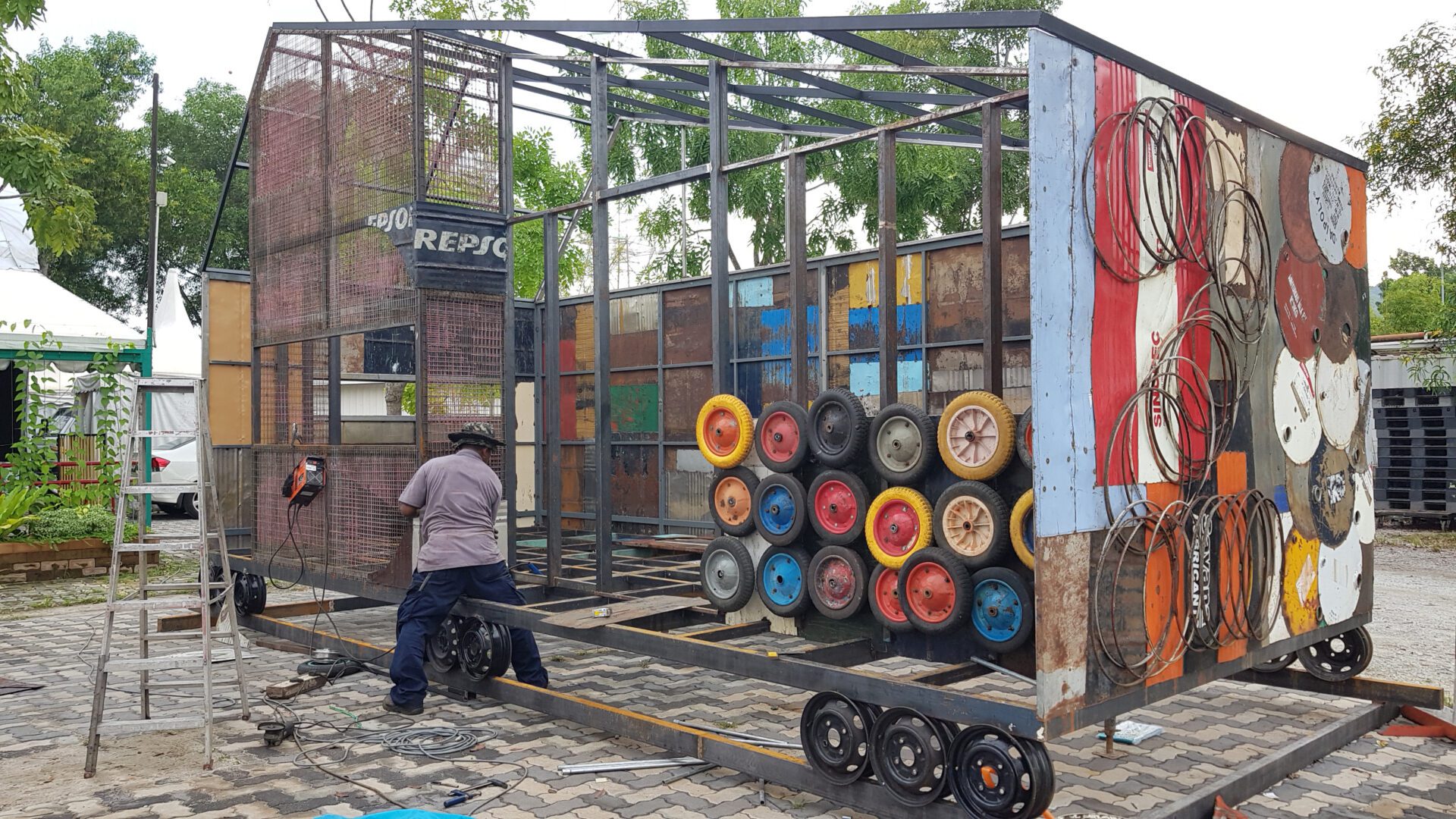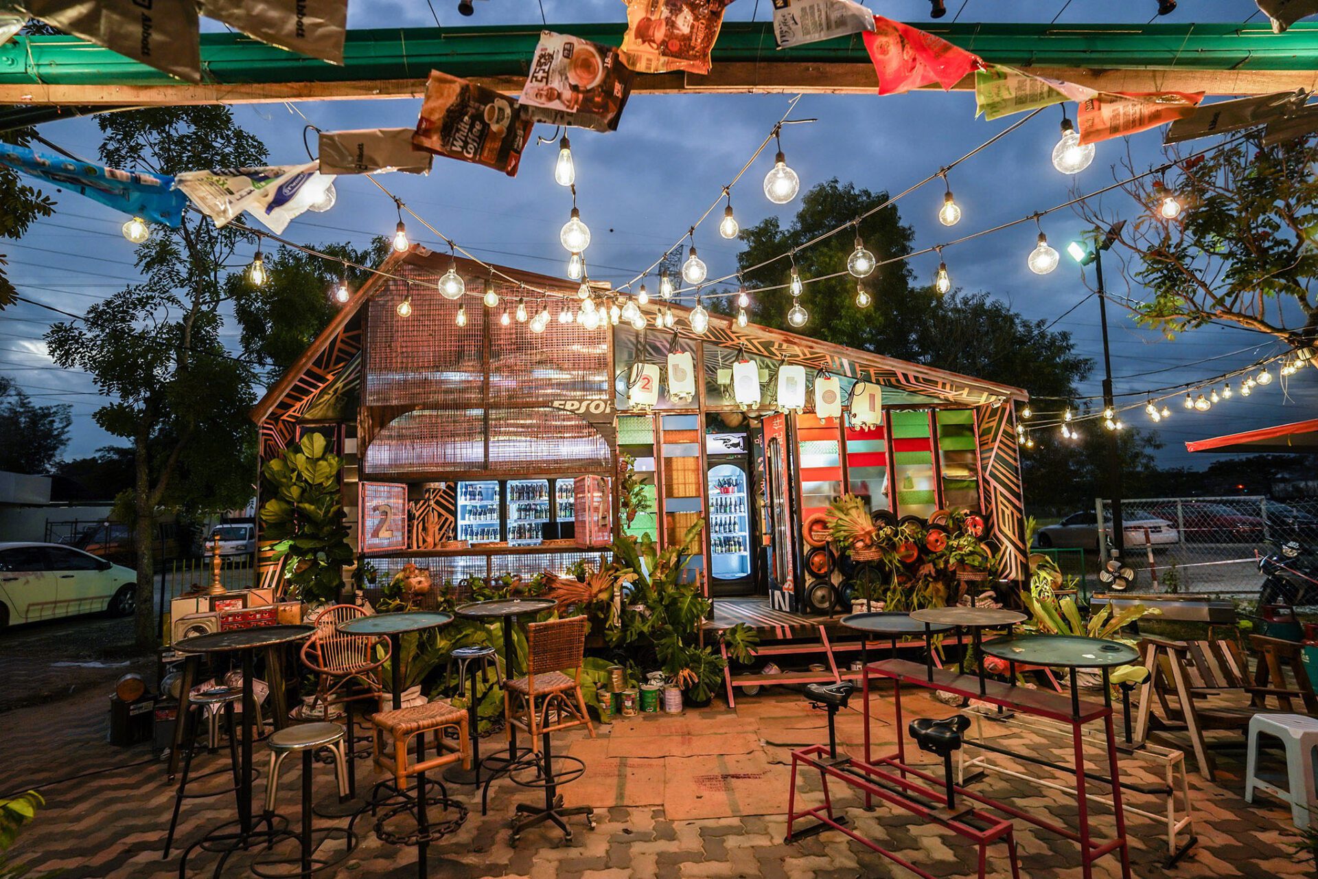 Constructed from entirely repurposed materials, the bar’s structure reflects raw authenticity and sustainability. Discarded wheel rims serve as foundational supports, while steps were reconstructed using old wooden staircases. Exterior walls were made from rusty grating panels and old oil drums, and the roof from used corrugated iron sheets. Rather than using standard aluminium frames, we selected old “kampung glass” louver windows for the right front facade, and large folding windows on the left for enhanced ventilation and openness. An extra small window was added to reduce the enclosed feel. The door is crafted from a discarded signboard with an old air pump as its handle. Above the door, a chemical barrel with an internal light source functions as the shop’s main signage. Inside, recycled wood panels finished with paint line the floors and walls.