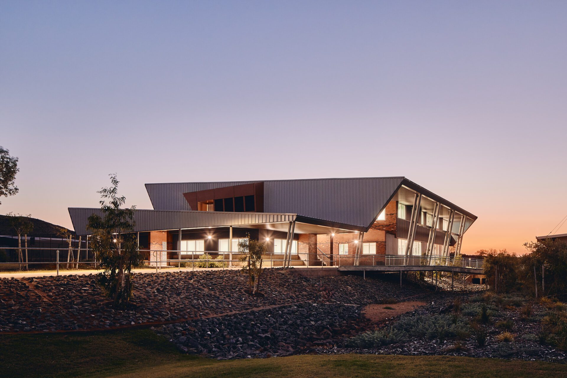 The economical plan allowed additional external spaces to be introduced. A large central undercover breezeway connects disparate uses while focusing views to the distant ancient hills.