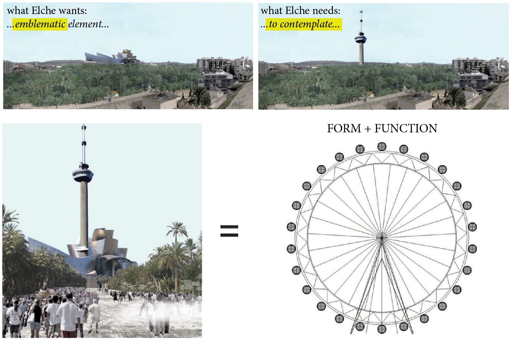 We proposed a wheel for Elche. The wheel is a strategy. The wheel is resistant to fashion, style, and time. It is a timeless emblem. Its assembly is completely reversible (if one day it might not be useful anymore). As the wheel does not consume the total budget, we can also invest in the creation of adjacent public spaces and the renovation of the railway station. The wheel is an intelligent and rational structure: representative and beautiful, powerful and transparent.
