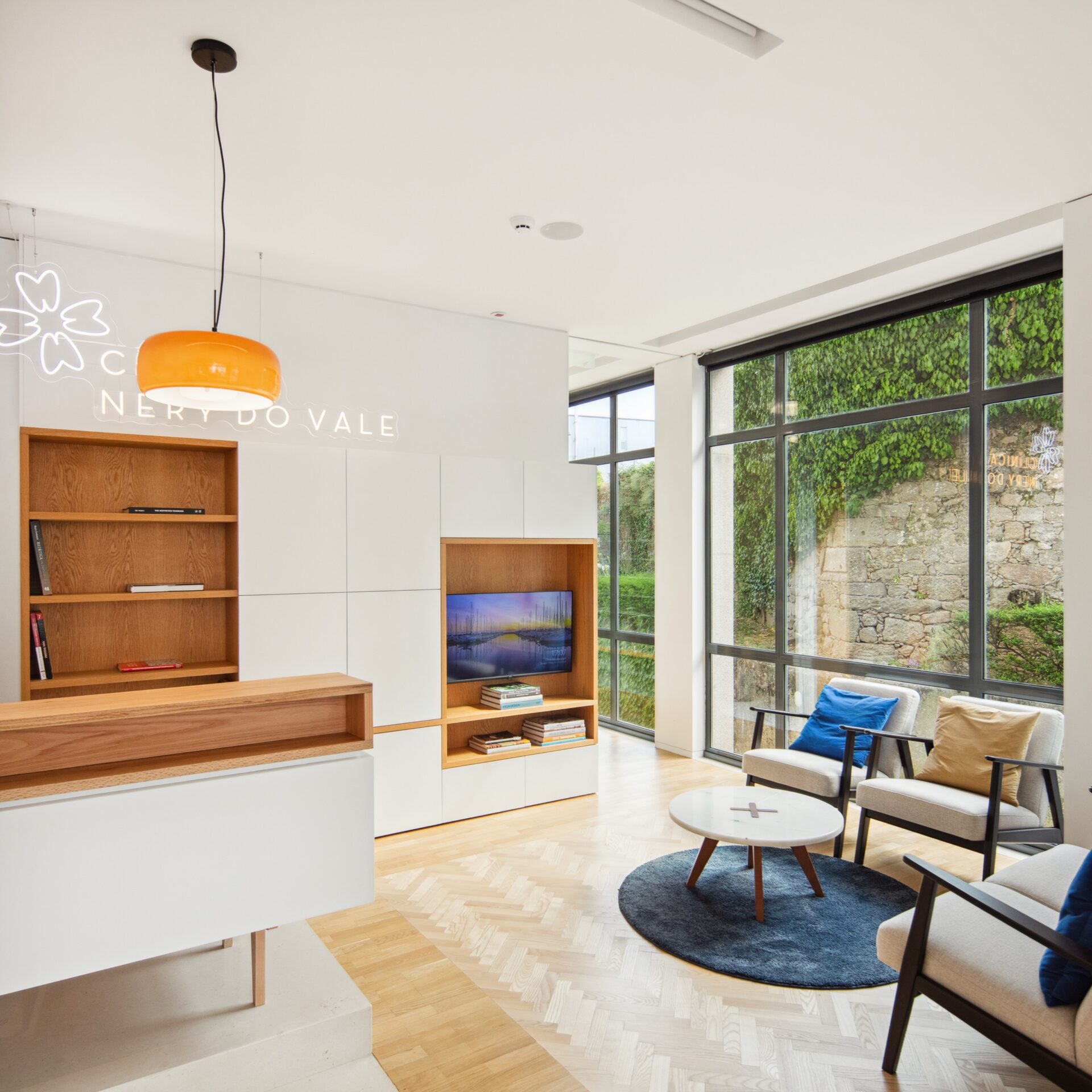 The reception area, the first point of contact, sets the tone for the Clinic’s overall experience. A wooden parquet inlay, informal armchairs, a reception counter designed like a writing desk, and subtle chromatic accents compose an environment that distances itself from the conventional clinical universe, instead invoking familiarity and domestic comfort.