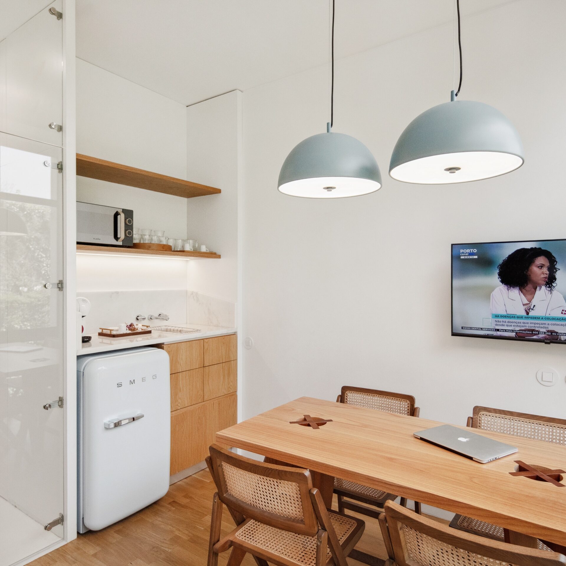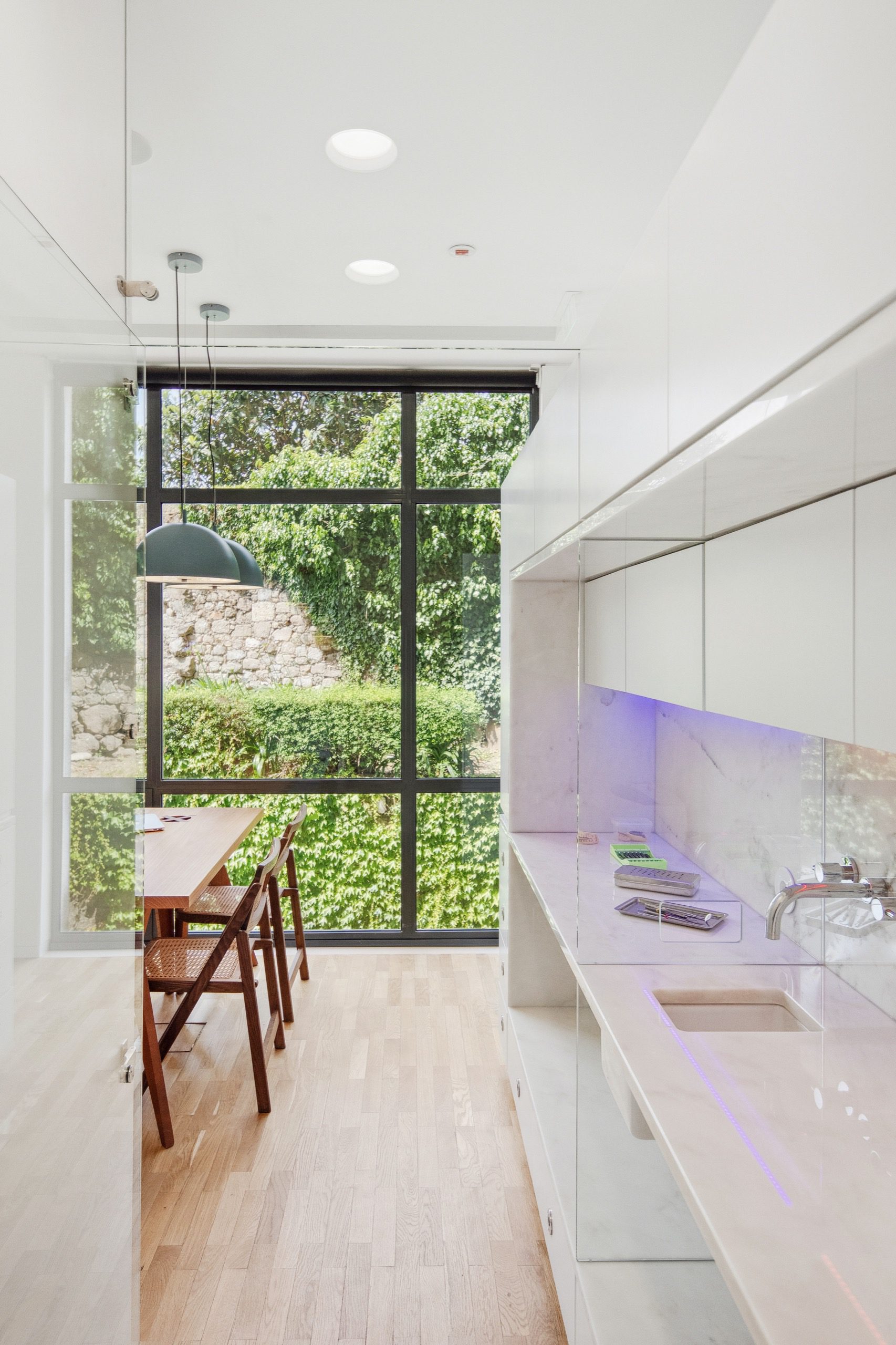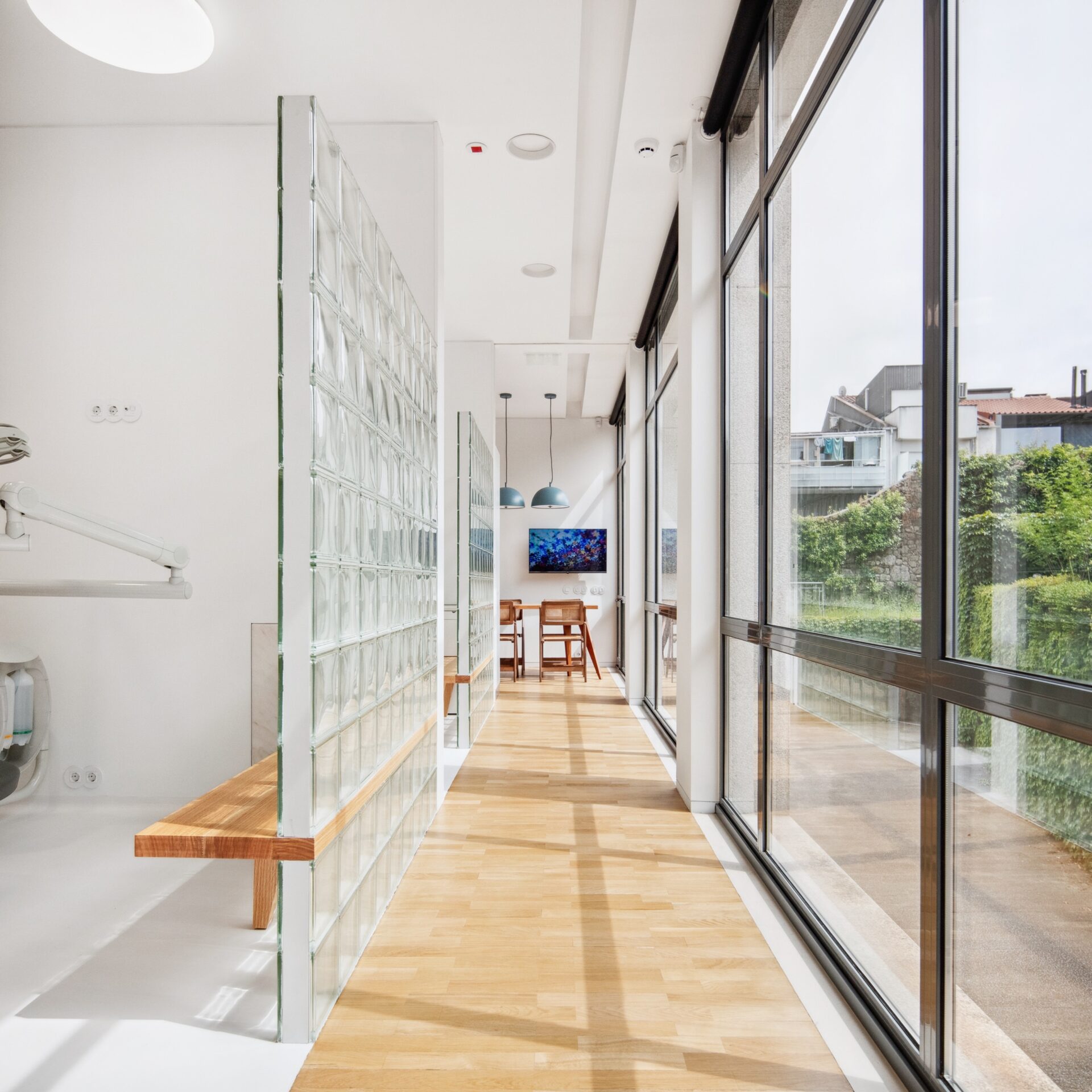 Between the corridor and the treatment rooms, a wall of glass blocks mediates the relationship with the exterior, where the natural greenery unfolds as a therapeutic landscape. It is towards this landscape that the dental chair is oriented, with the inclusion of a discreet bench to accommodate a possible companion.