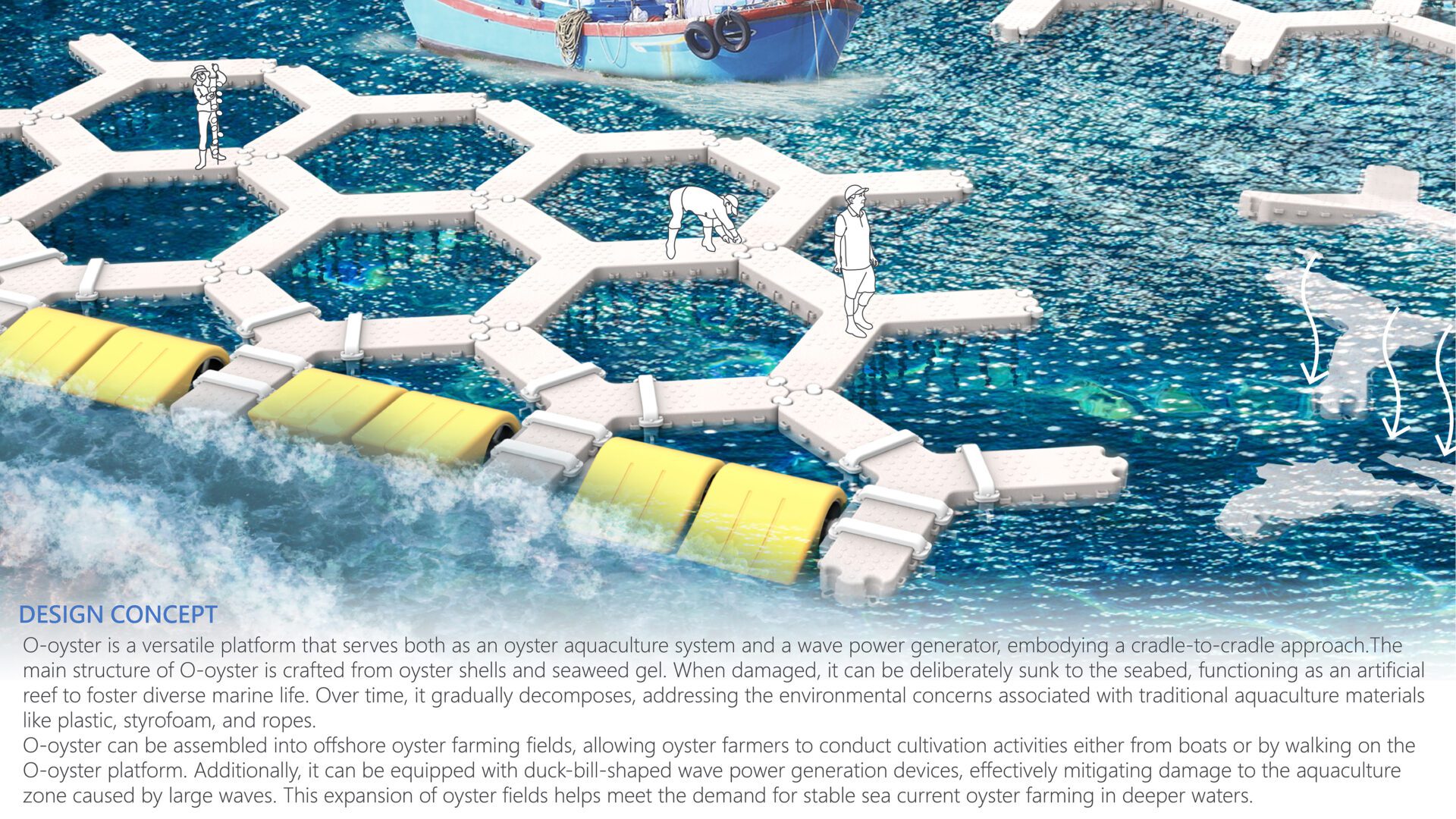 O-oyster is a versatile platform that serves both as an oyster aquaculture system and a wave power generator, embodying a cradle-to-cradle approach.