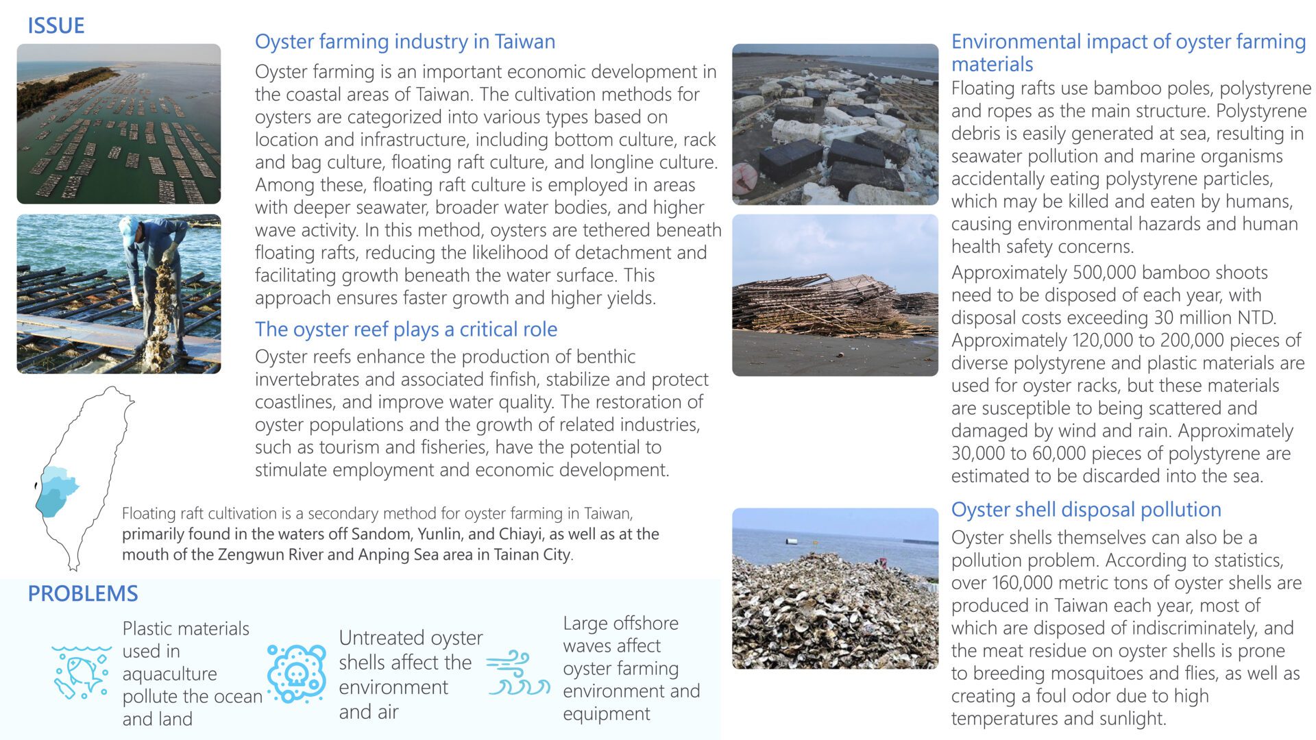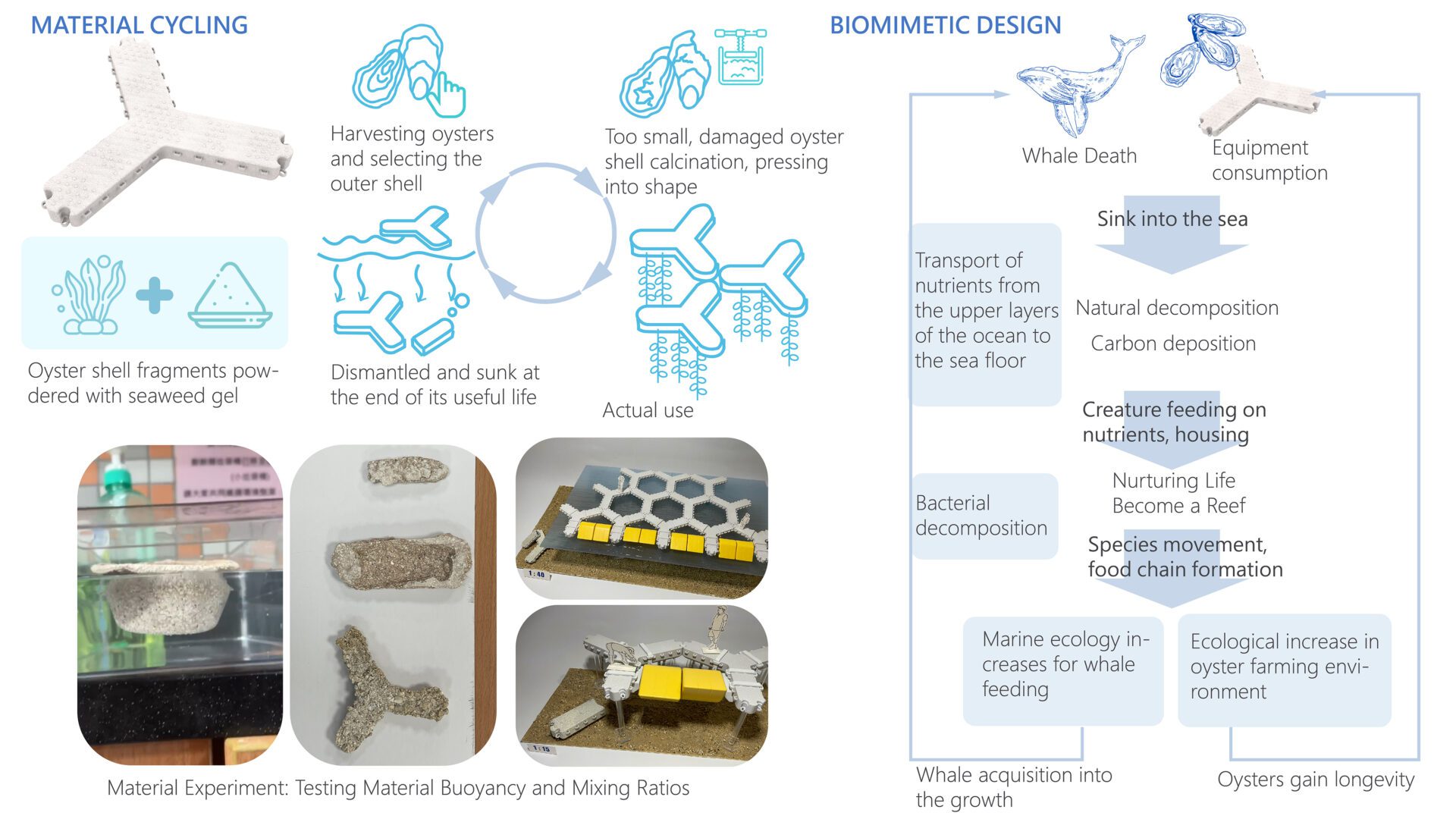 The main structure of O-oyster is crafted from oyster shells and seaweed gel. When damaged, it can be deliberately sunk to the seabed, functioning as an artificial reef to foster diverse marine life. Over time, it gradually decomposes, addressing the environmental concerns associated with traditional aquaculture materials like plastic, styrofoam, and ropes.
