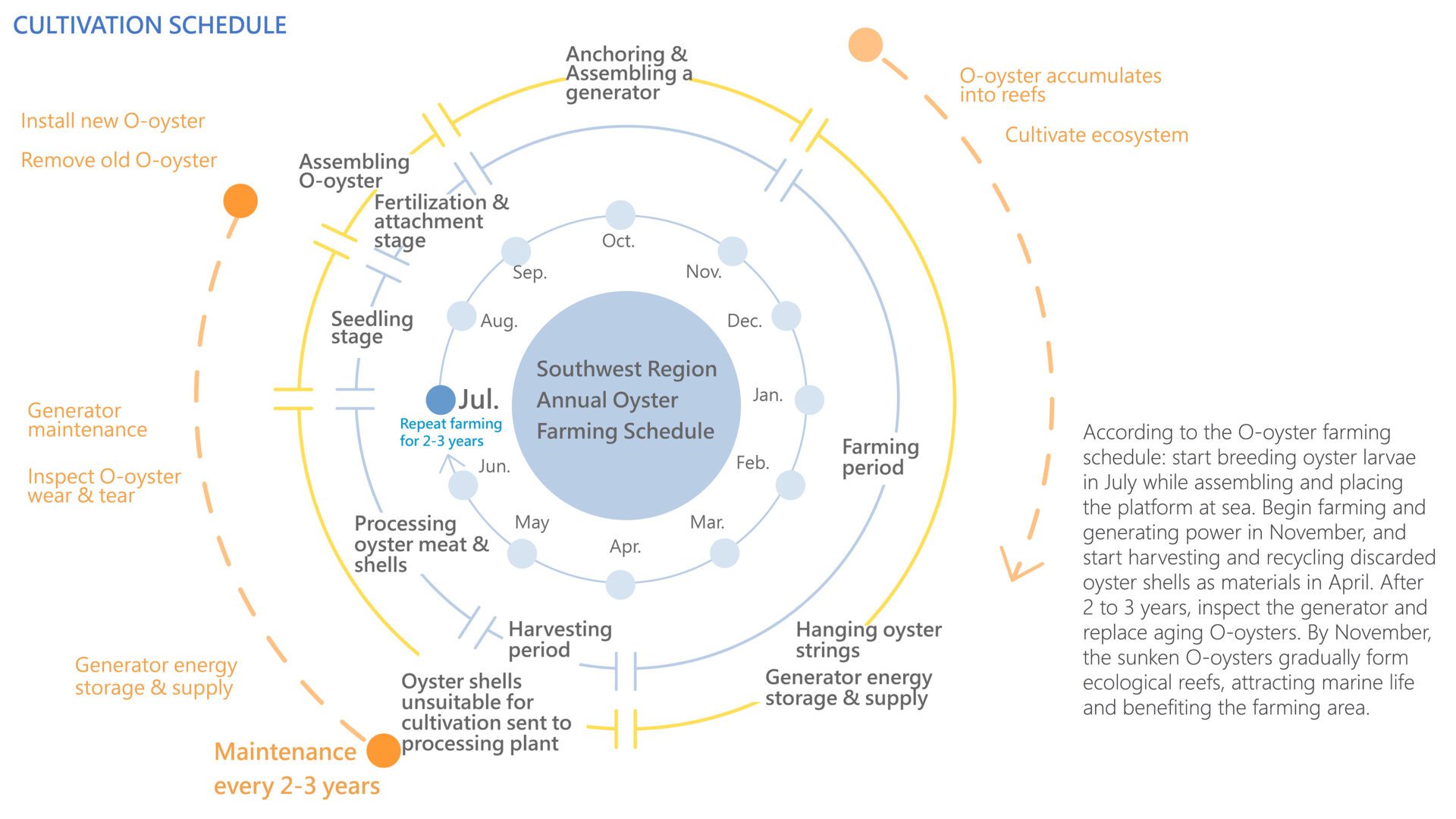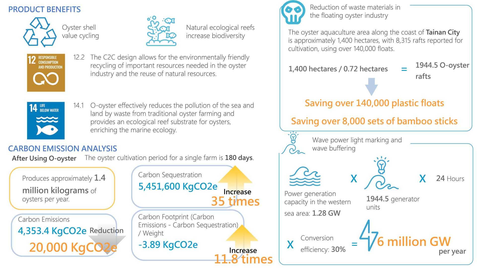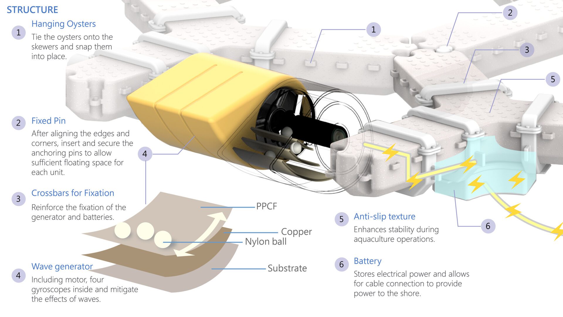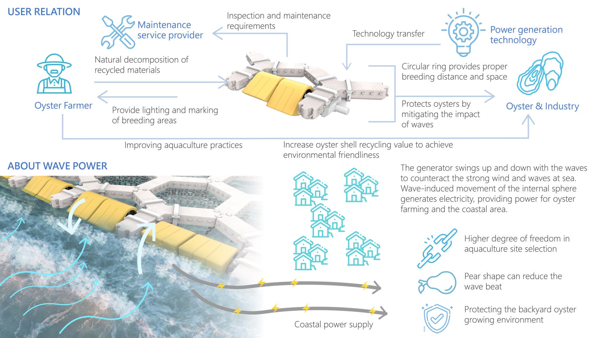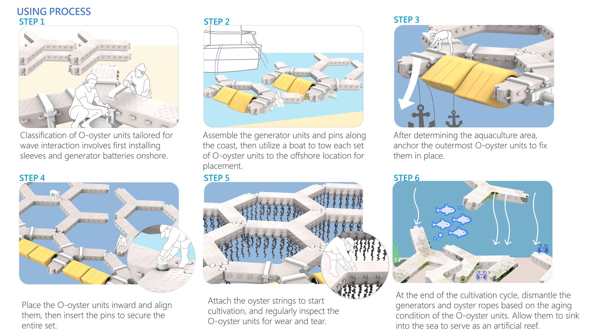 O-oyster can be assembled into offshore oyster farming fields, allowing oyster farmers to conduct cultivation activities either from boats or by walking on the O-oyster platform. Additionally, it can be equipped with duck-bill-shaped wave power generation devices, effectively mitigating damage to the aquaculture zone caused by large waves. This expansion of oyster fields helps meet the demand for stable sea current oyster farming in deeper waters.