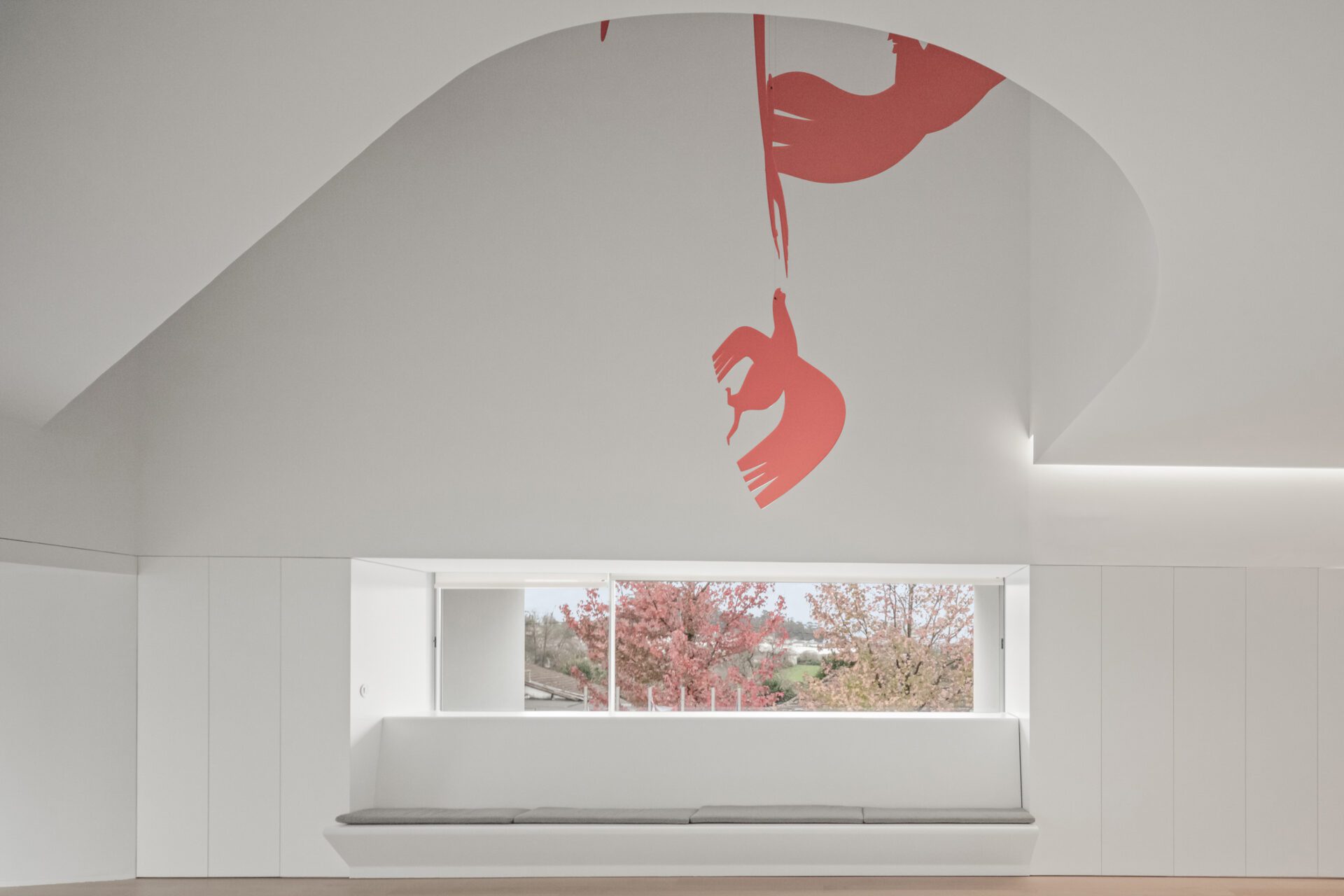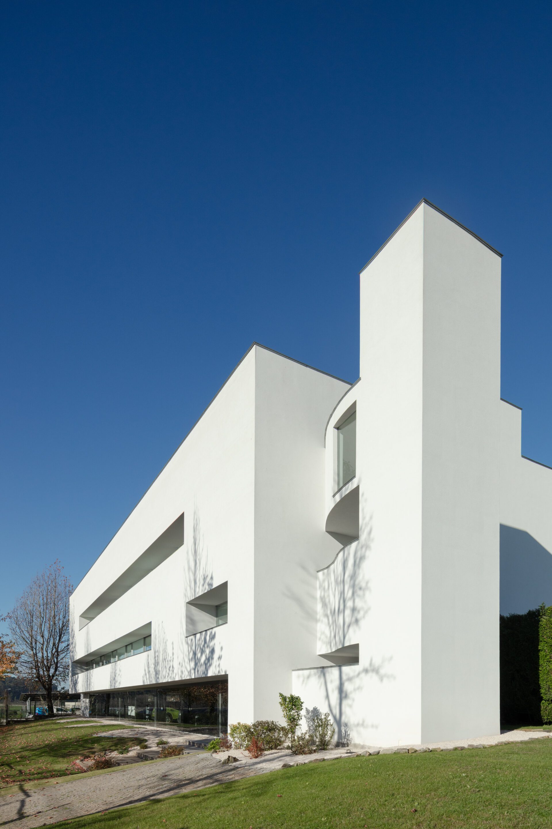The ground floor, occupied by parking, resembled a basement with no light. On the city’s outskirts, people rely on cars. Parking gained the status of reception. We began by treating that reception—the parking area. We eliminated the façade wall and let the light flood the space. We darkened the ceilings and vehicle bays. We announced the corridor with a white walkway, mirrored by a strip of suspended plasterboard ceiling.