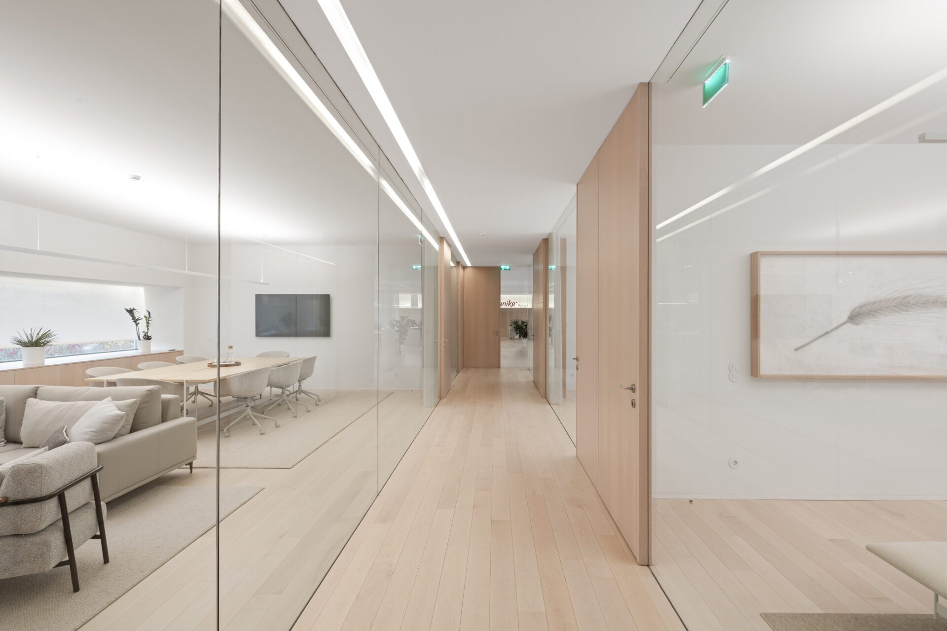 In the social spaces (the upper floors), we used plaster for walls and ceilings (although we proposed acoustic absorption ceilings, this solution was unfortunately not implemented); wood for flooring, doors, and furniture; and glass to divide workspaces from communal areas.