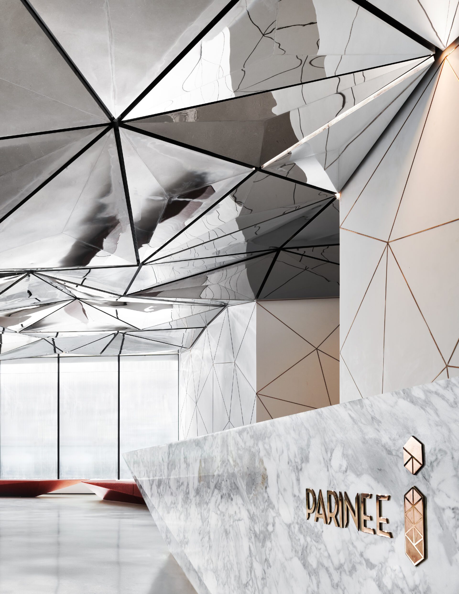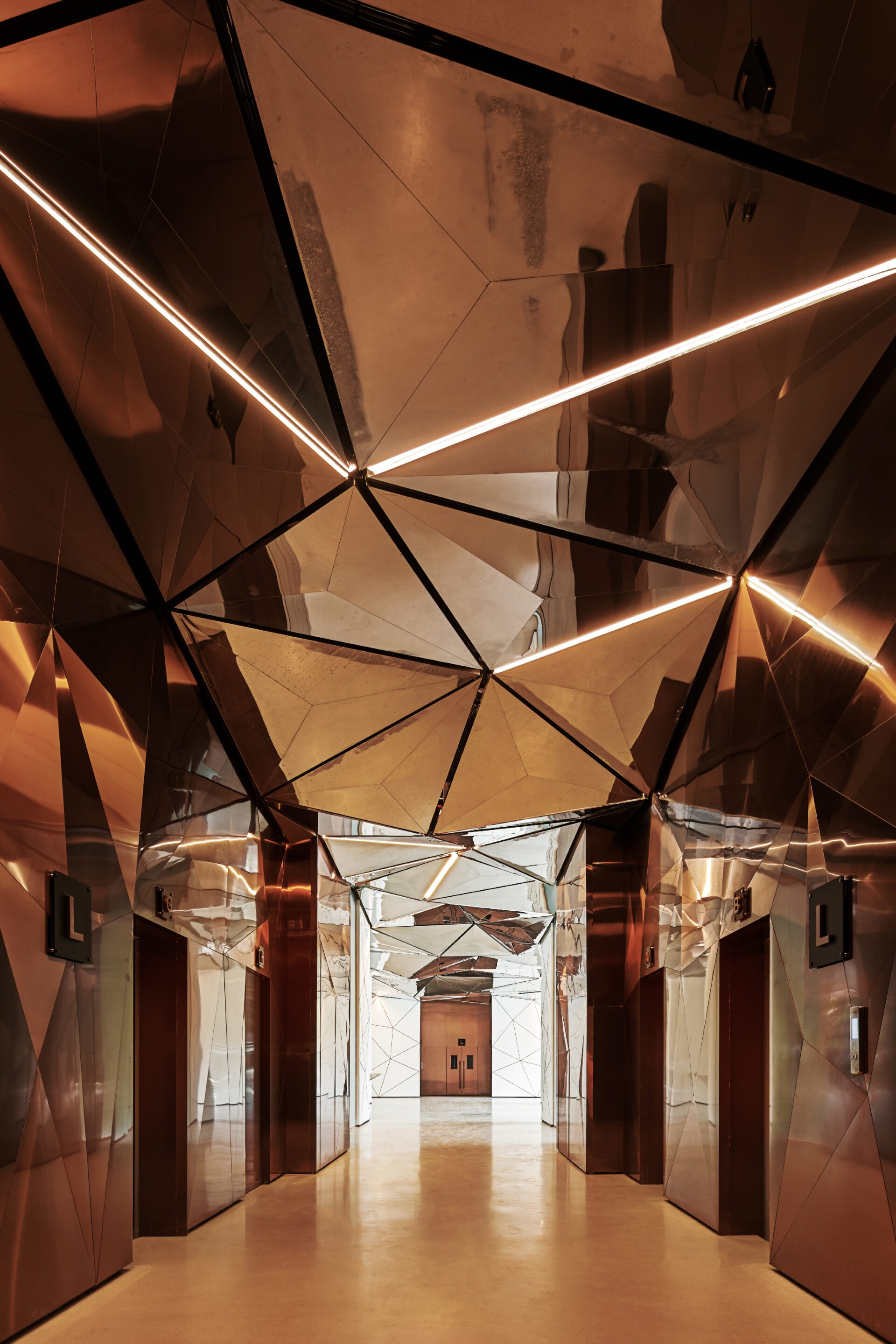 The walls of the lobby echo the triangular motif, with delicate rose-gold inlays that create a subtle yet striking pattern. These lines not only enhance the sense of depth and continuity but also lend a layer of warmth and sophistication to the neutral white palette. Here, the use of rose gold finishes creates a highlighted effect, drawing people in. The flooring, finished in seamless polished concrete, provides a minimalist canvas that balances the complex geometric elements above and around.