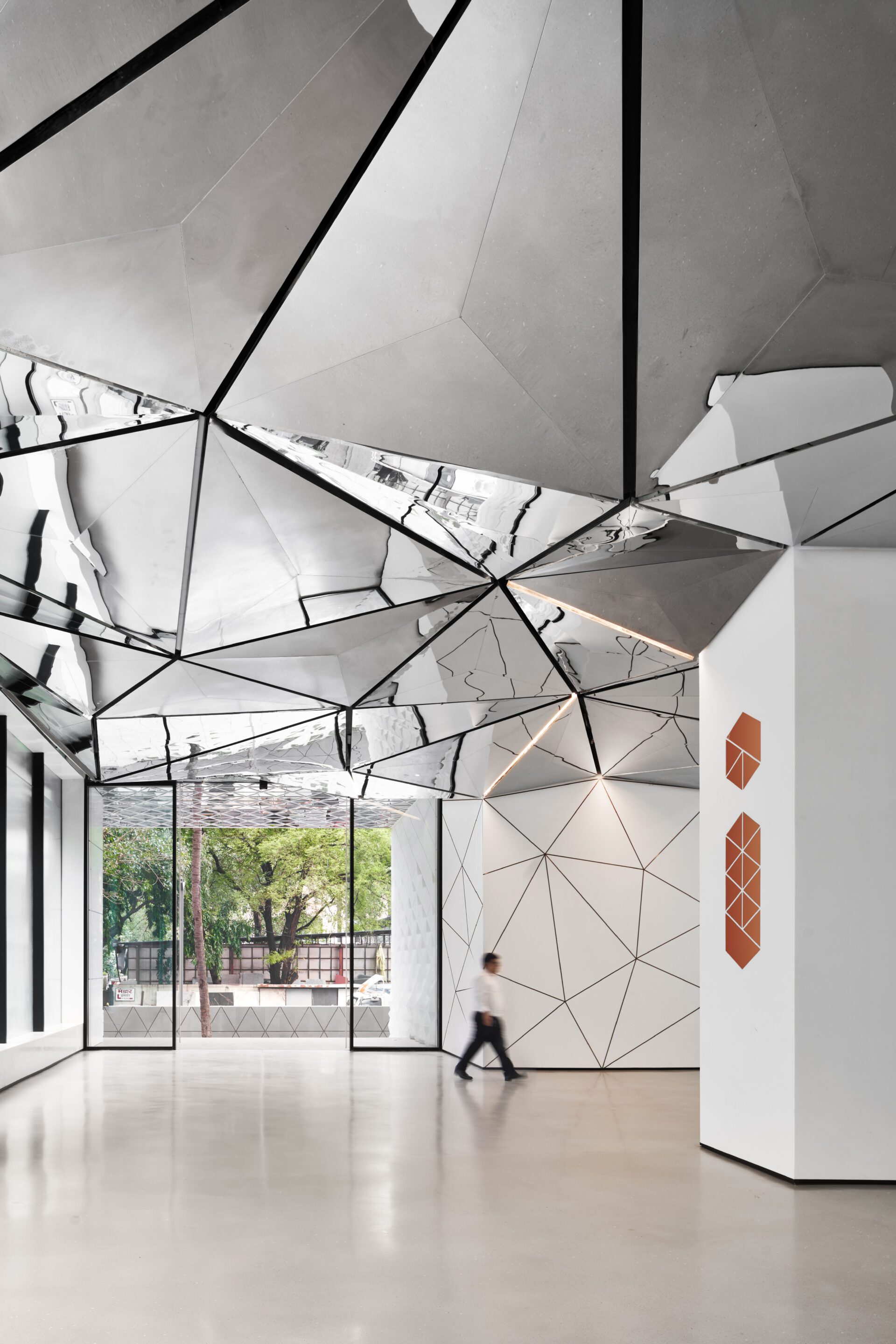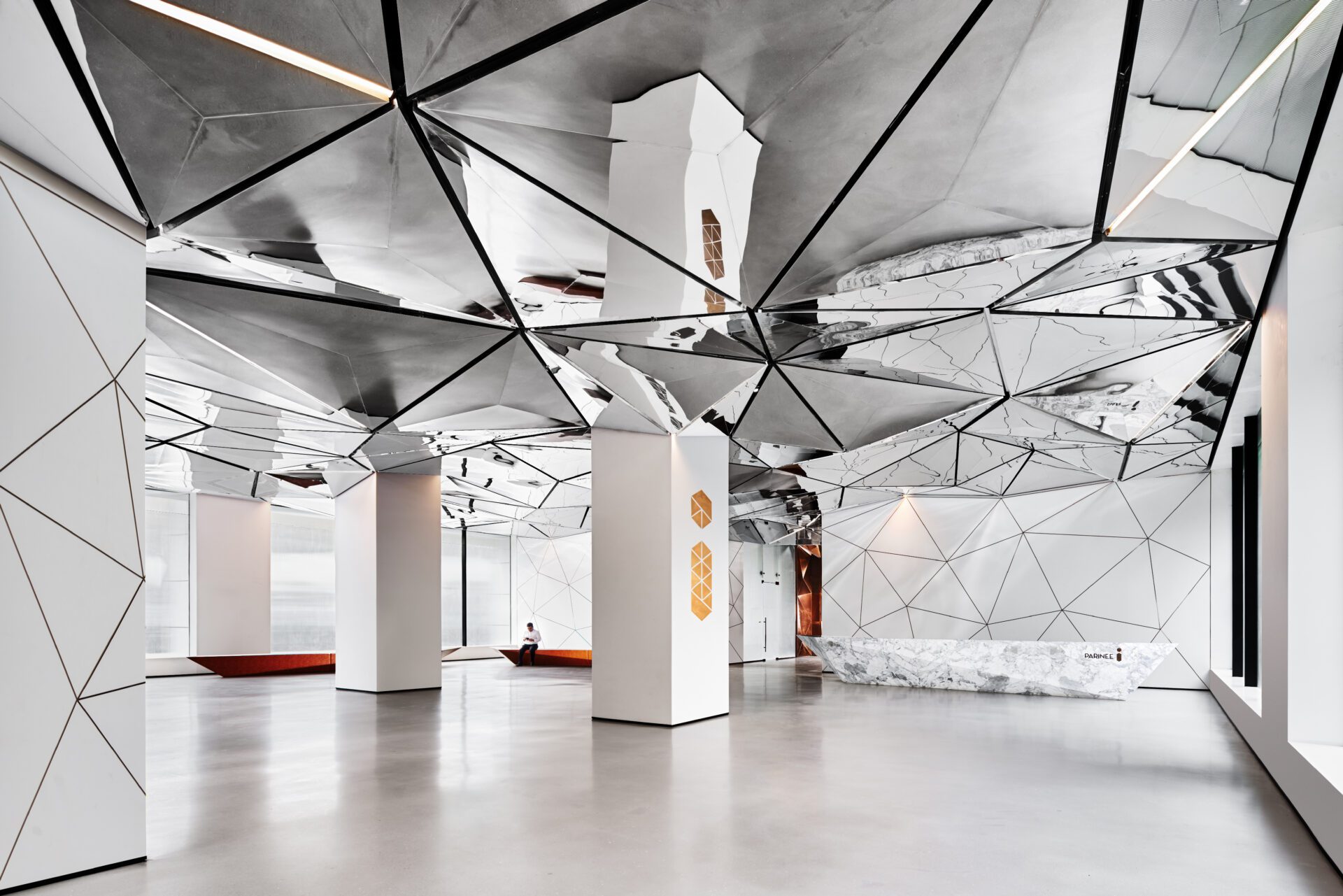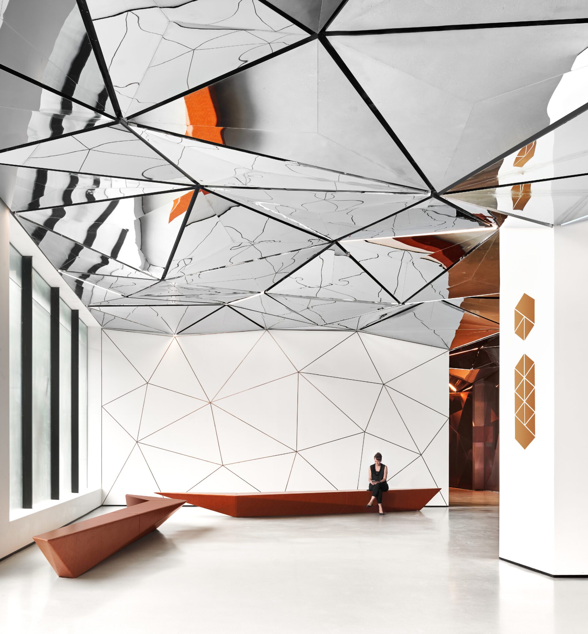 Stepping into the tower’s lobby, visitors are enveloped in a space where geometry and materiality come alive. The focal feature of the interior is the triangulated ceiling design, composed of mirrored stainless steel panels. These dynamic surfaces reflect light and movement, creating a kaleidoscopic effect that transforms the ceiling into an artful, ever-evolving installation. This interplay between reflections and natural light mirrors the exterior’s bold triangulated geometry, ensuring a cohesive architectural language. This mirrored surface not only reflects the architectural language of the façade but also interacts with natural light and movement to create a dynamic and immersive interior experience. The exterior façade reflects colour and the interior ceiling reflects the user, creating an immersive experience.