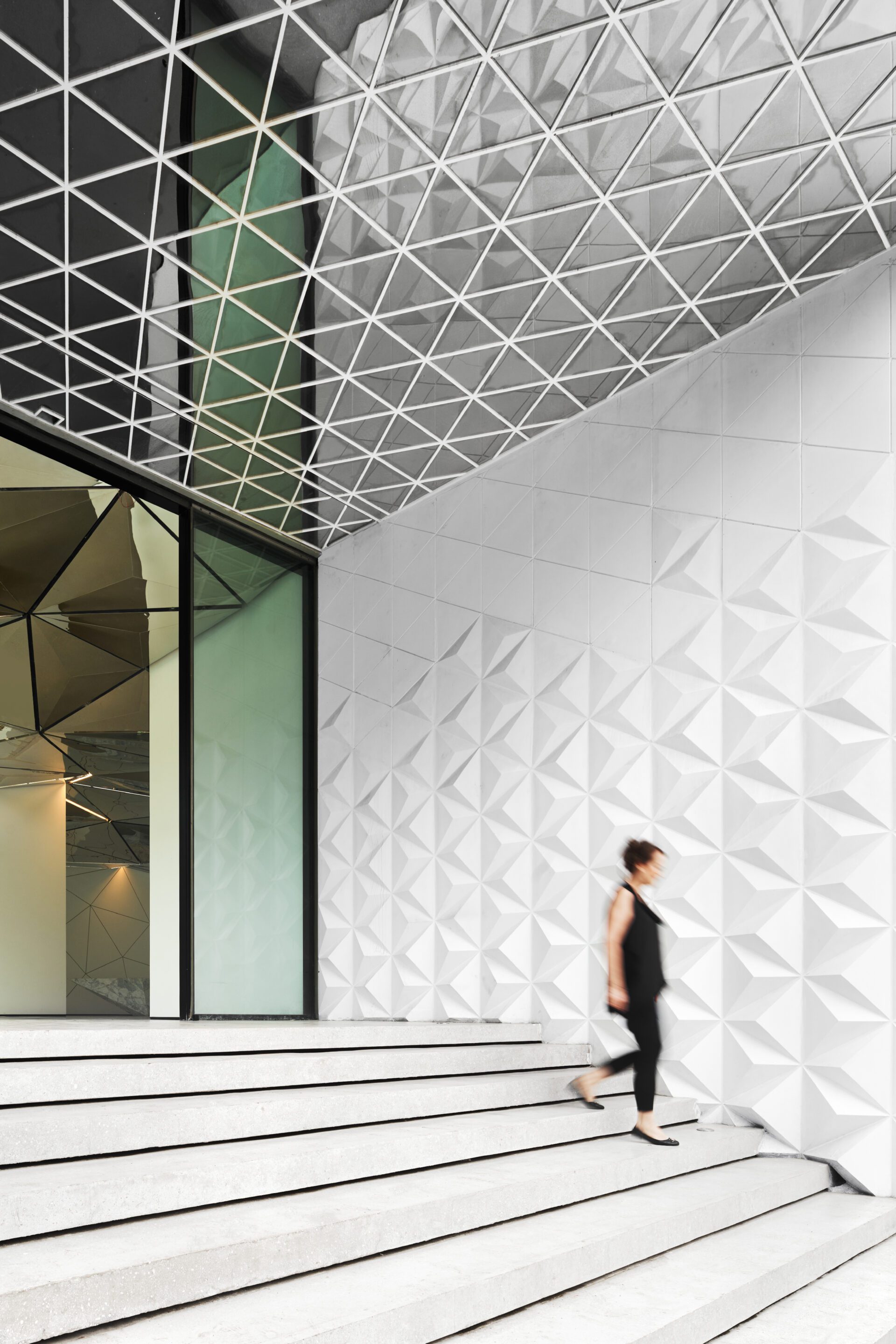 The exterior arrival sequence impresses with a striking geometric canopy and dynamic triangulation at the drop-off flooring and wall. The Drop Off wall facade features white GRC components, adorned with three dimensional triangulation, envelopes the building in a sculptural form, seamlessly blending the lines between exterior and interior.