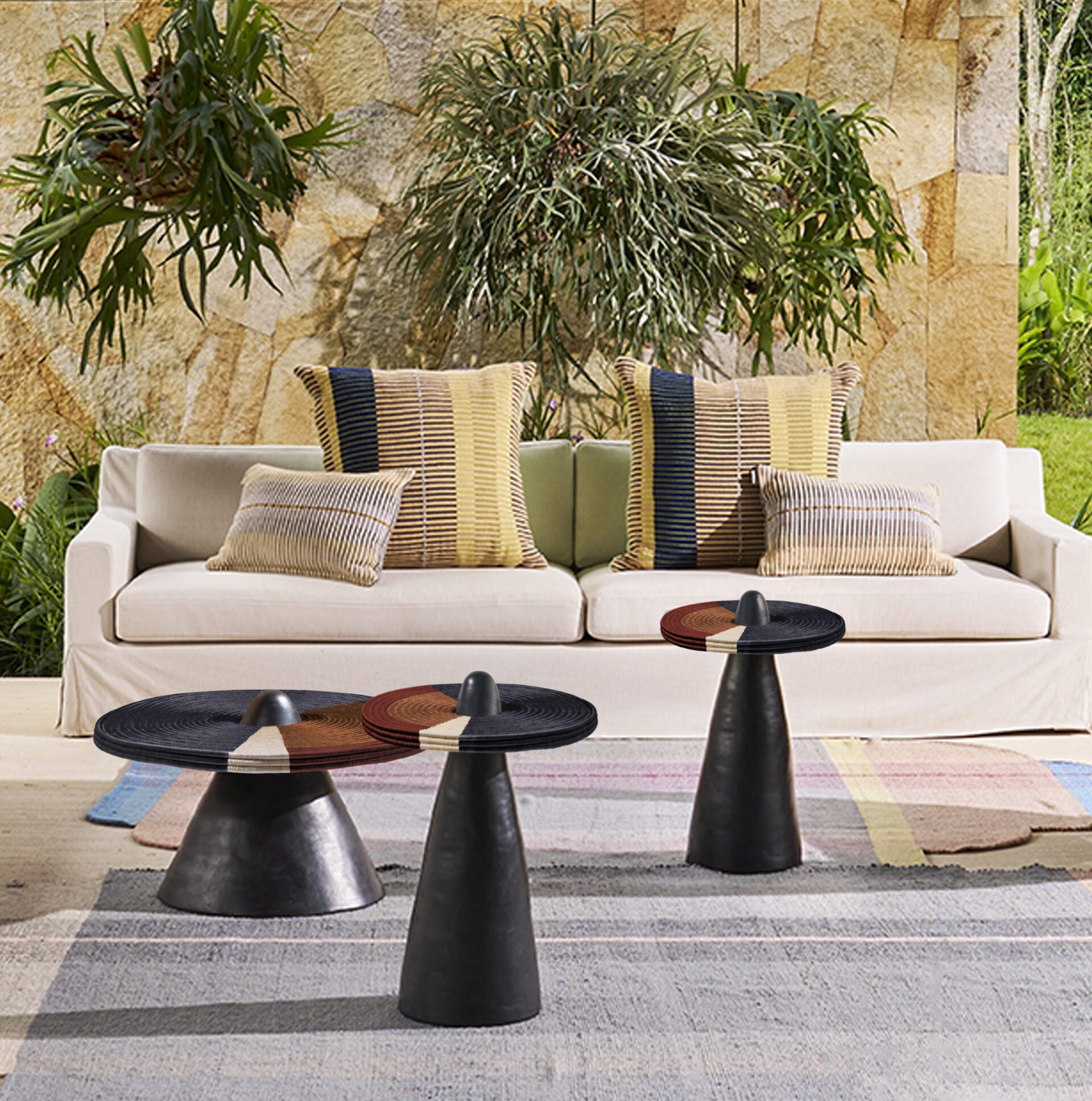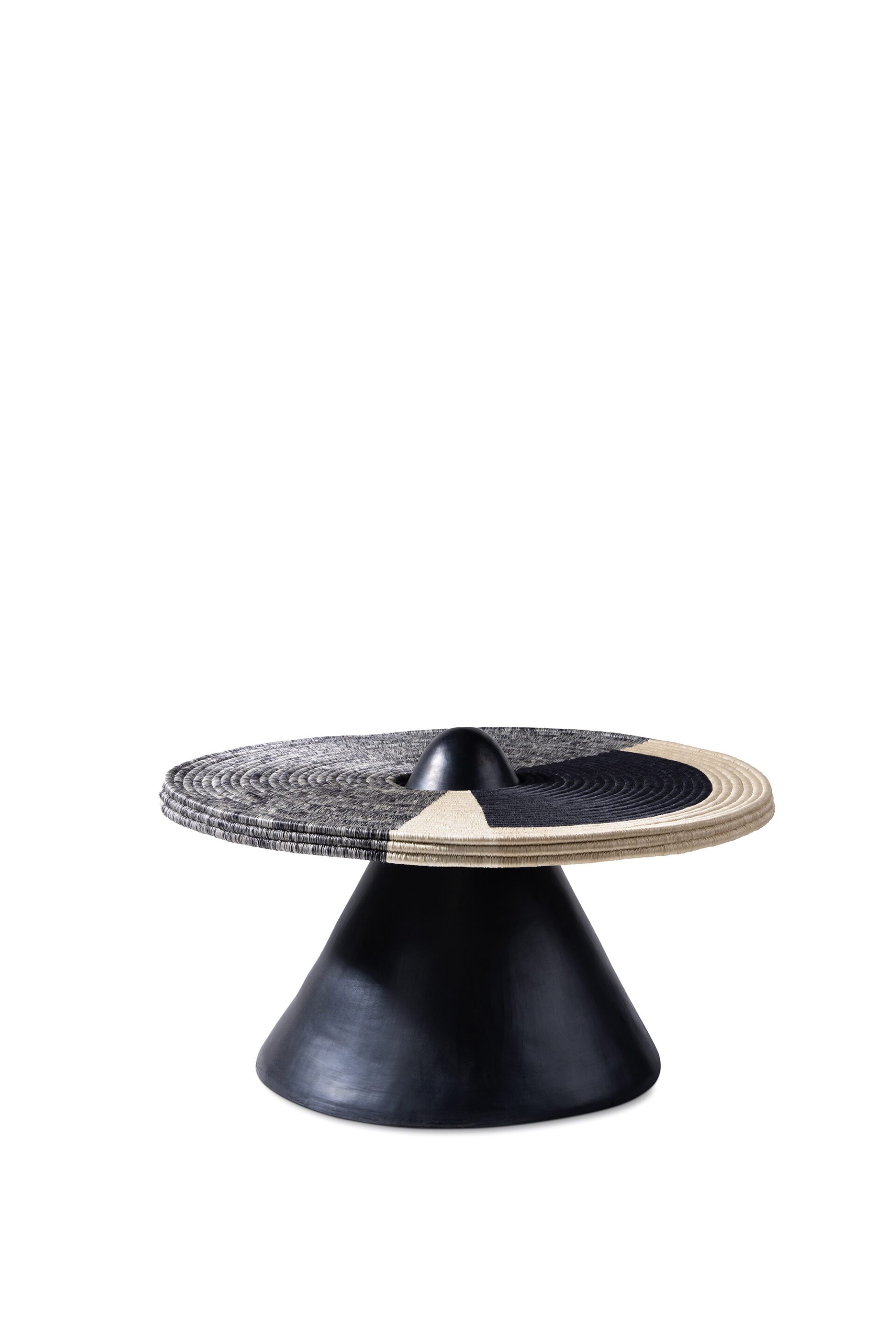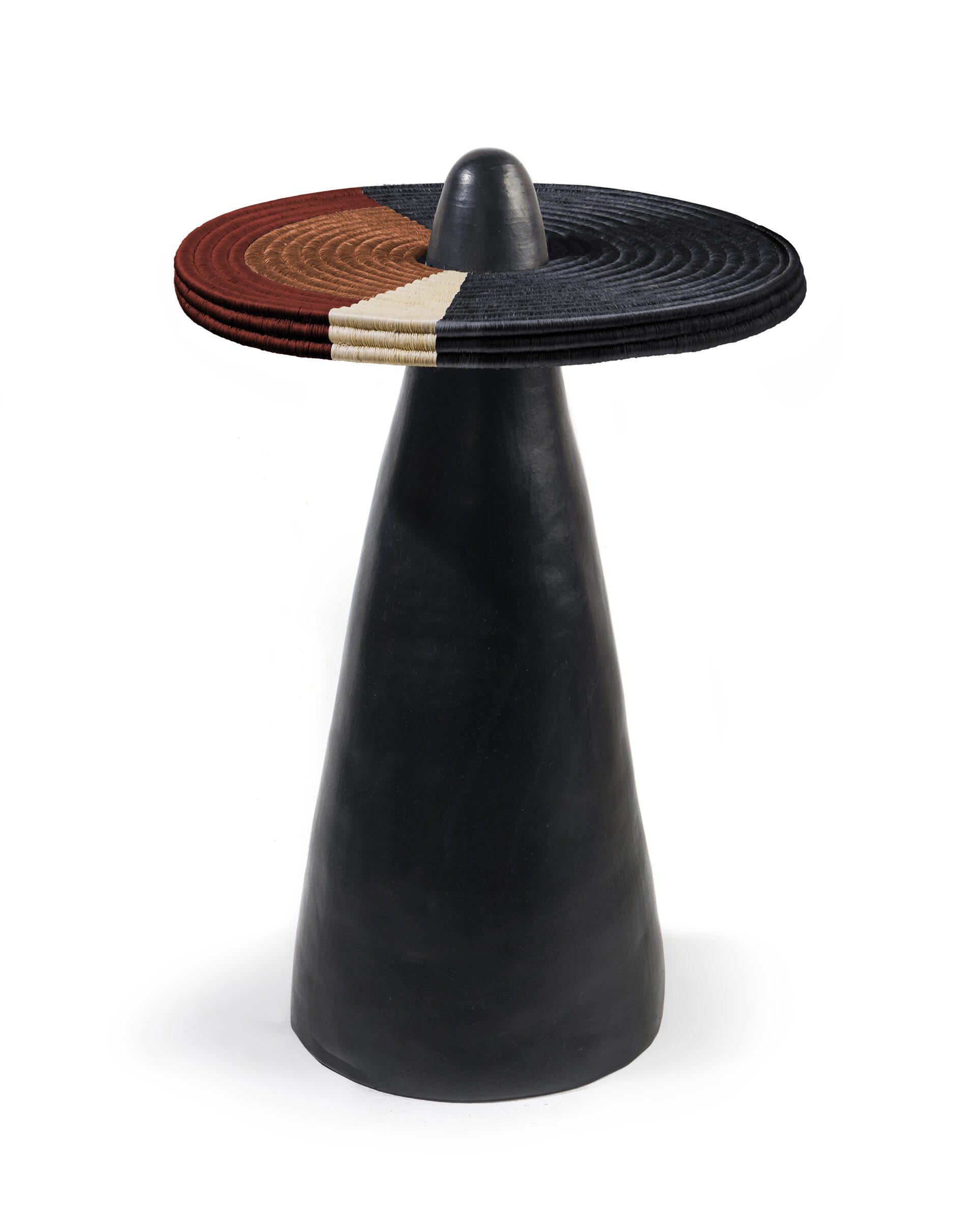 Passed down through generations in Colombia, two distinct and intricate hand-crafted methods come together for the first time in the making of the Picos Collection. The collection features a conical clay base, a design element reminiscent of the Mavecure (Cerros de Mavecure) mountains, and is made from a rich, natural black clay native to the Tolima region. The clay is built up by hand and dried for up to five days before adding the next layer, ensuring durability and a refined aesthetic. The hand-woven tabletops are a masterpiece of traditional (Guacamayas) weaving techniques, crafted from natural (fique/Agave) fibre sourced from the Boyacá region. The distinct colouration is created through the use of natural dyes such as nuts, fruits and plants. This traditional weaving technique not only highlights the skill of local craftspeople but also infuses each piece with a unique narrative of cultural heritage.