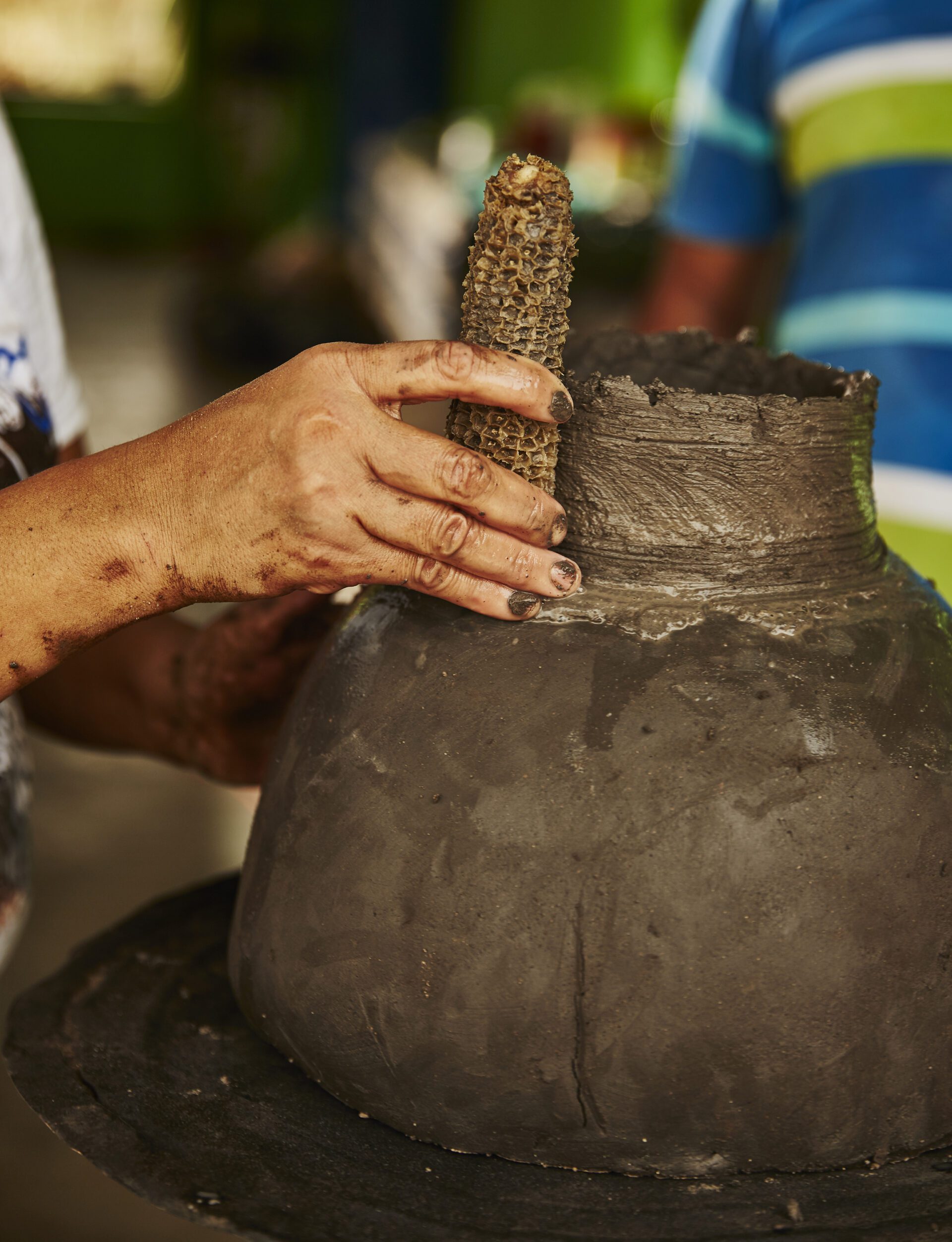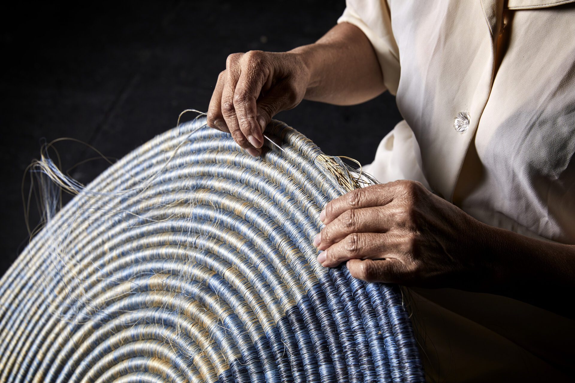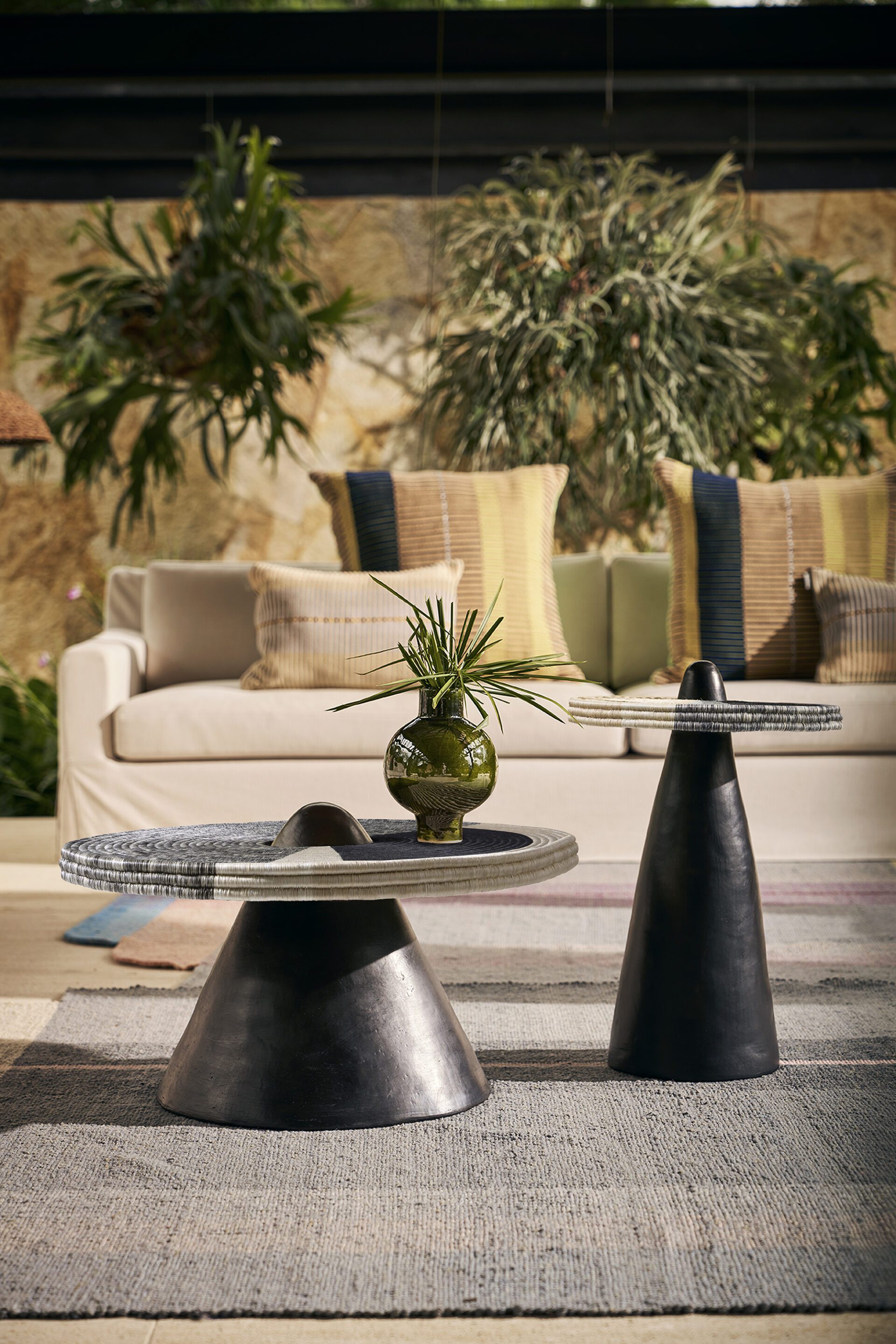 Passed down through generations in Colombia, two distinct and intricate hand-crafted methods come together for the first time in the making of the Picos Collection. The collection features a conical clay base, a design element reminiscent of the Mavecure (Cerros de Mavecure) mountains, and is made from a rich, natural black clay native to the Tolima region. The clay is built up by hand and dried for up to five days before adding the next layer, ensuring durability and a refined aesthetic. The hand-woven tabletops are a masterpiece of traditional (Guacamayas) weaving techniques, crafted from natural (fique/Agave) fibre sourced from the Boyacá region. The distinct colouration is created through the use of natural dyes such as nuts, fruits and plants. This traditional weaving technique not only highlights the skill of local craftspeople but also infuses each piece with a unique narrative of cultural heritage.