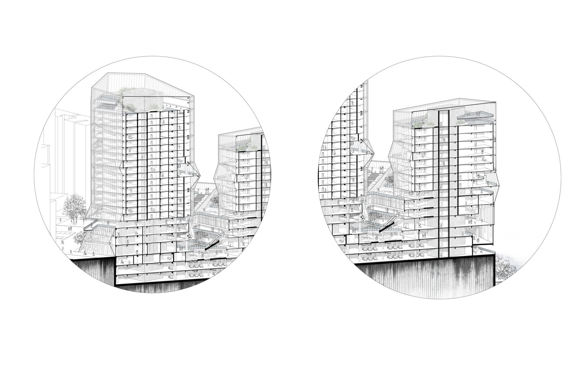 Podium: The lower levels house commercial spaces and a small exhibition hall, structured as four independent volumes linked by an underground atrium, sky corridors, and escalators.