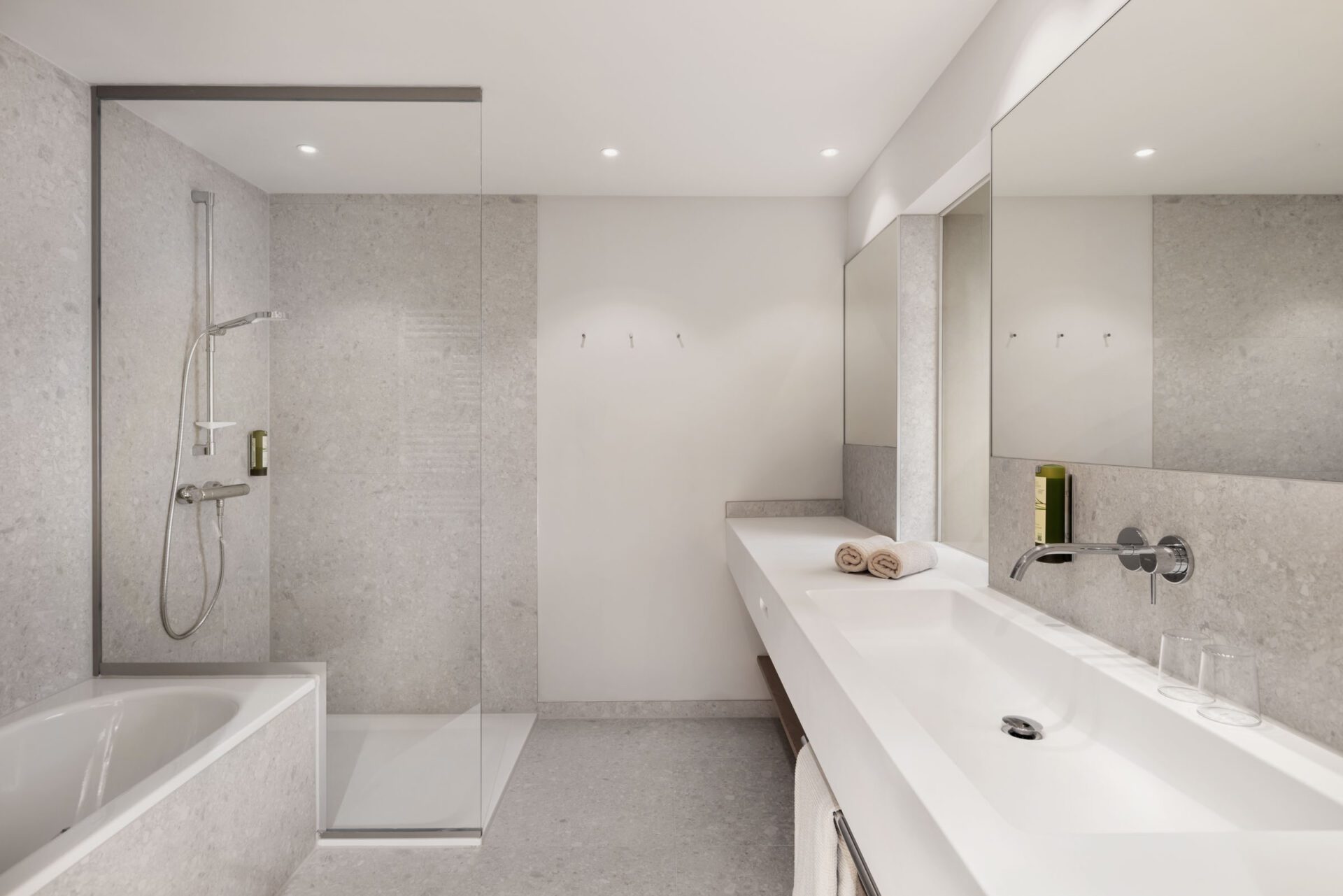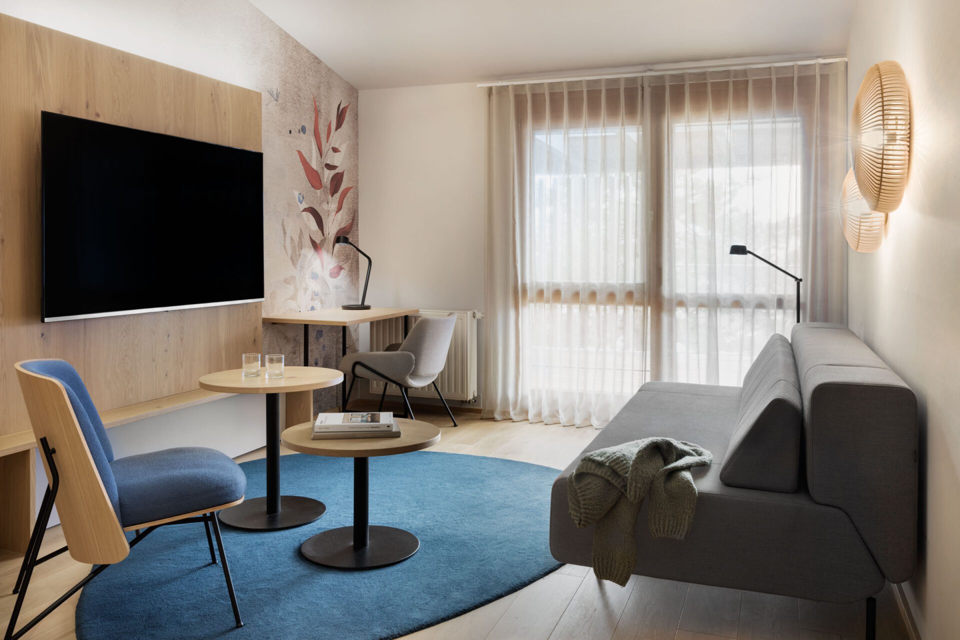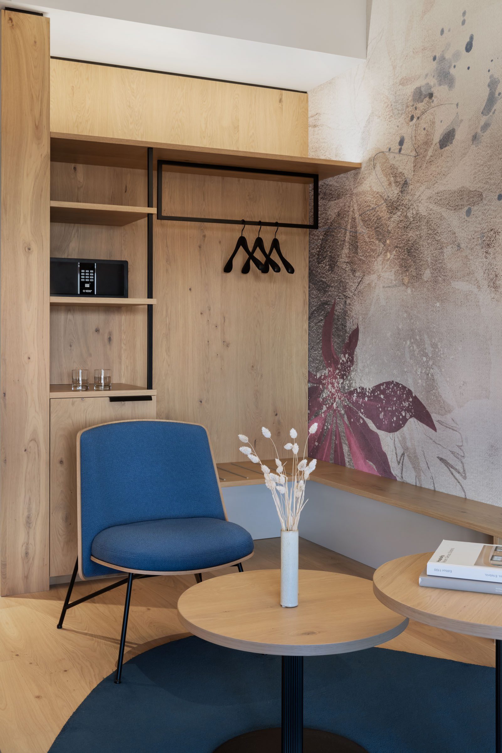 A key focus lies in integrating the surrounding landscape while ensuring a design that appeals to both older and younger guests. Open shelving, expansive windows that invite natural light even into the bathrooms, and a palette of soft earth tones and water-inspired hues define the hotel's new look. Thoughtful functionality meets refined comfort, with premium sleeping systems, cozy lounging and seating niches, and carefully considered details such as walk-in showers and separate restroom areas enhancing accessibility and ease of use.