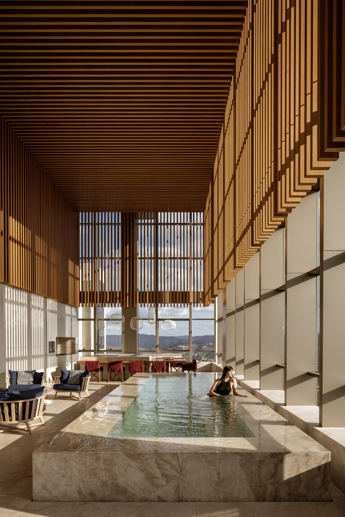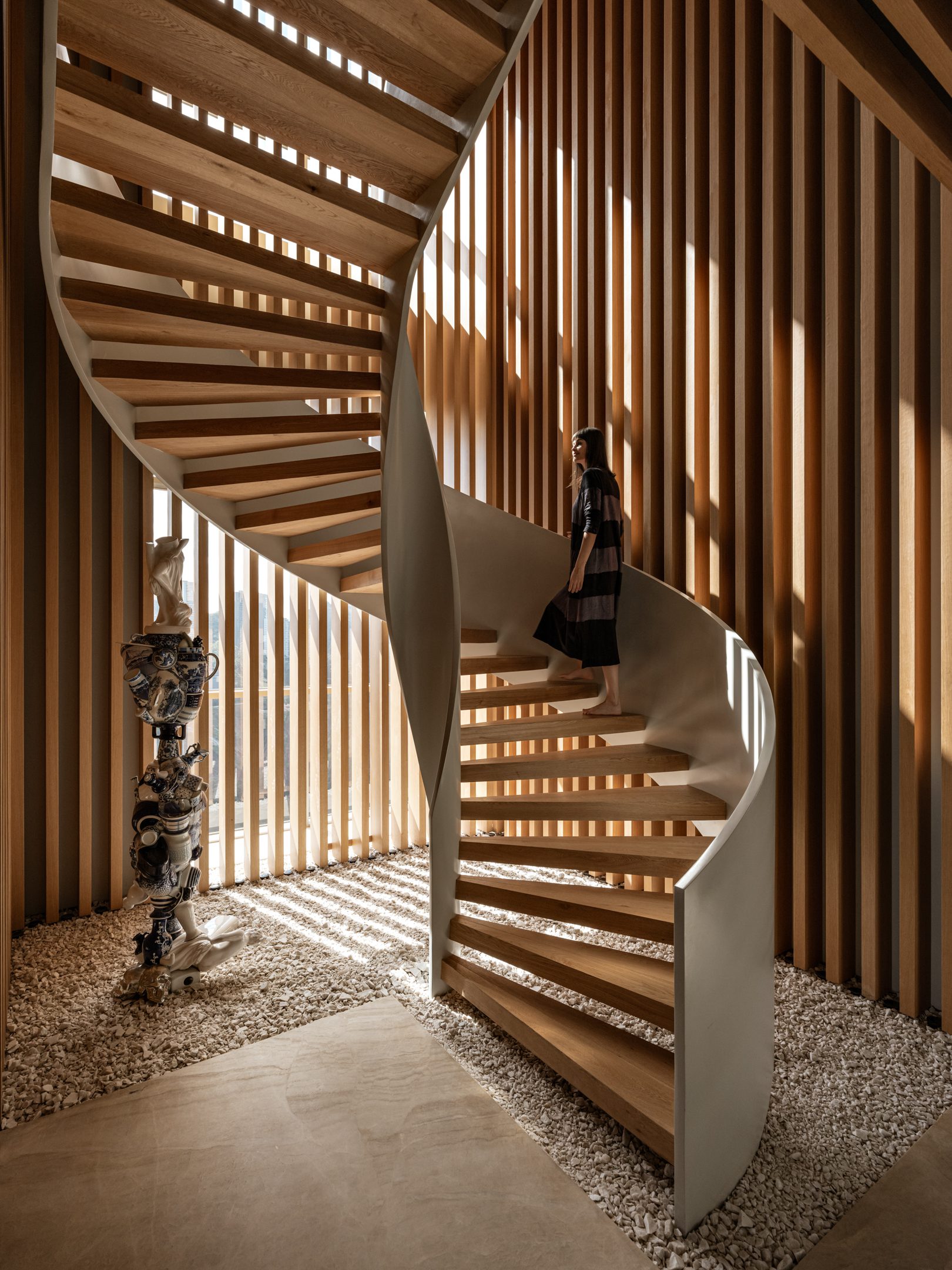 The staircase, one of the central elements of the project, delicately connects the lower floor to the upper floor, covered by wooden brise-soleils on the ceiling and walls. As the light passes through the gaps, rhythmic shadows dance throughout the day, constantly moving.