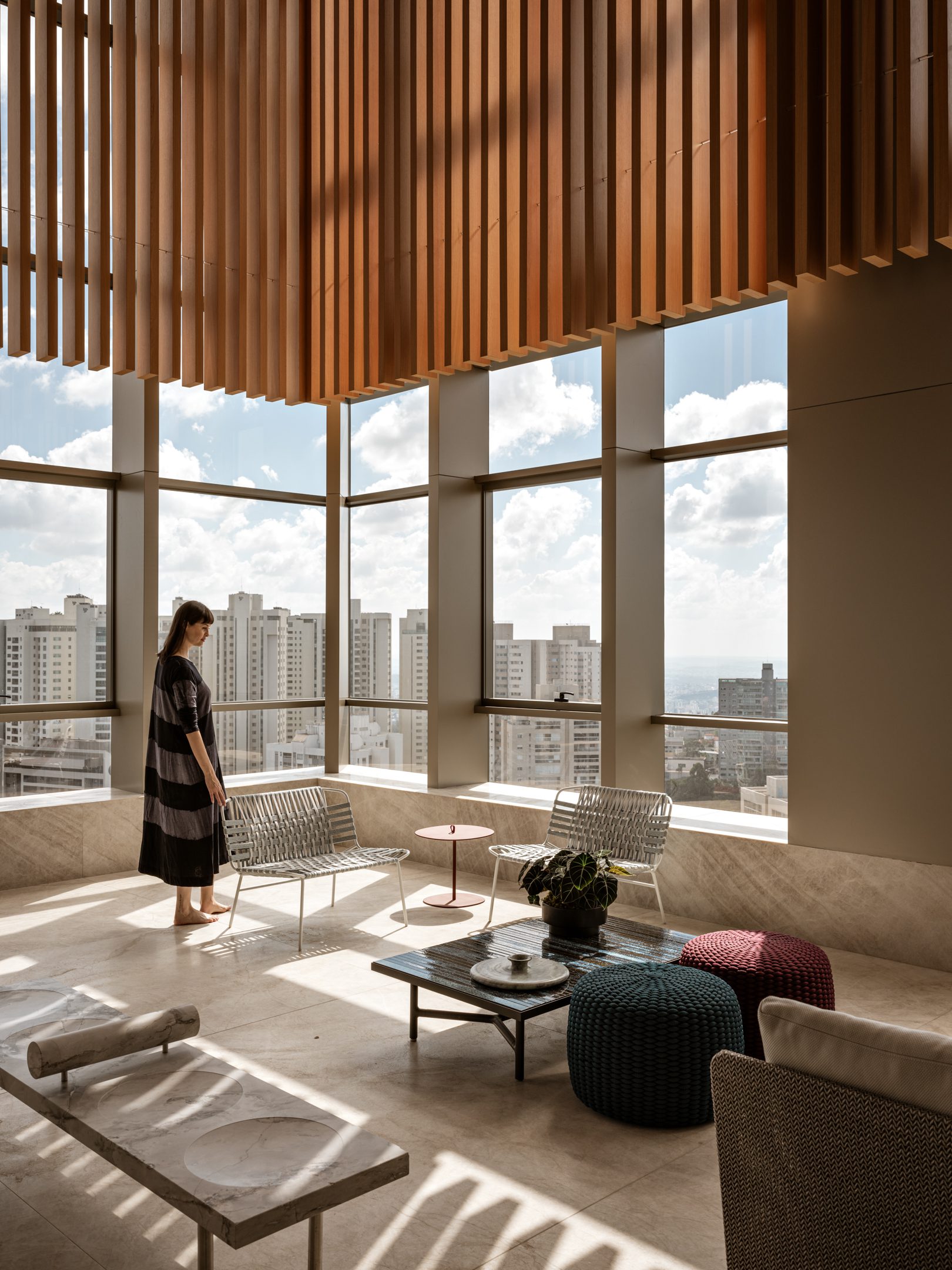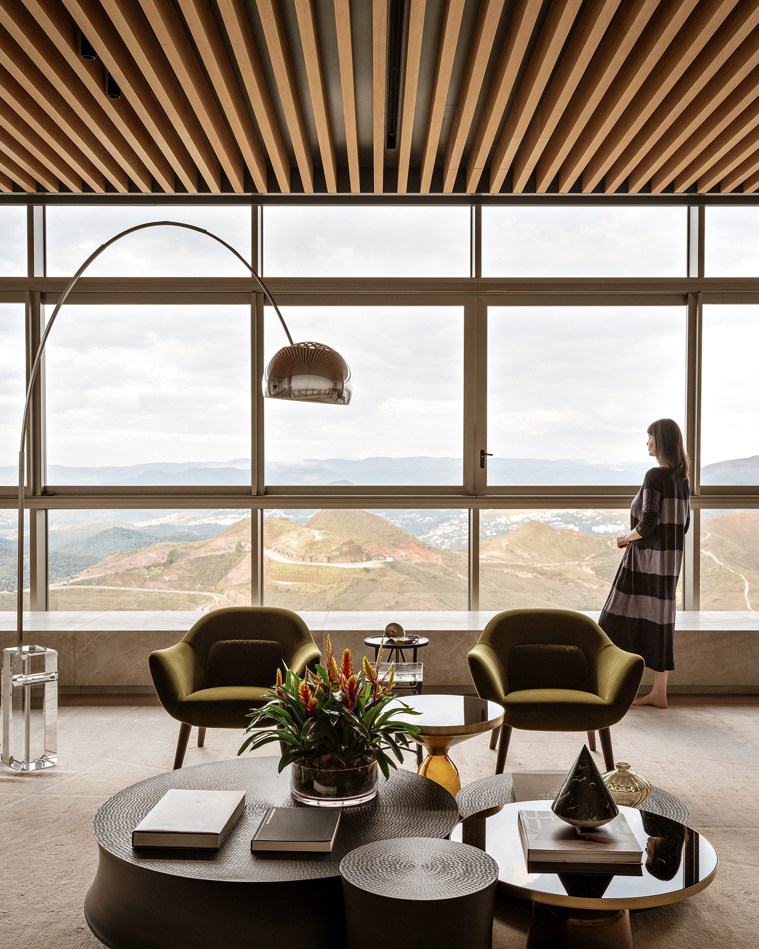 From the highest floor of a building in Nova Lima, in the heart of Minas Gerais, a stunning view unfolds. On one side, the winding mountain region, with its abundant nature. On the other, the city's urban sprawl extending to the horizon. It is in the midst of this landscape, full of natural and artificial elevations, that this penthouse aims to be an oasis for a young couple and their two children.