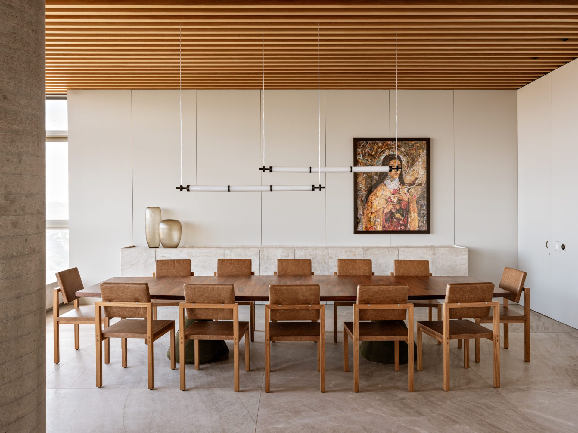 The apartment's program is distributed over its two floors. Access is via the lower floor, where a large tapestry by Norberto Nicola welcomes visitors arriving through the social hall. To the right, an extensive living and dining room integrates with the landscape in the background, framed by long glass windows that run the entire length of the space and compose the scenery. A stone bench follows the entire perimeter of the window.