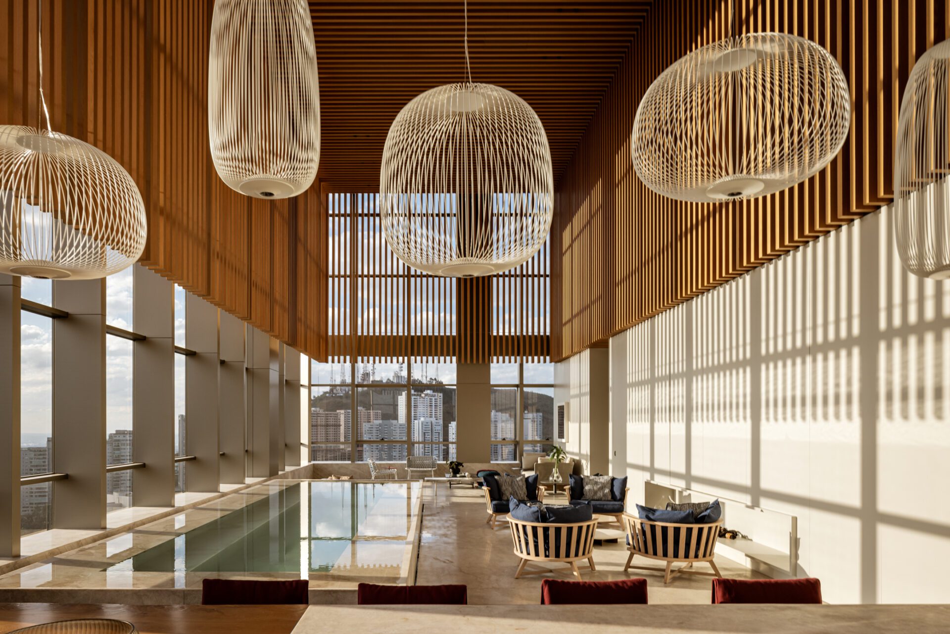On the other side, to the left, a large veranda opens up to an impressive scale, with double height ceilings. Wooden brise-soleils, designed to protect from the solar incidence on the large glass panels of the windows, envelop and compose the space. A swimming pool and a gourmet area extend across the veranda, with the views opening out to the city and the nature beyond. The same brise-soleils that envelop the double height ceiling extend to become the lining that connects all social areas. Gray lacquer panels were used to mimic doors, cabinets and the elevator, creating fluidity and visual consistency throughout the apartment. Also located on this floor are an office, a wine cellar and the kitchen, which connects with the dining room and the gourmet area.