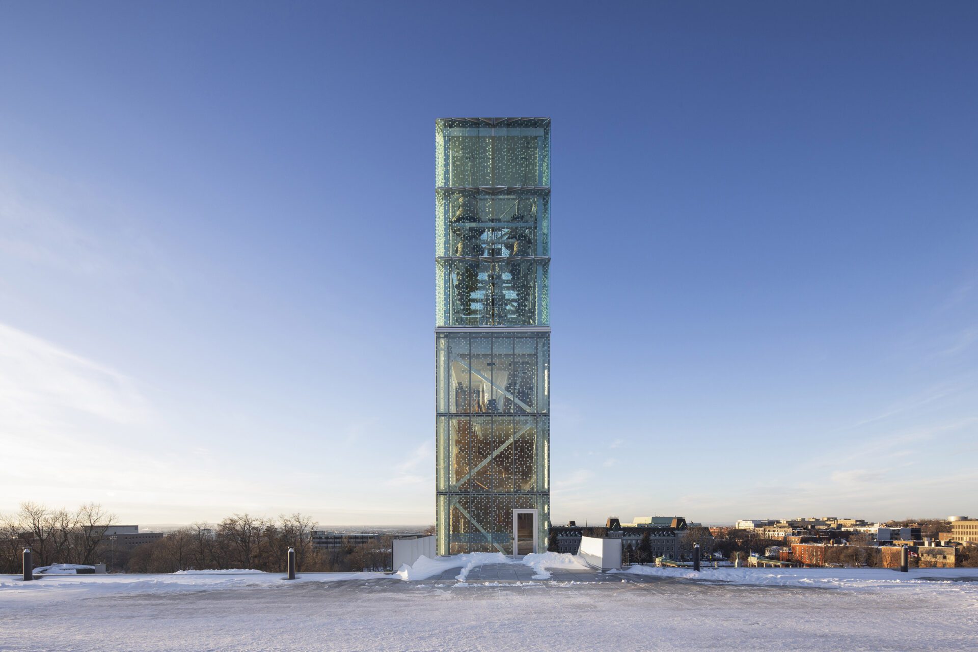 Light and sound are essential elements in this transformation. The bell tower’s skin is made from fritted glass, a translucent veil that scatters sunlight like a moving mosaic. As the carillon plays, the tower’s structure seems to shimmer with sound and shadow. It’s not only something to look at, but something to listen to. The music becomes part of the path, accompanying each step with a sense of rhythm and purpose.